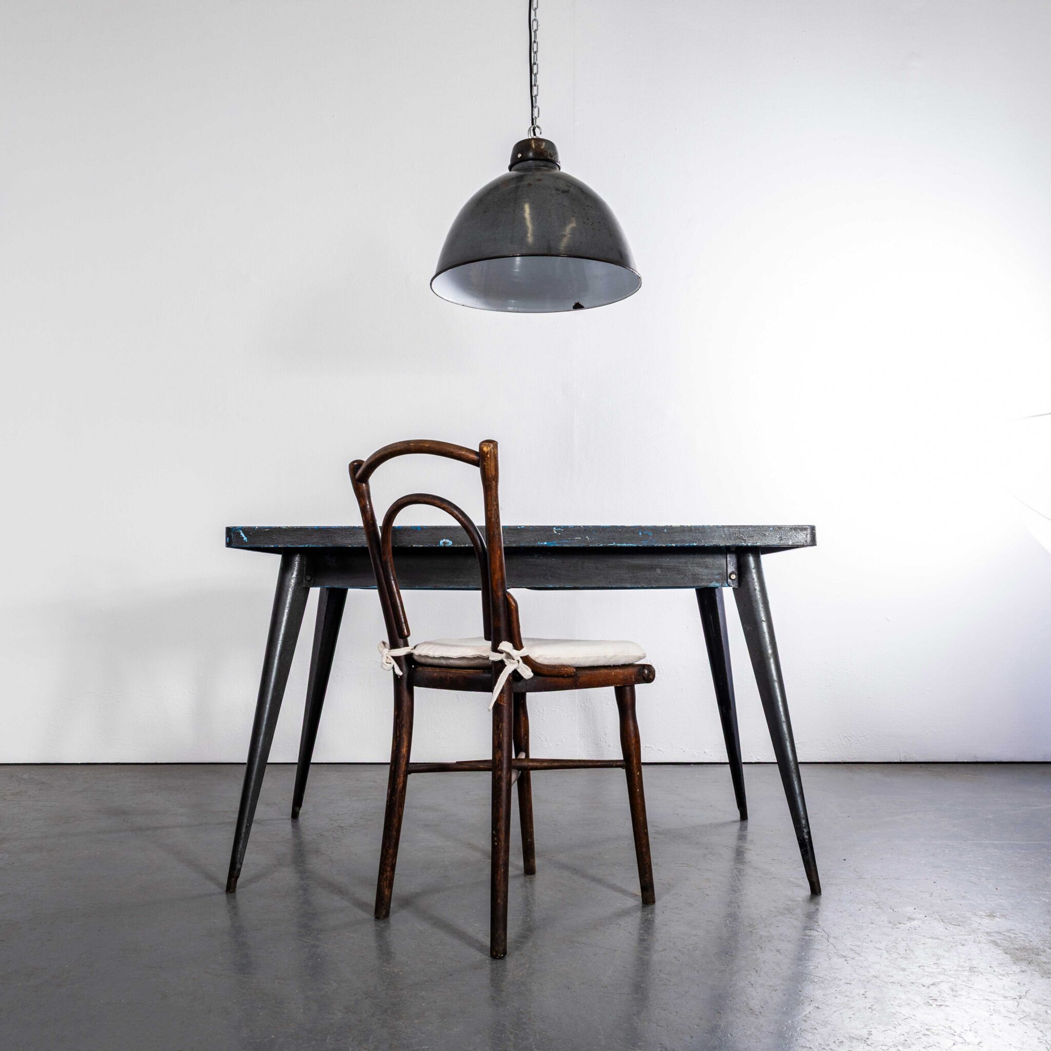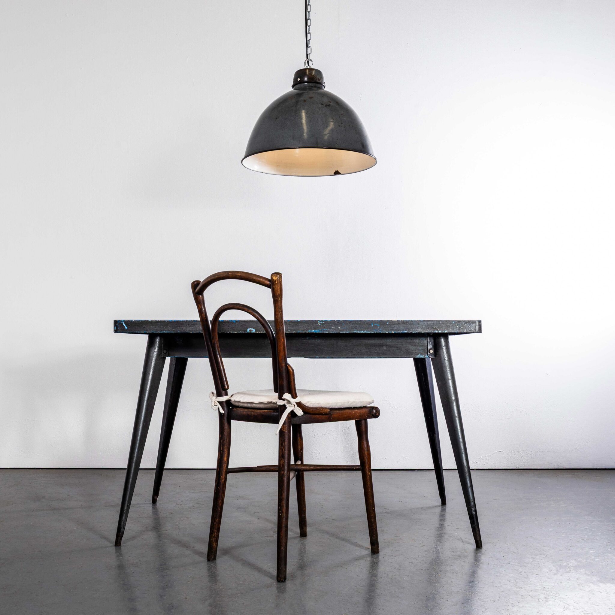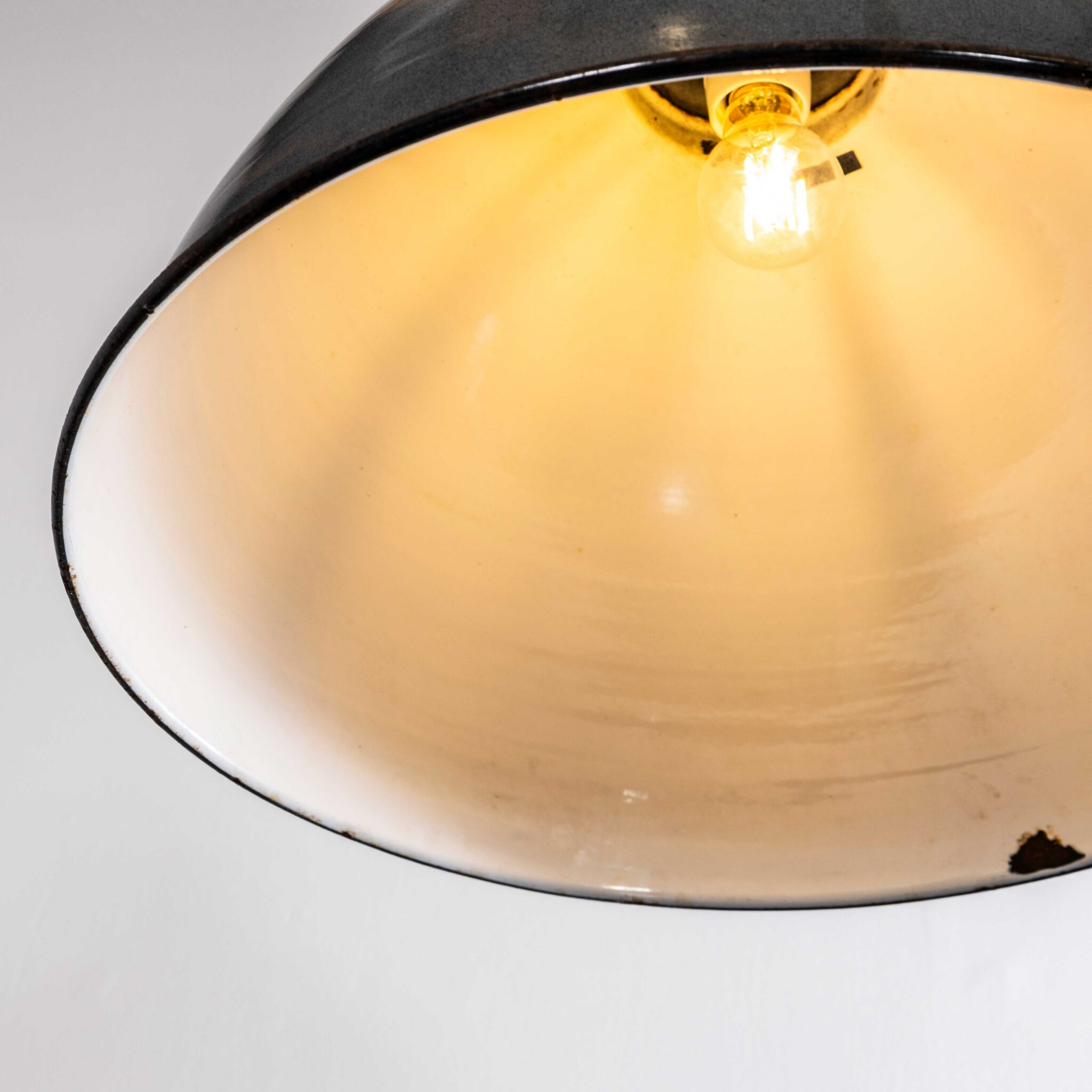 1960’s Large Industrial Graphite Enamel Ceiling Pendant Lamps. A mainstay of many Eastern European factories these lamps feature large enamelled steel shades and metal tops. Each lamp has been cleaned and restored and all electrical components have been removed and replaced with modern European CE standard components to BS EN 60598. Each lamp is individually tested and labelled to BS EN 60598. INCLUDED: Each lamp comes completely wired and ready to install including; 2 metres of zinc coated chain for hanging the lamps, 2 metres of black fabric covered electrical cable and a ceiling hook as shown. The lamp is fitted with a standard E27 threaded lamp holder for which a wide range of modern and vintage style filament bulbs are widely available. We do not currently sell bulbs and recommend LED bulbs 6W maximum. We can supply more than 2 metres of hanging cable, chain etc as required, please contact us separately to discuss. We are specialists in refurbishment of vintage lighting, please contact us with any questions regarding purchase or installation. Listing is for one lamp.