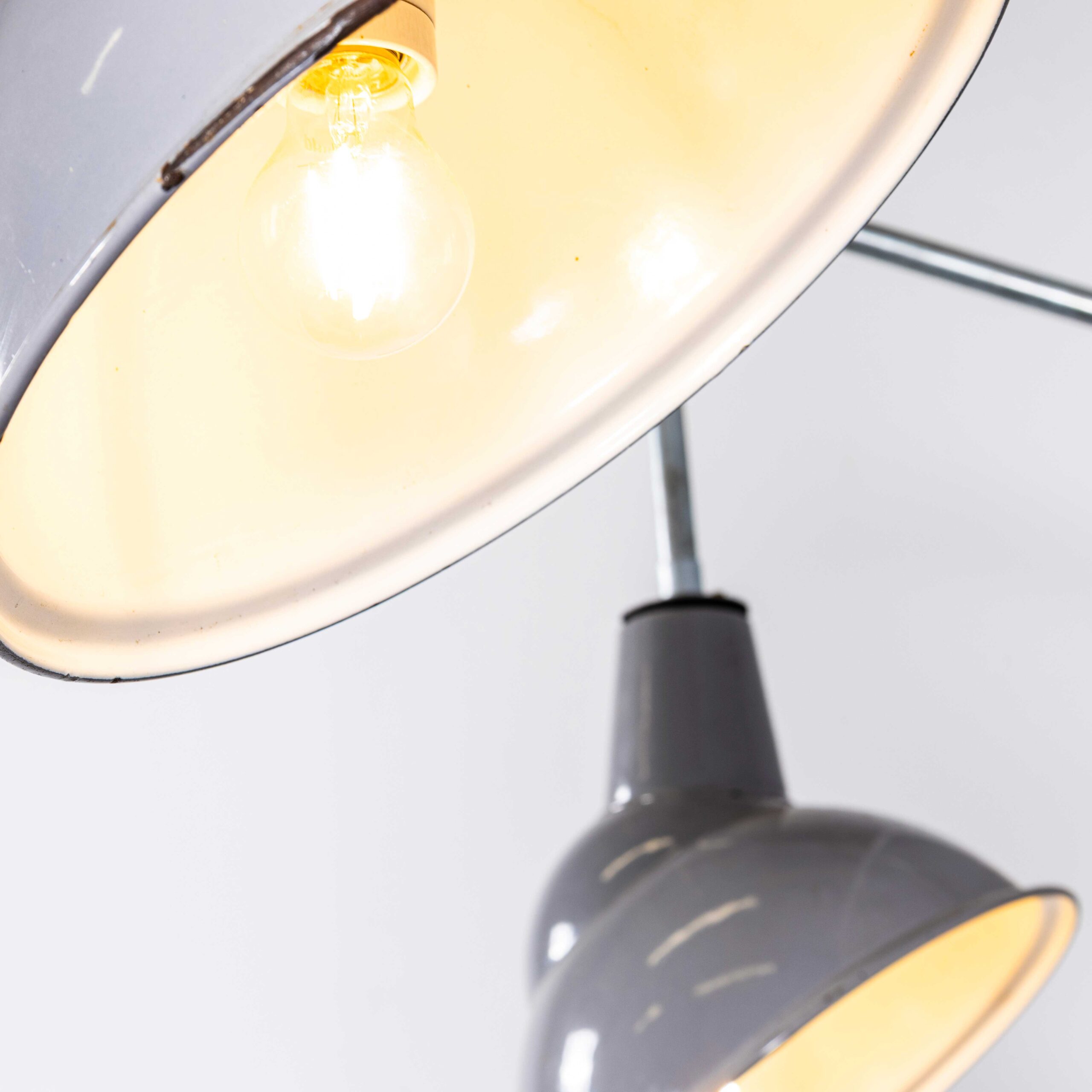 Industrielle graue Benjamin Crysteel-Parabollampen aus den 1950er Jahren – Paar. Angeboten wird ein Lampenpaar. Benjamin war von den 1930er bis in die 1960er Jahre unbestritten Marktführer im Bereich Industriebeleuchtung. Das Unternehmen belieferte vorwiegend große Fabriken mit robusten, emaillierten Lampen. Die Lampen waren mit Farbe, Fett und Schmutz bedeckt, die entfernt wurden, um Lampen in außergewöhnlich gutem Originalzustand freizulegen. Jede Lampe wurde gereinigt und restauriert, und alle elektrischen Komponenten wurden durch moderne, CE-konforme Komponenten gemäß BS EN 60598 ersetzt. Jede Lampe wurde einzeln geprüft und gemäß BS EN 60598 gekennzeichnet. Lieferumfang: Jede Lampe ist komplett verkabelt und sofort einsatzbereit. Die Lampen sind mit einer Standard-E27-Fassung ausgestattet, für die eine große Auswahl an modernen und Vintage-Glühlampen erhältlich ist. Wir verkaufen derzeit keine Glühbirnen und empfehlen LED-Lampen mit maximal 6 W. Wir sind Spezialisten für die Restaurierung von Vintage-Beleuchtung. Kontaktieren Sie uns gerne bei Fragen zum Kauf oder zur Installation.