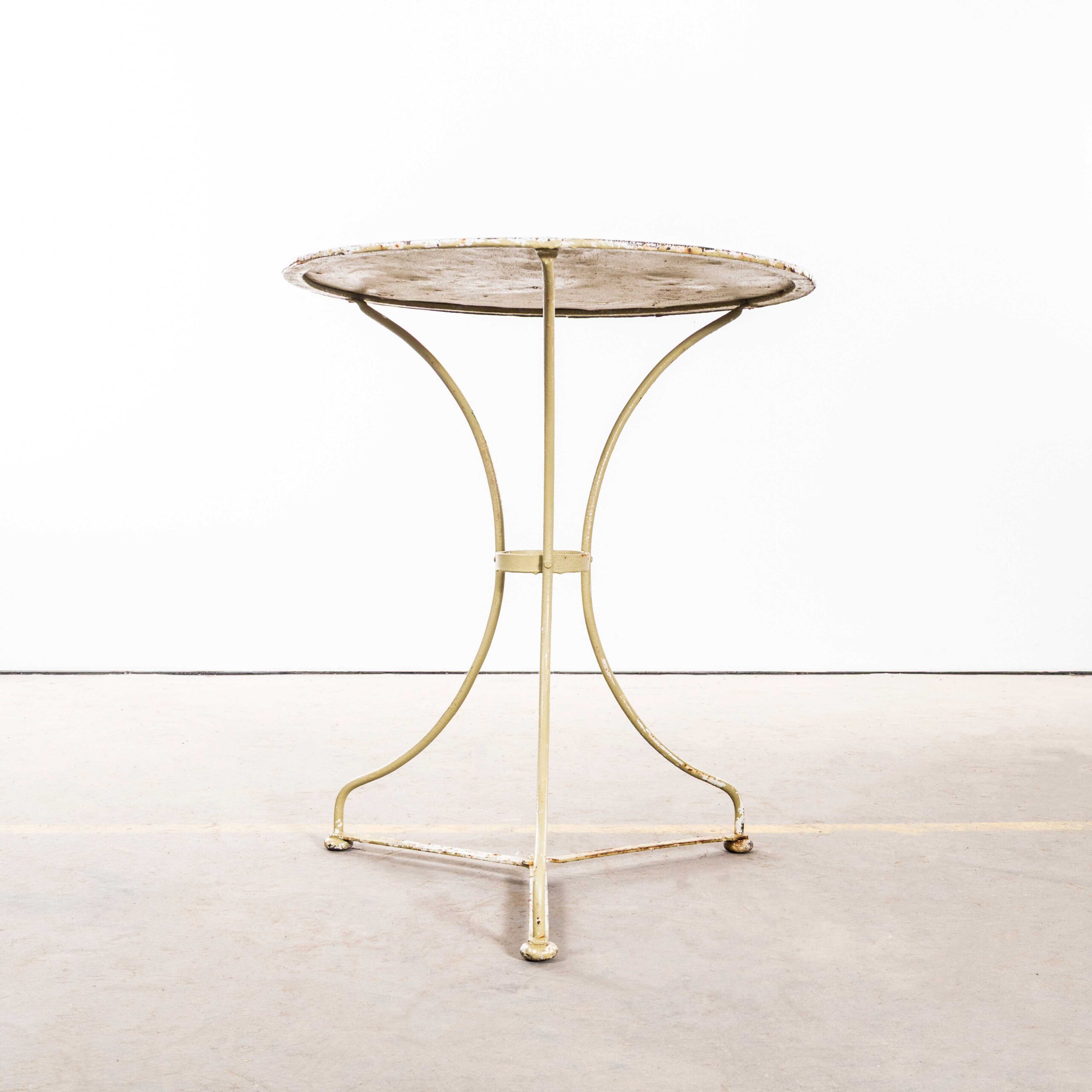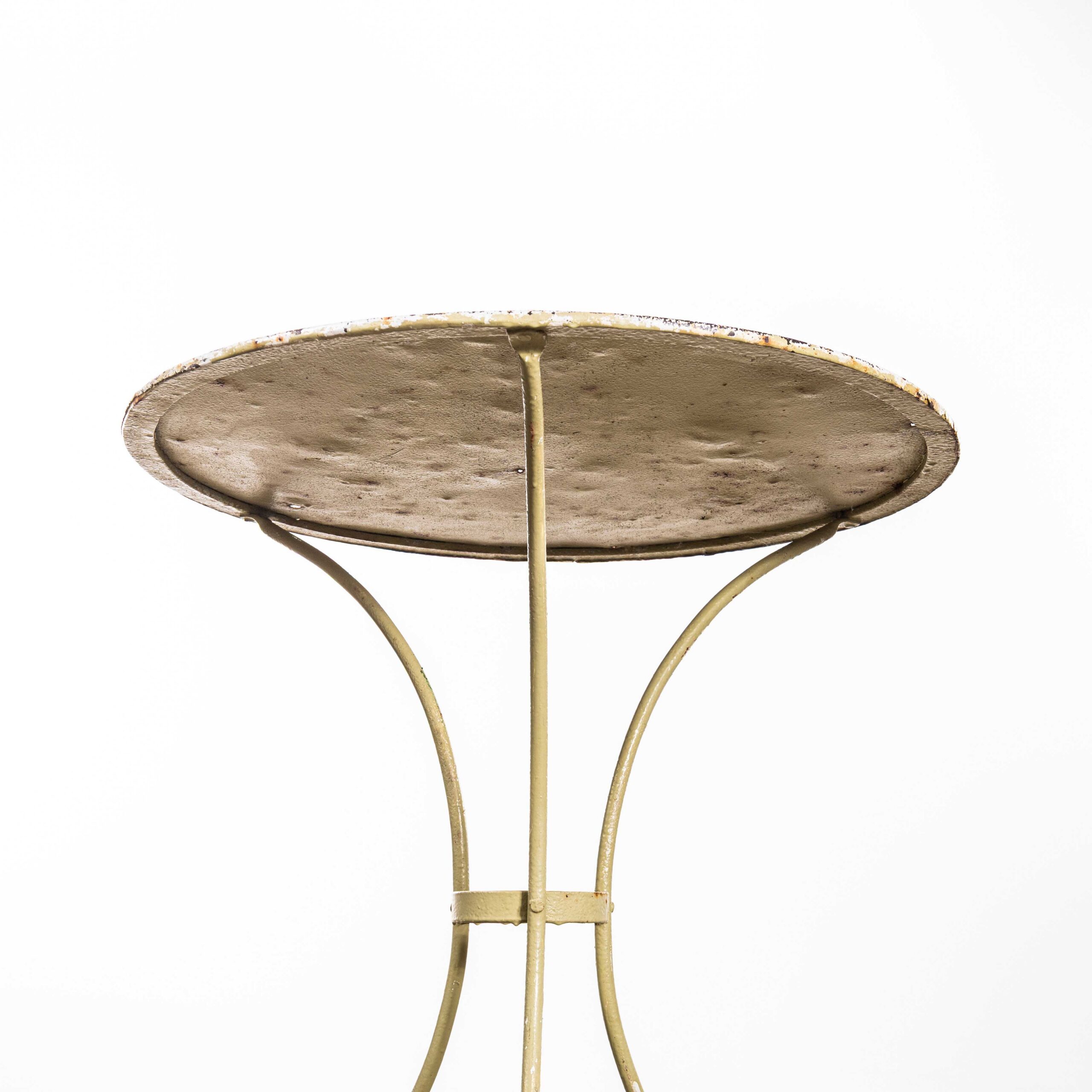 1950’s Khaki French Small Round Gueridon Table. Classic 1950’s French Gueridon table with three solid bar hand shaped legs with a central riveted support ring and delicate curved feet on a tripod base. Original paint gently restored by our workshop.