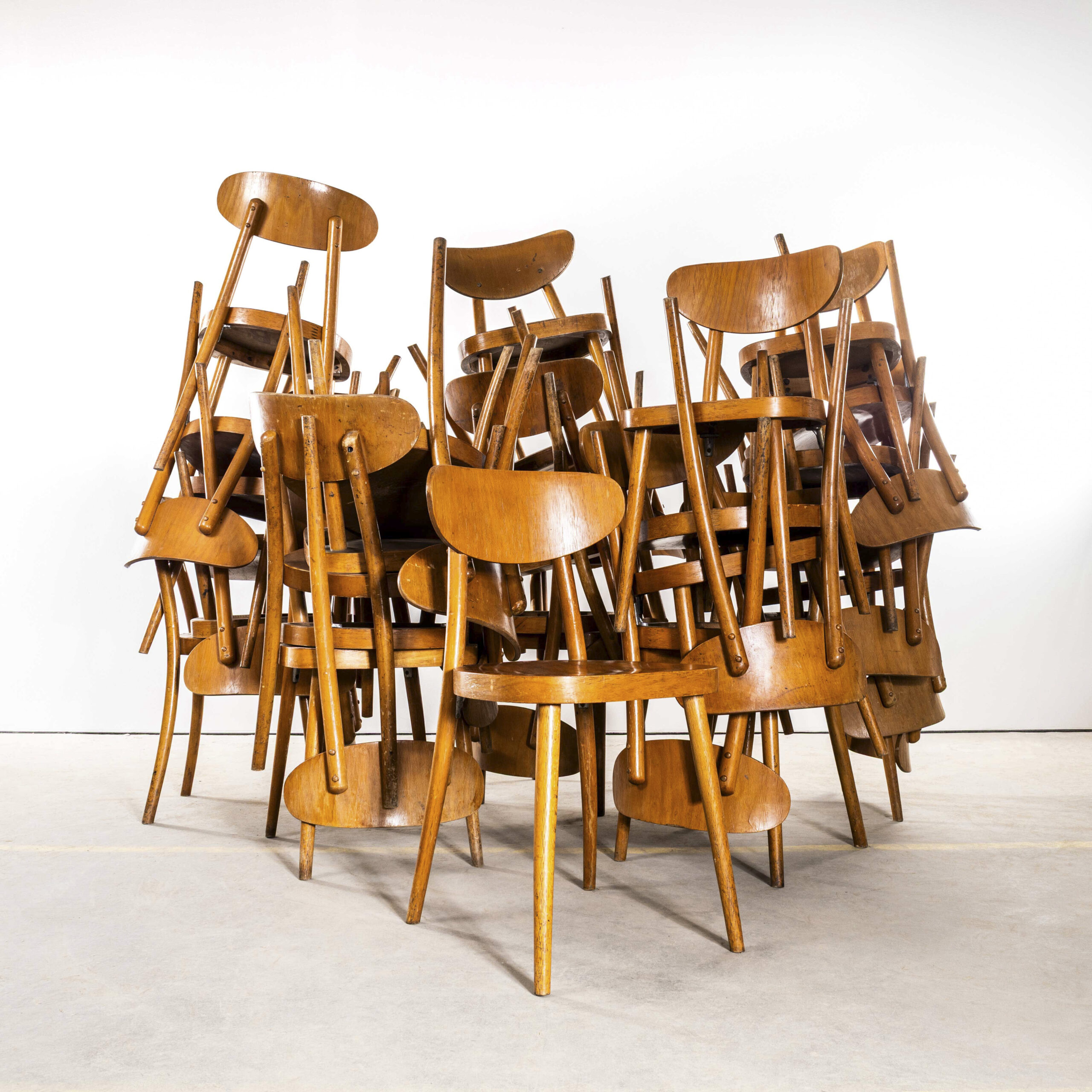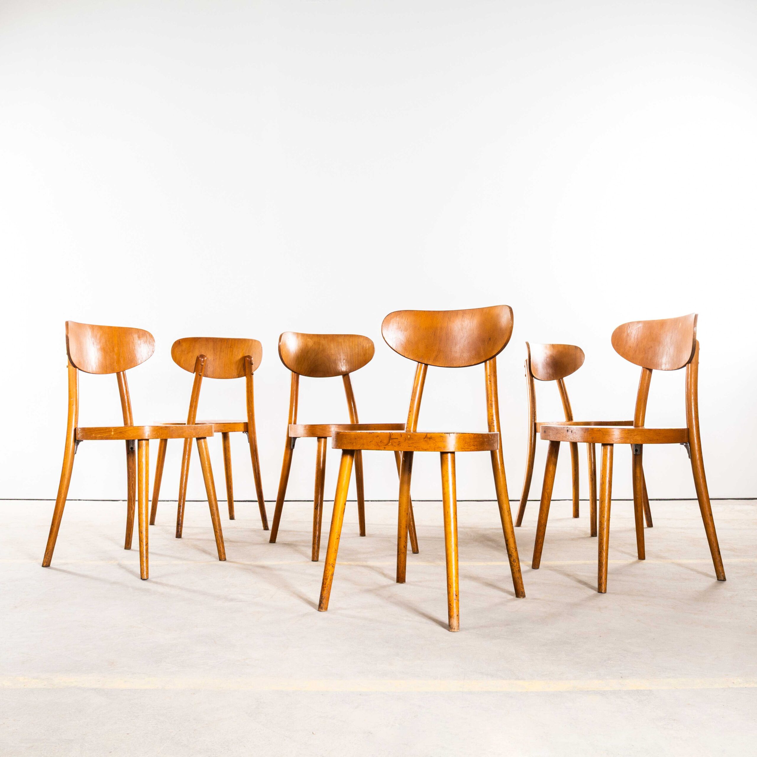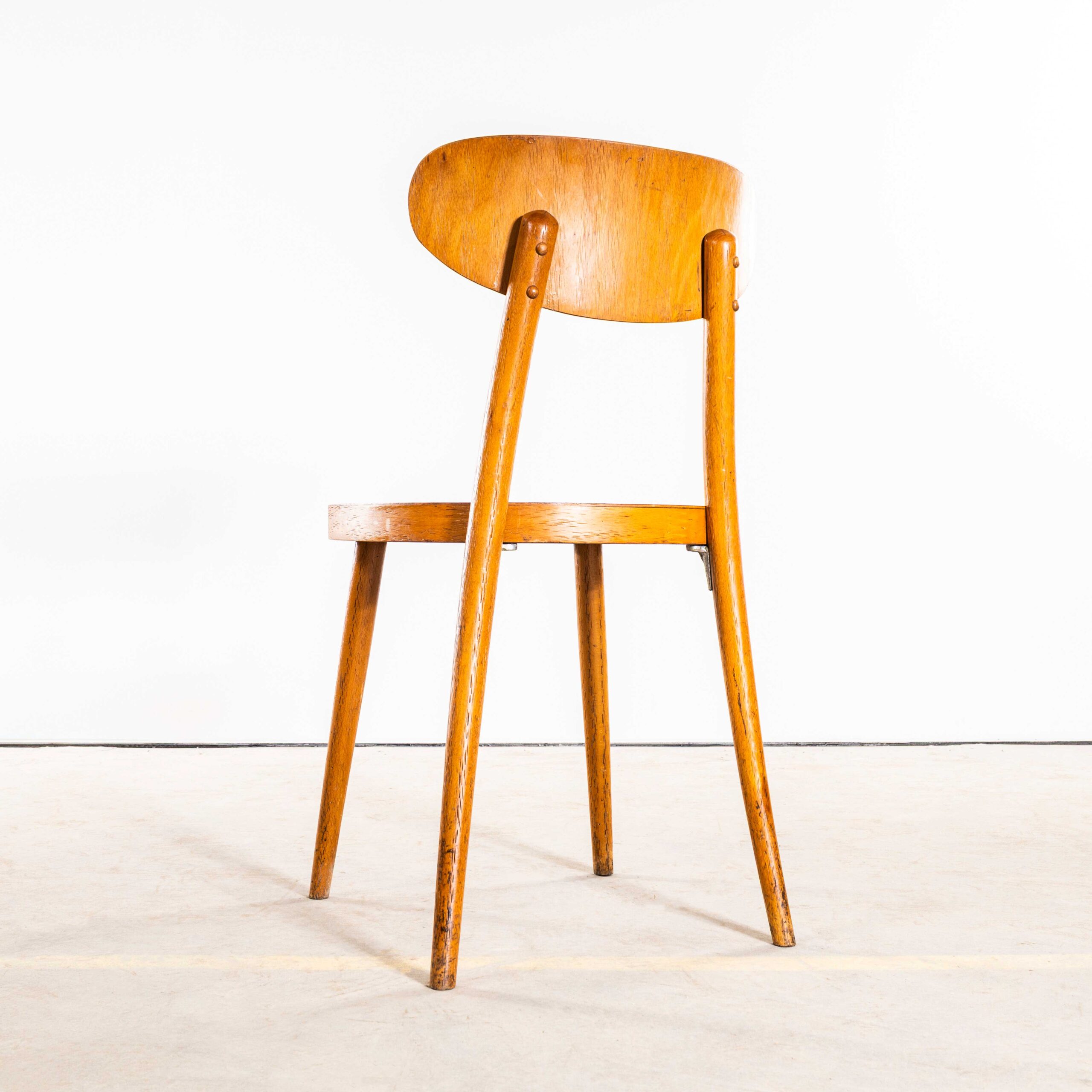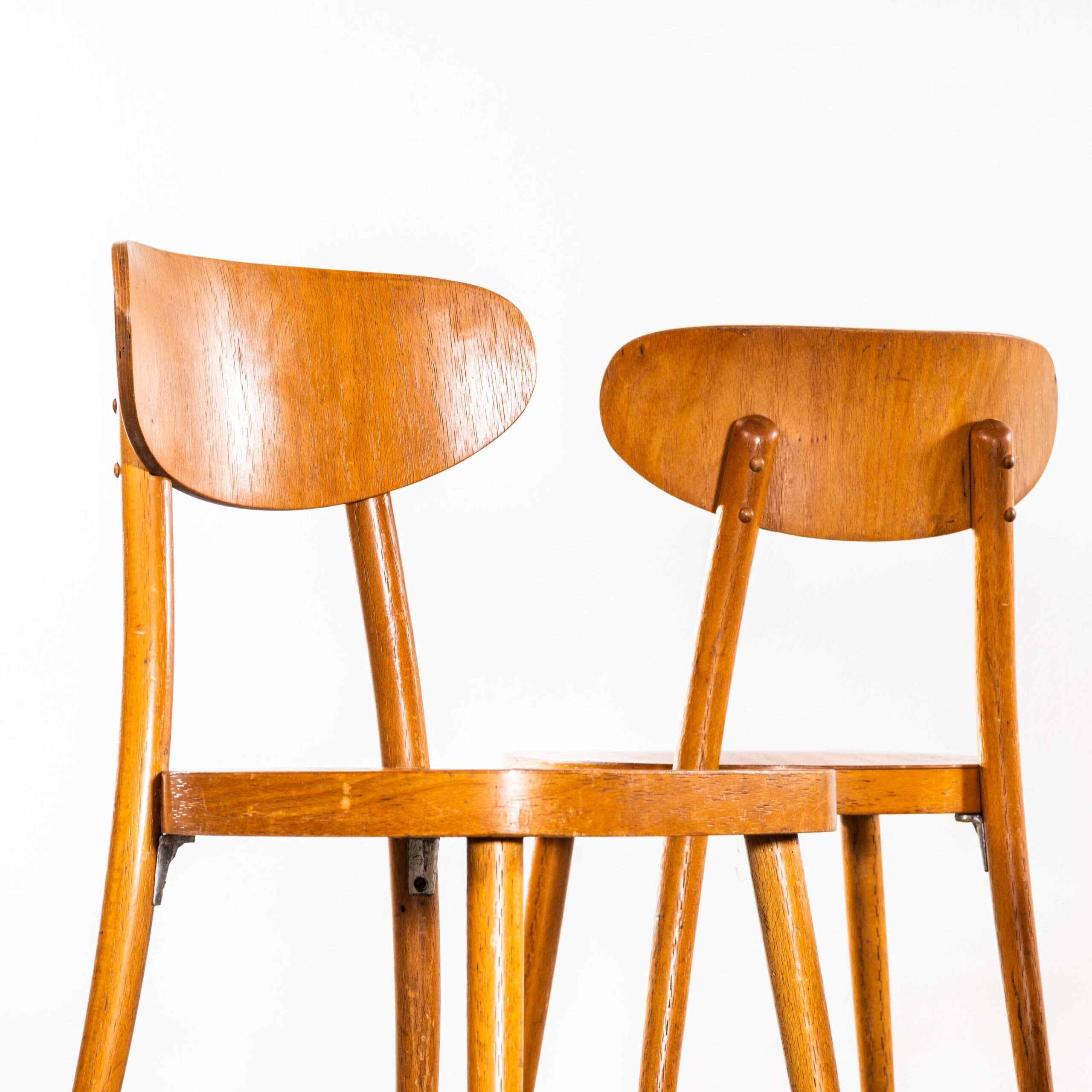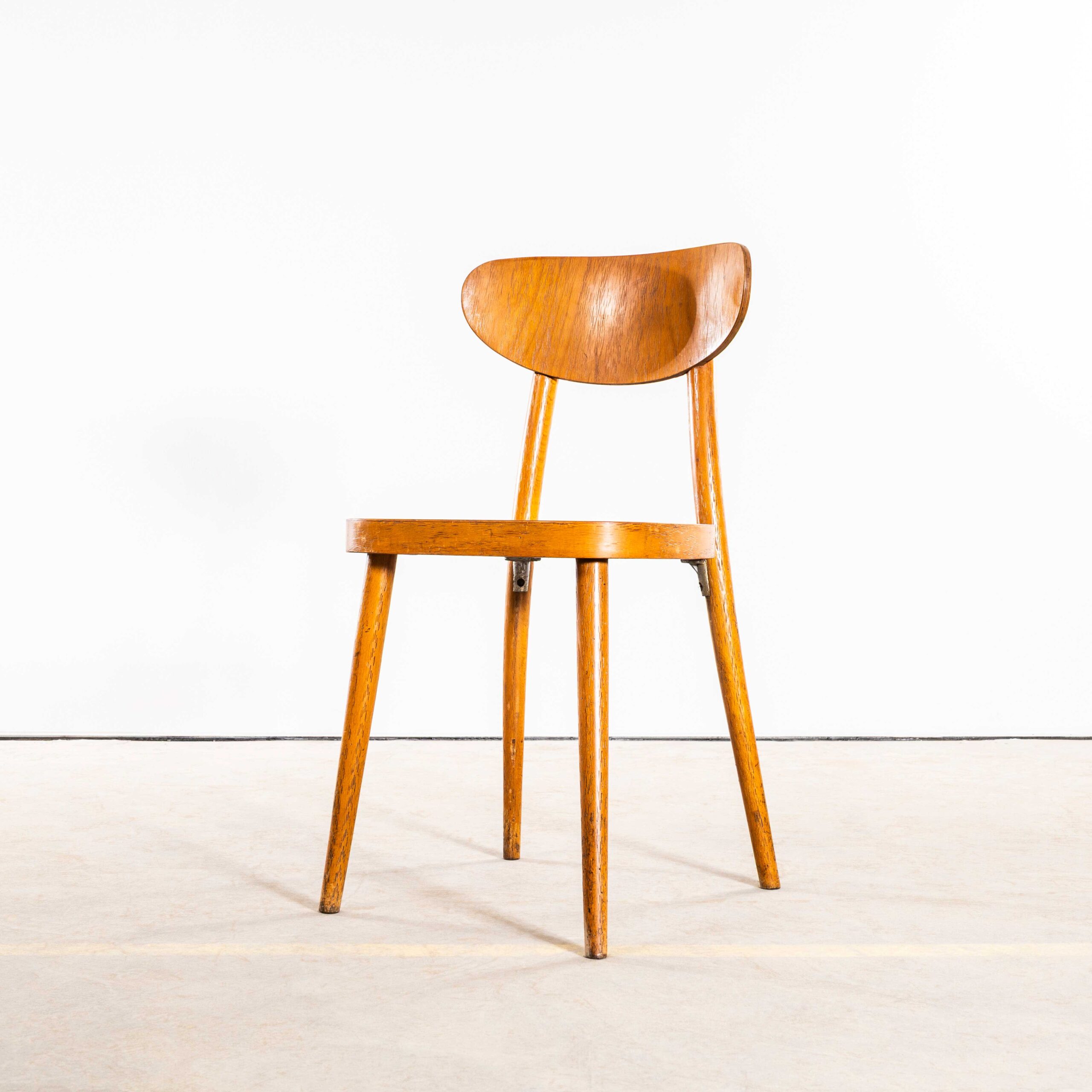 Esszimmerstuhl „Walflossenform“ aus Holz von Ton aus den 1960er Jahren. Hochwertige Esszimmerstühle in guten Abmessungen, hergestellt von der bekannten tschechischen Firma Ton, die auch heute noch existiert und wunderschöne Stühle produziert. Nach dem Zweiten Weltkrieg wurde das Thonet-Werk in Bystřice pod Hostýnem (Tschechische Republik) im Zuge des Kommunismus in der Tschechoslowakei verstaatlicht. 1953 wurde das Unternehmen offiziell in TON umbenannt, ein Akronym für Továrny na Ohýbaný Nábytek, was so viel wie „Hersteller“ bedeutet. Bugholz Möbelfabrik in Tschechien. Wir haben die Gestelle behutsam restauriert und dabei den ursprünglichen Charakter und die Patina erhalten – genau das macht diesen Stuhl aus. Ein robuster, formschöner Stuhl mit bequemer, geschwungener Rückenlehne, ausgestellten Beinen und modernem Design. Jeder Stuhl wird vor Verlassen unserer Werkstatt individuell geprüft und geliefert. Wir garantieren höchste Qualität.