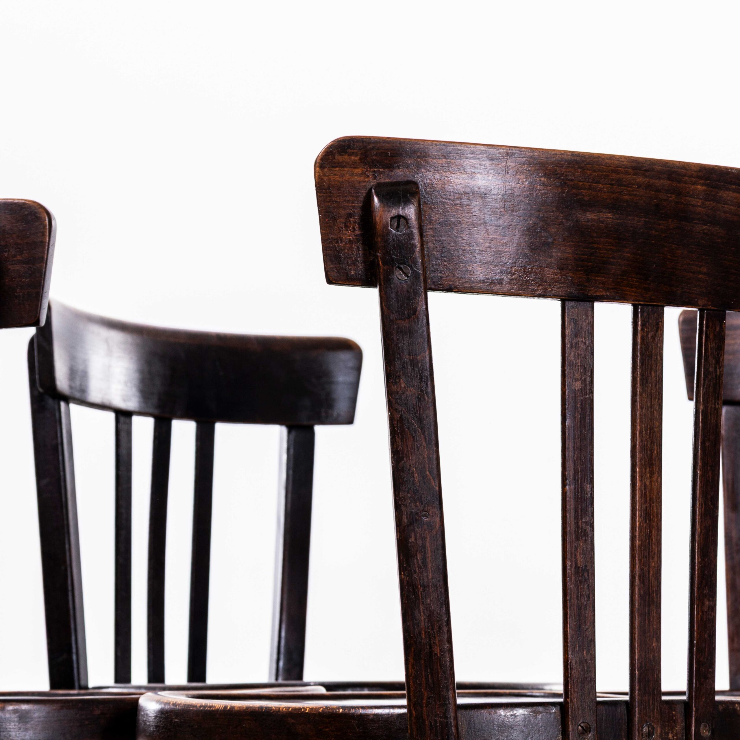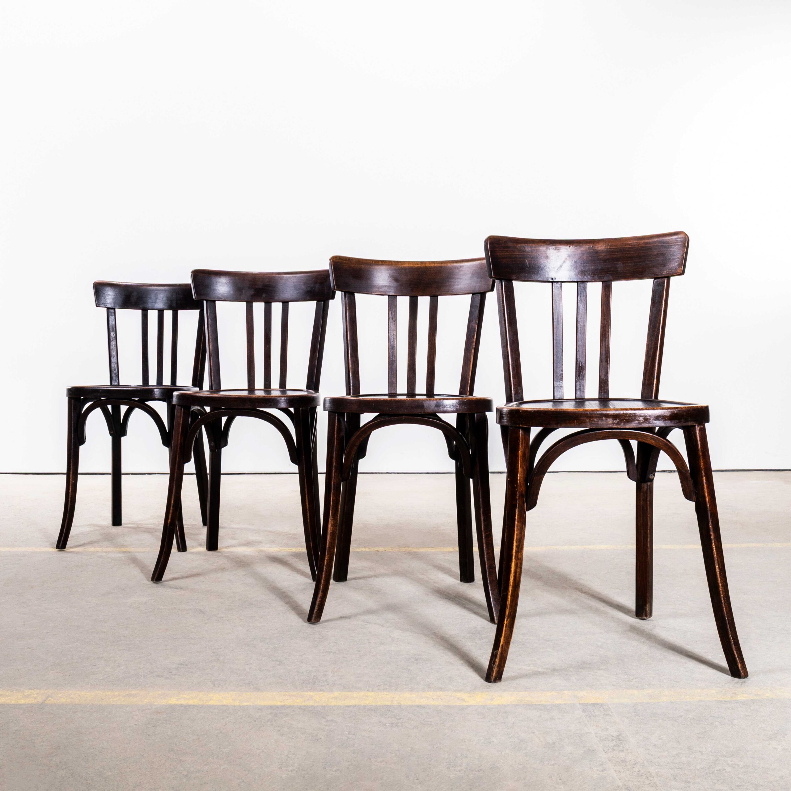 Ensemble de quatre chaises de salle à manger Baumann en chêne foncé, modèle Tri-Back, années 1950. Chaises de bistrot classiques en hêtre, fabriquées en France par Baumann. Baumann est un fabricant français encore peu connu, qui commence tout juste à se faire une place sur le marché. Fondée en 1901 à Colombier-Fontaine par le Suisse Émile Baumann, la maison Baumann a débuté par la fabrication de simples chaises pour enfants avant de devenir rapidement un important fabricant de meubles en bois courbé, avec des showrooms dans toute la France. À notre avis, les chaises des années 50 et 60 sont leurs plus belles, d'une fabrication et d'un design exceptionnels. Nous les avons simplement nettoyées. Elles présentent une magnifique patine d'origine. Chaque chaise est entretenue et cirée dans nos ateliers.