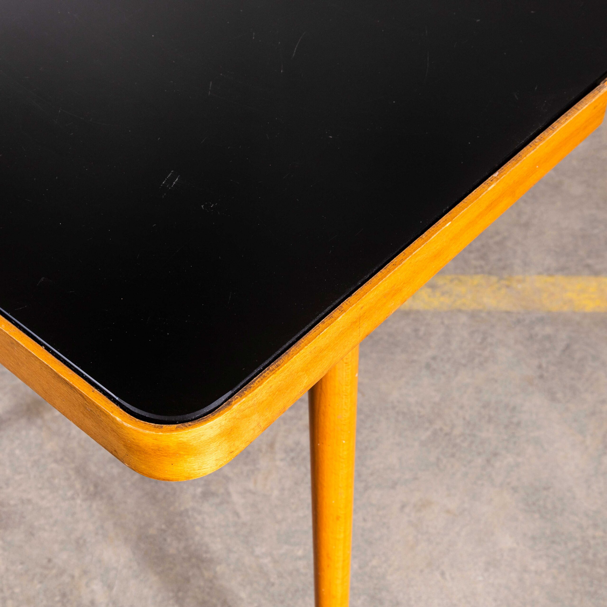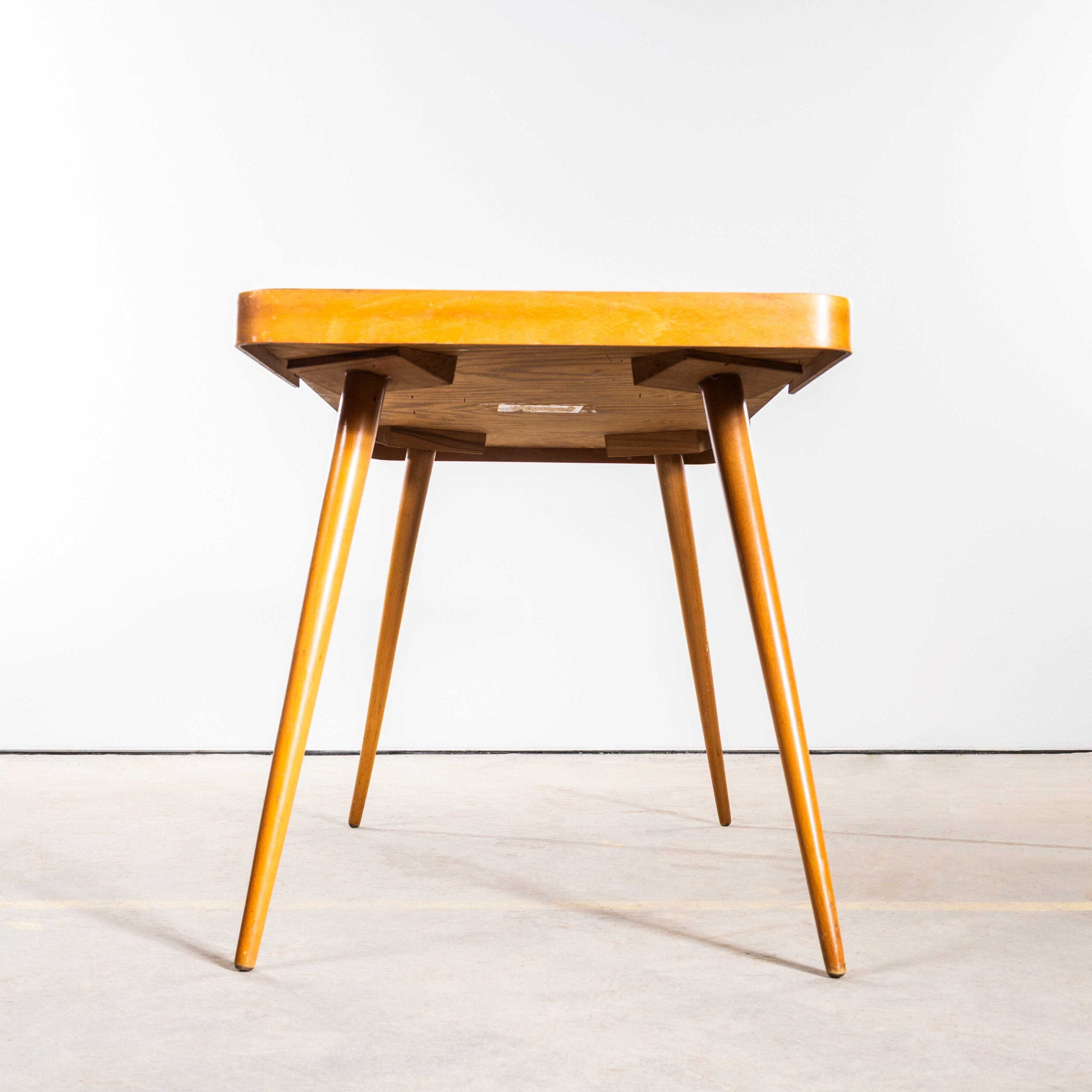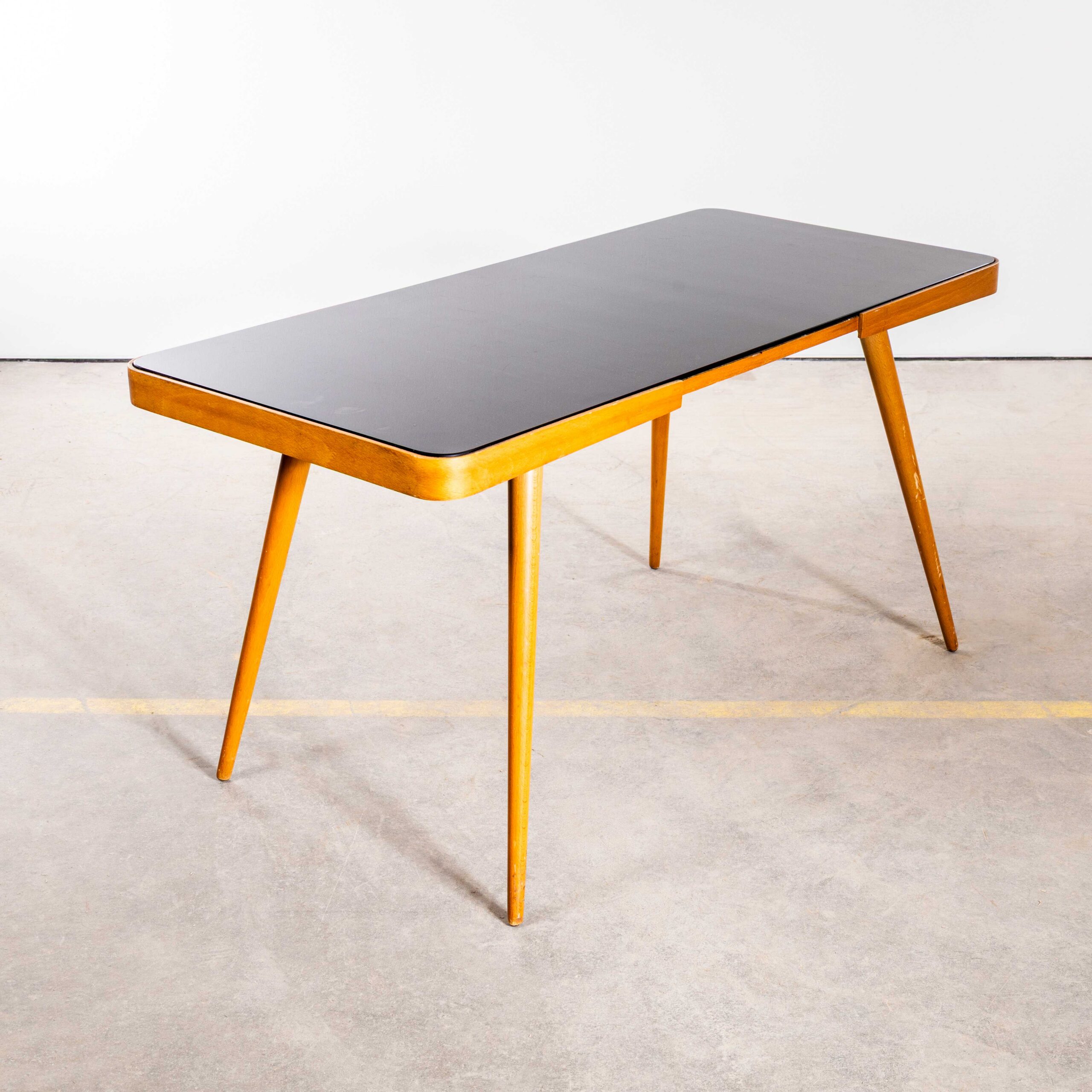 Table d'appoint tchèque des années 1950, style Mid-Century, signée Jiri Jiroutek – Plateau en verre Opaxit noir. Fabriquée par Pesky Nabytek en République tchèque, cette élégante table possède son plateau en verre noir d'origine. Sa structure, d'une riche couleur miel, est réalisée en bouleau et hêtre. Nettoyée et révisée par nos soins, cette table est robuste, stable et prête à l'emploi.