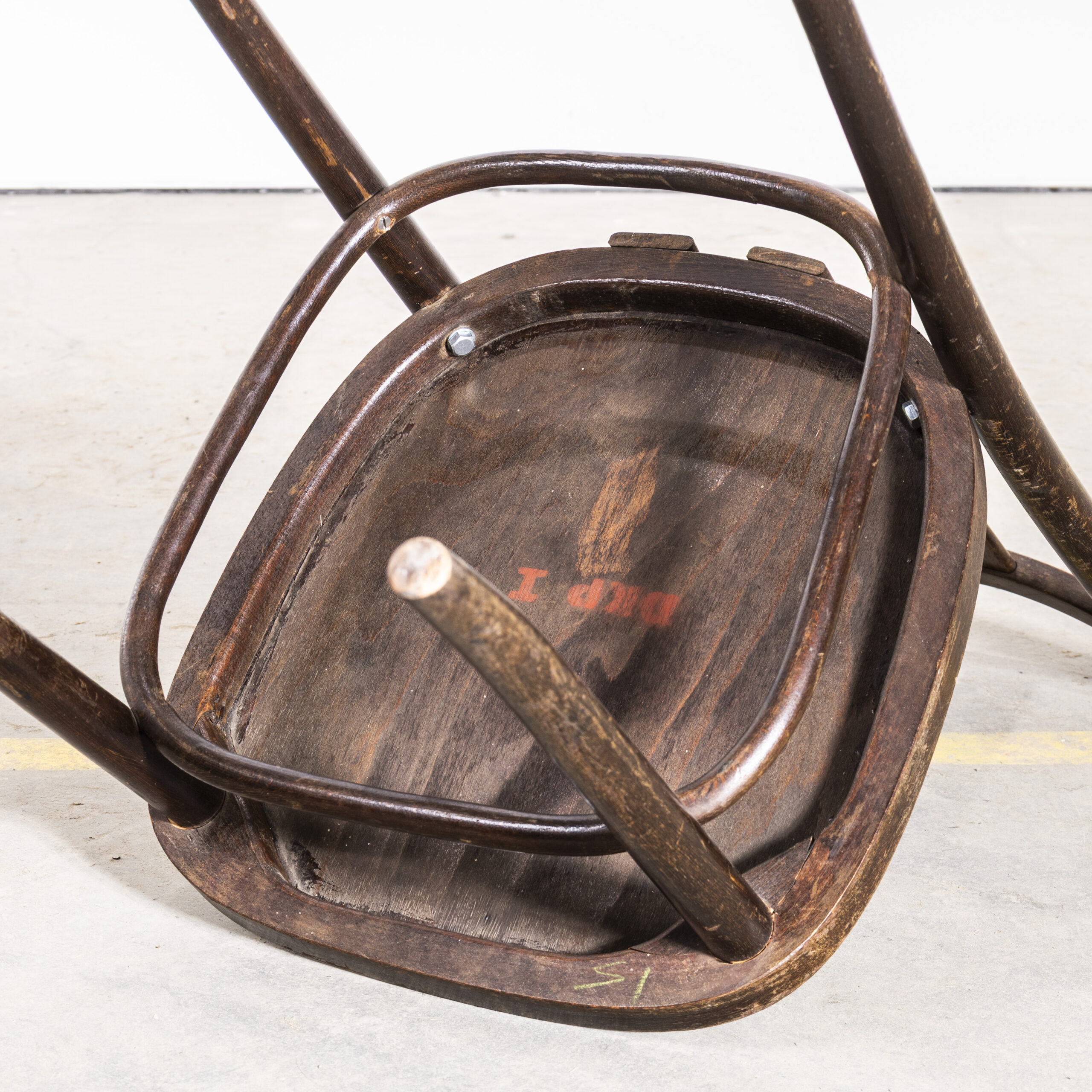 Chaises de salle à manger en chêne foncé, style années 1950. Chaises classiques de qualité, en bois courbé, avec un dossier simple et raffiné et une riche teinte chêne foncé, patinée par le temps. Fabriquées en Europe de l'Est en hêtre massif cintré à la vapeur, ces chaises robustes et lourdes présentent une belle usure due à leur âge. Chaque chaise a été révisée par notre atelier et est prête à l'emploi. Hauteur d'assise : 46 cm.