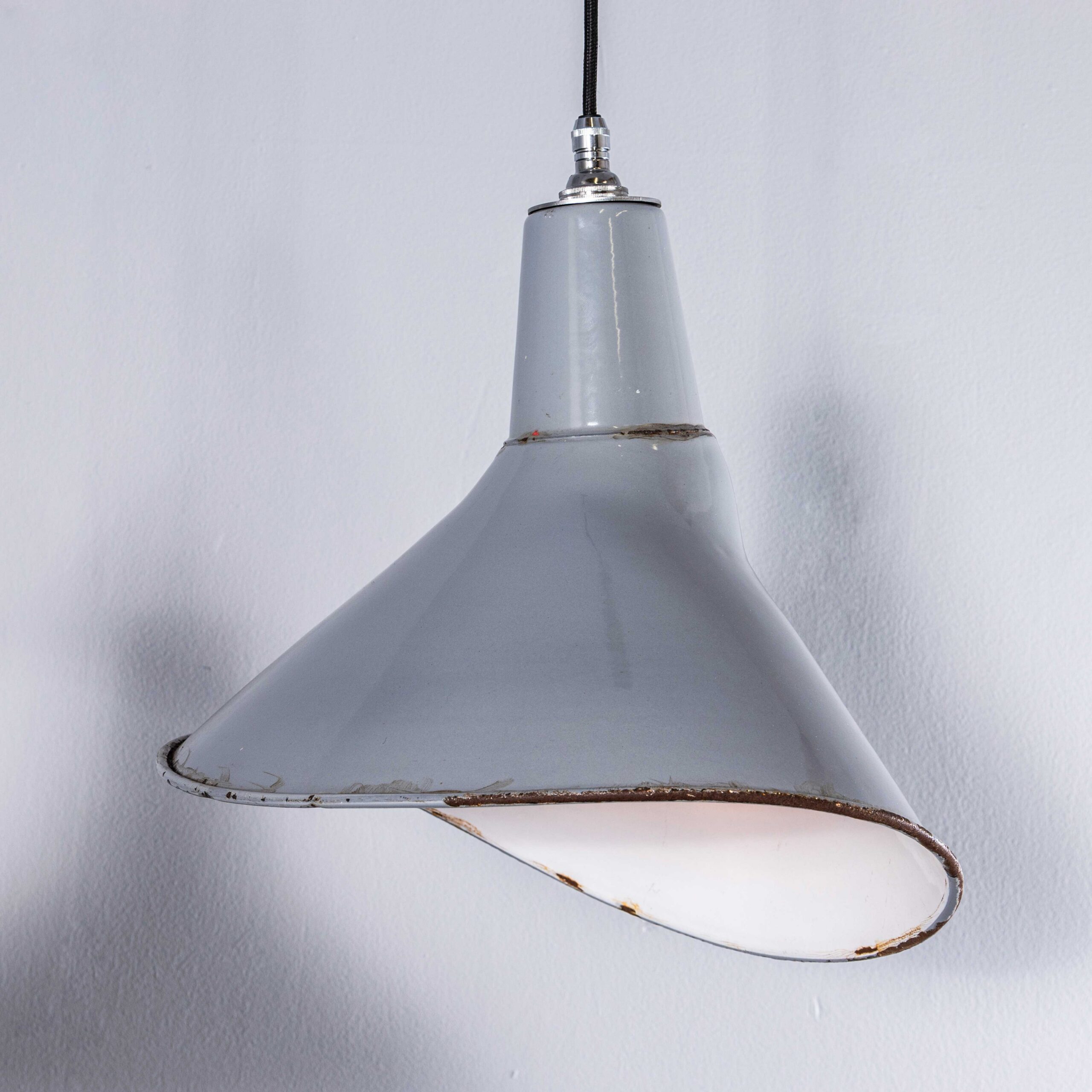 Paire de lampes paraboliques émaillées Benjamin Crysteel gris industriel des années 1950. Benjamin était sans doute le leader du marché de l'éclairage industriel des années 1930 aux années 1960. Son principal marché était la fourniture de lampes émaillées robustes aux grandes usines. Ces lampes, recouvertes de peinture, de graisse et de saleté, ont été nettoyées pour révéler un état d'origine exceptionnel. Chaque lampe a été nettoyée et restaurée, et tous les composants électriques ont été remplacés par des composants modernes conformes à la norme européenne CE BS EN 60598. Chaque lampe est testée individuellement et étiquetée selon la norme BS EN 60598. Inclus : chaque lampe est livrée entièrement câblée et prête à installer. Elle est équipée d'une douille E27 standard, compatible avec une large gamme d'ampoules à filament modernes et vintage. Chaque lampe est livrée entièrement câblée et prête à installer, avec notamment 2 mètres de câble électrique noir gainé de soie et un crochet de plafond à pince, comme illustré, pour une suspension facile. Cette lampe est équipée d'une douille E27 standard, compatible avec une large gamme d'ampoules à filament modernes et vintage. Nous ne vendons pas d'ampoules actuellement et recommandons des ampoules LED de 6 W maximum. Nous pouvons également fournir plus de 2 mètres de câble de suspension sur demande ; veuillez nous contacter pour en discuter. Spécialisés dans la restauration de luminaires vintage, nous sommes à votre disposition pour toute question relative à votre achat. La lampe est actuellement câblée et conforme aux normes britanniques et européennes. Elle peut être câblée pour être conforme aux normes américaines ou à celles de tout autre marché international.