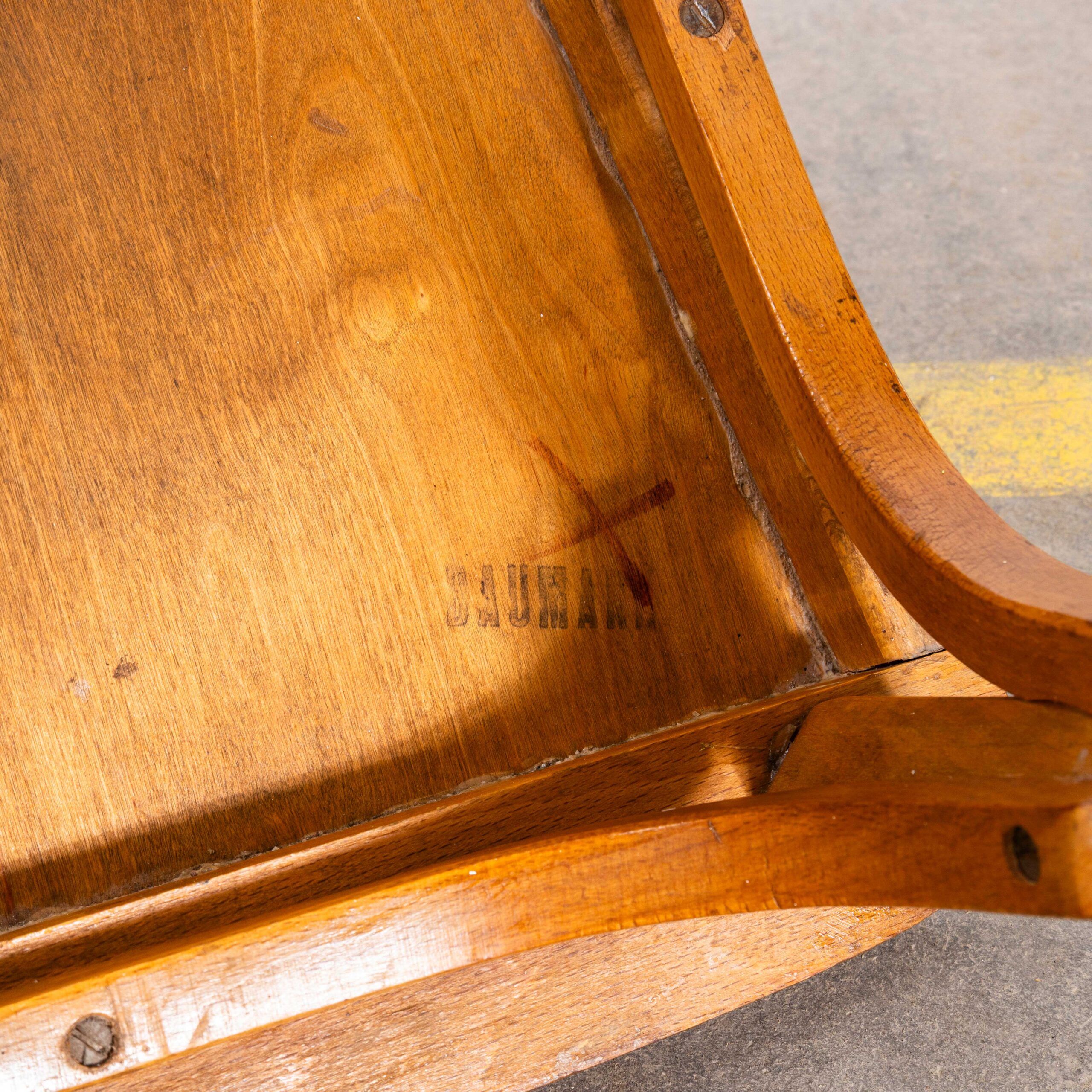Chaises de salle à manger Baumann Honey Single Bar en bois courbé, années 1950 – Lot de quatre. Chaises de bistrot classiques en hêtre, fabriquées en France par Baumann. Baumann est un fabricant français encore peu connu, qui commence tout juste à se faire une place sur le marché. Fondée en 1901 par le Suisse Émile Baumann à Colombier Fontaine, en France, la maison Baumann a débuté par la fabrication de simples chaises pour enfants avant de devenir rapidement un important fabricant de meubles en bois courbé, avec des showrooms dans toute la France. À notre avis, les chaises des années 50 et 60 sont leurs plus belles, magnifiquement réalisées et conçues. Celles-ci arborent une riche couleur d'origine. Nous les avons simplement nettoyées. Superbe patine d'origine. Chaque chaise est révisée et cirée avant son expédition et nous vous garantissons des chaises d'excellente qualité.