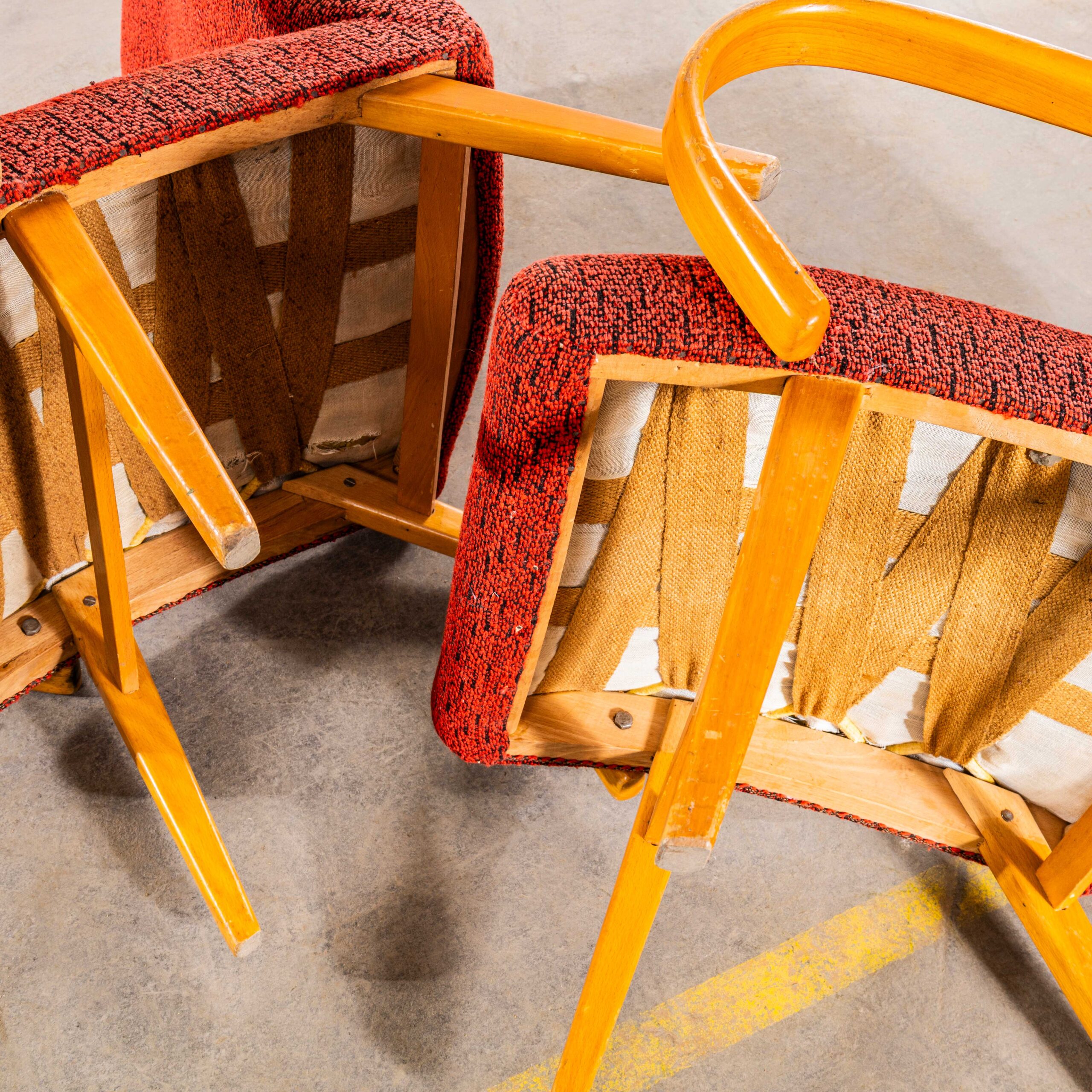 Fauteuils Jaroslav Å mÃdek originaux des années 1950 en jacquard orange capitonné – Assise standard. Issu directement de République tchèque, ce modèle est l'un des plus élégants de Å mÃdek. Nous sélectionnons avec soin des fauteuils d'origine afin de garantir un état optimal des tissus et du revêtement. La structure est entièrement en hêtre et les accoudoirs ont été nettoyés et cirés, tout en conservant leur caractère d'origine. Ce modèle est doté d'une assise standard en mousse. Le revêtement est entièrement d'origine et a été nettoyé à la vapeur en profondeur par notre équipe d'atelier. Hauteur d'assise : 41 cm