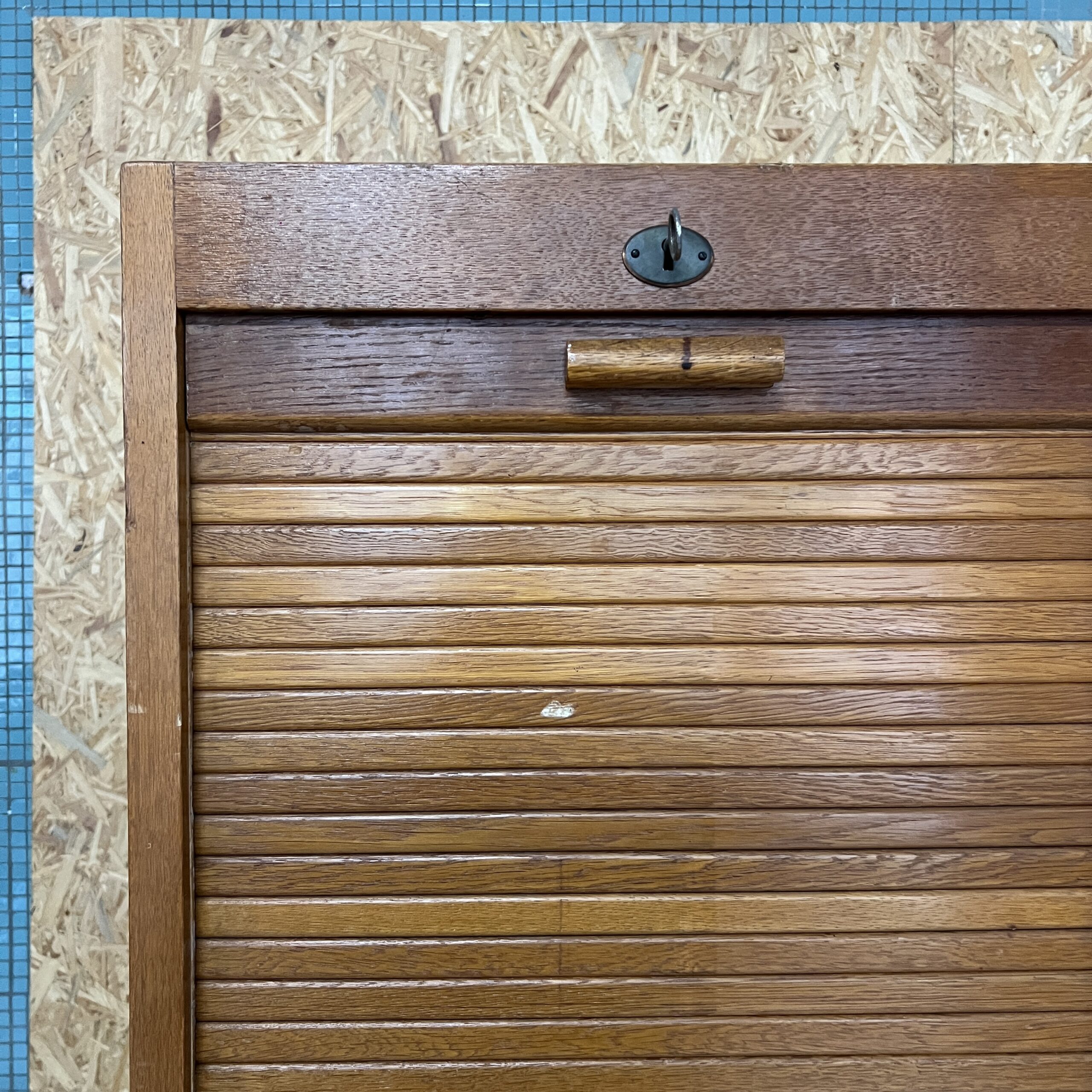 Grand meuble d'atelier français à double tambour des années 1950. Ce meuble classique est principalement réalisé en chêne avec des étagères réglables en bouleau. Il est doté de deux portes à tambour verrouillables qui s'ouvrent en douceur et conservent leurs clés d'origine.