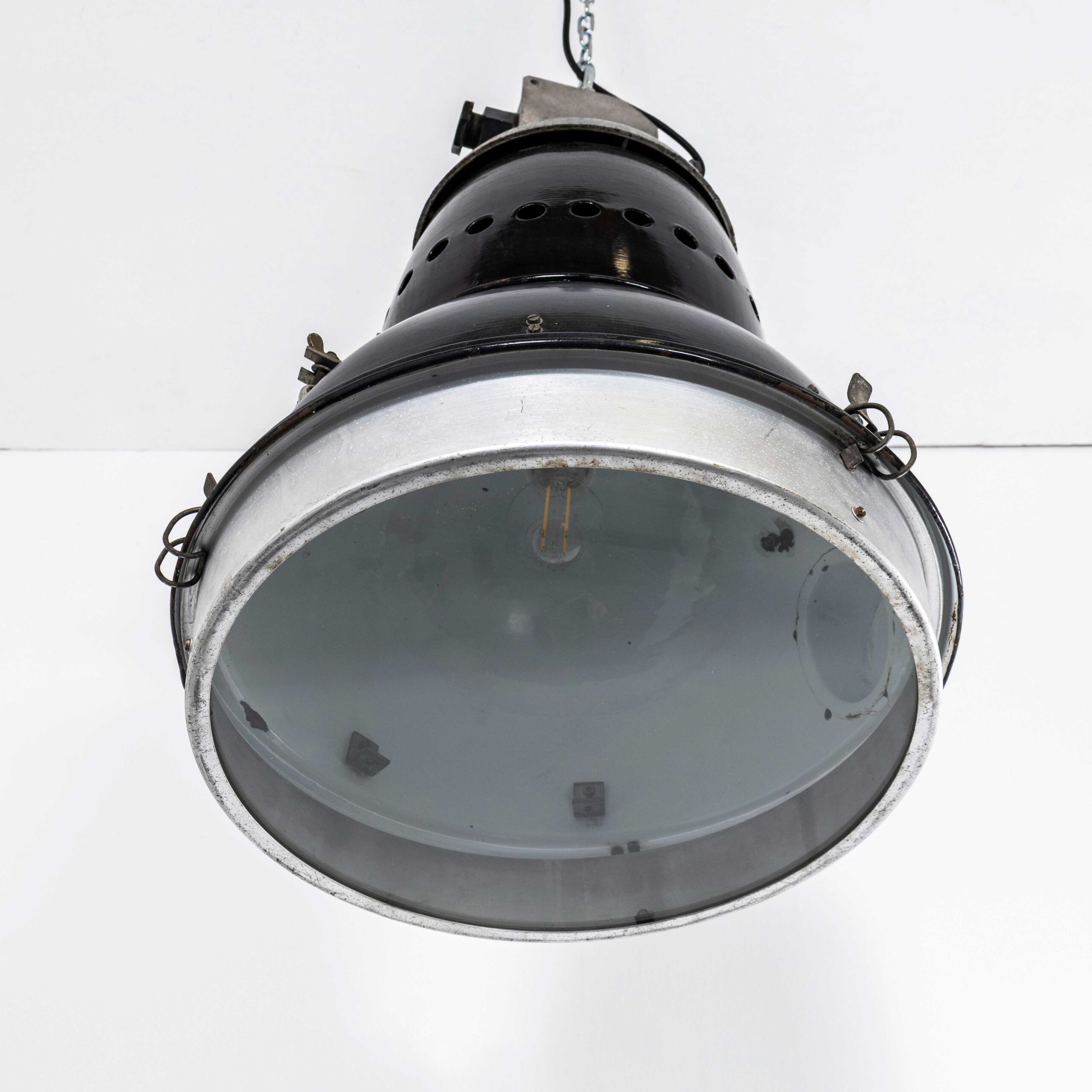 Suspension industrielle grand format en émail noir des années 1950. Lampe industrielle classique fabriquée en Europe de l'Est. L'abat-jour est en acier émaillé, l'abat-jour réfléchissant en émail blanc. La partie centrale est en émail et le dessus en fonte lourde. Incroyables lampes grand format, pesant environ 12 kg. Chaque lampe a été nettoyée et restaurée, et tous les composants électriques ont été retirés et remplacés par des composants modernes conformes à la norme européenne CE BS EN 60598. Chaque lampe est testée et étiquetée individuellement selon la norme BS EN 60598. INCLUS : Chaque lampe est livrée entièrement câblée et prête à installer, avec 2 mètres de chaîne pour la suspension, 2 mètres de câble électrique gainé de tissu noir et un crochet de plafond, comme illustré. La lampe est équipée d'une douille filetée standard E27 pour laquelle une large gamme d'ampoules à filament modernes et vintage est disponible. Nous ne vendons pas d'ampoules actuellement et recommandons des ampoules LED de 6 W maximum. Nous pouvons fournir plus de 2 mètres de câble/fil/chaîne de suspension, etc., selon vos besoins. Veuillez nous contacter séparément pour en discuter. Nous sommes spécialisés dans la rénovation de luminaires vintage. N'hésitez pas à nous contacter pour toute question concernant l'achat ou l'installation. La lampe est actuellement câblée et installée conformément aux normes britanniques et européennes. Elle peut être câblée conformément aux normes américaines et internationales. Cette offre concerne une lampe.