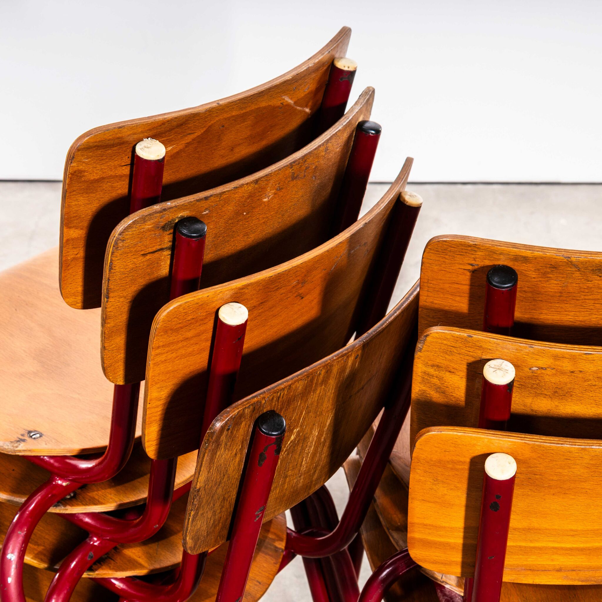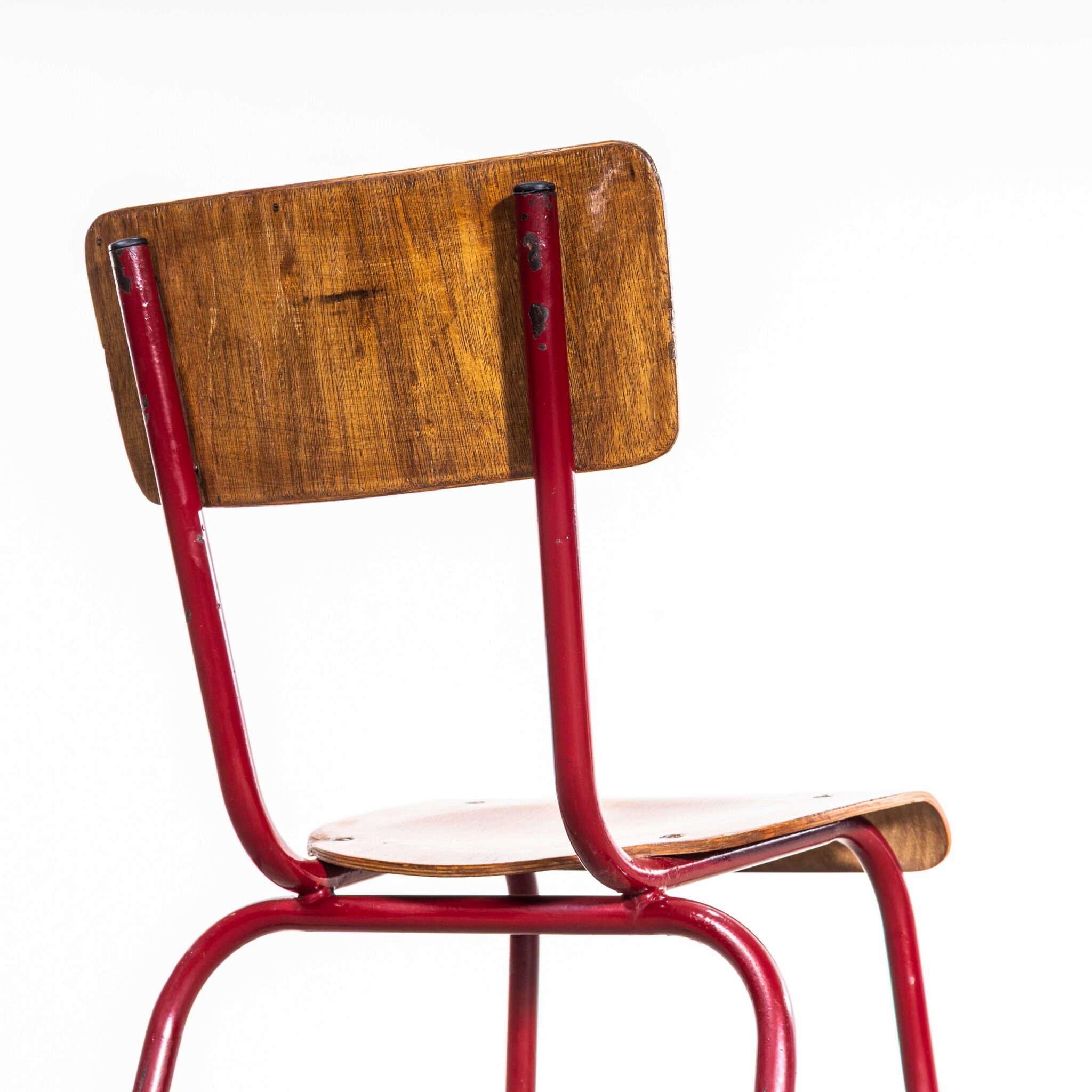 Ensemble de sept chaises de salle à manger empilables Mullca rouges simples, années 1960. Fondée en 1947 par Robert Muller et Gaston Cavaillon, Mullca est l'un de nos fabricants préférés. Cette entreprise a créé ce qui est sans doute la chaise d'école française la plus célèbre. Bien que la société n'existe plus, on trouve encore des chaises vintage, magnifiquement réalisées avec une structure tubulaire robuste et une assise en bouleau. Il s'agit ici du modèle d'entrée de gamme : la structure tubulaire est rouge acier et l'assise et le dossier sont en bouleau. Datant du début des années 1960, ces chaises sont en excellent état. Chaque chaise est révisée individuellement avant son expédition et nous garantissons une qualité irréprochable.