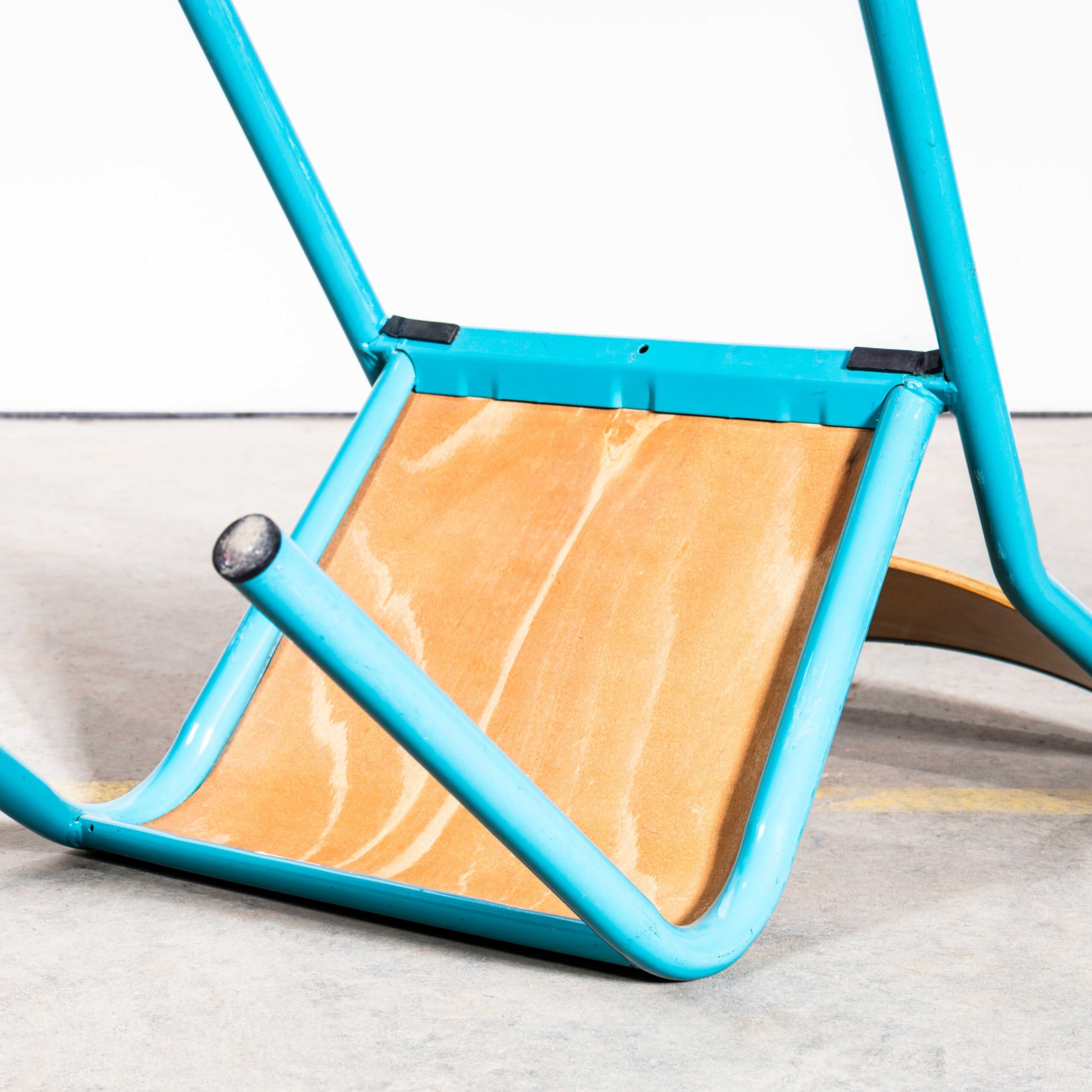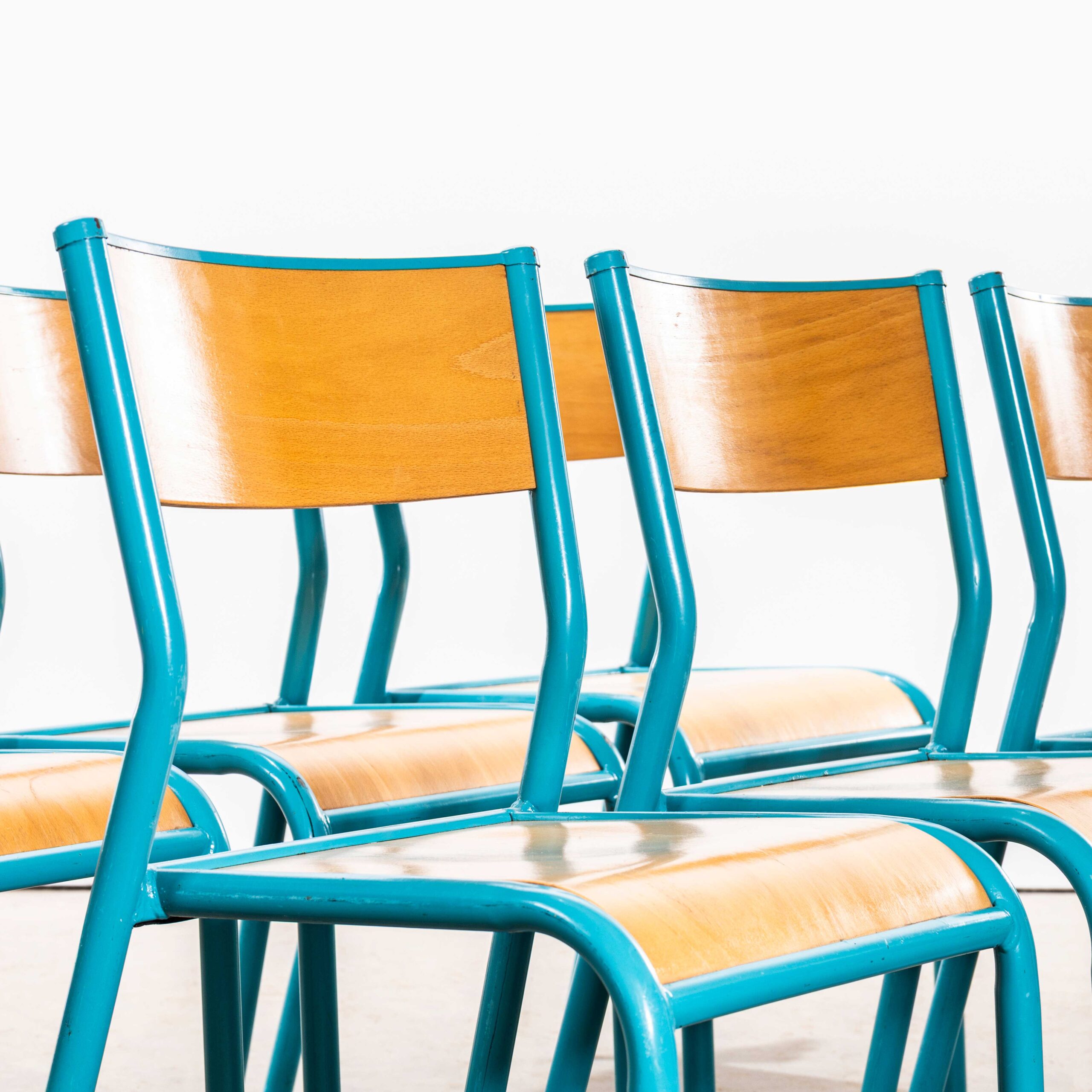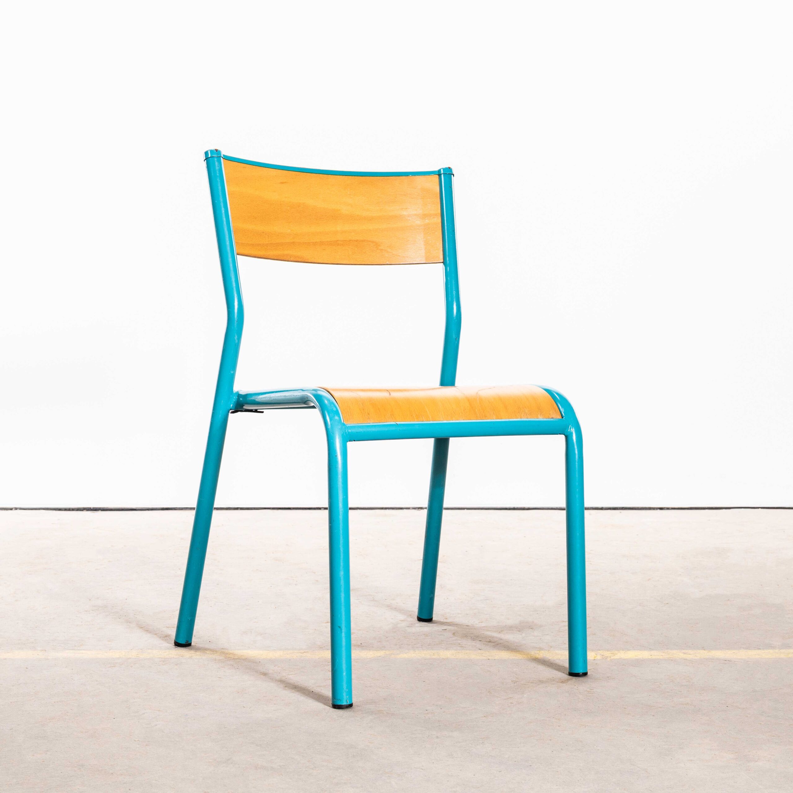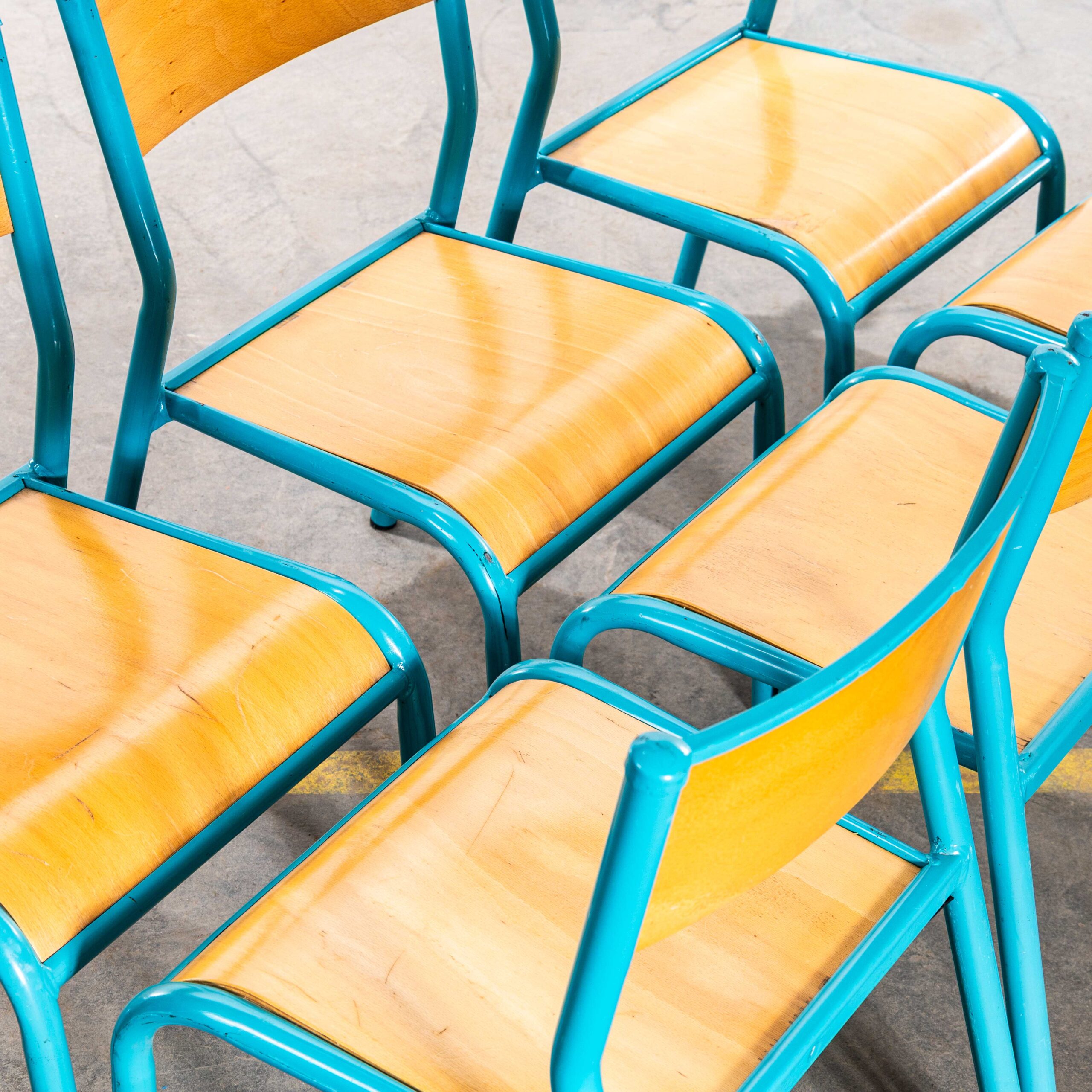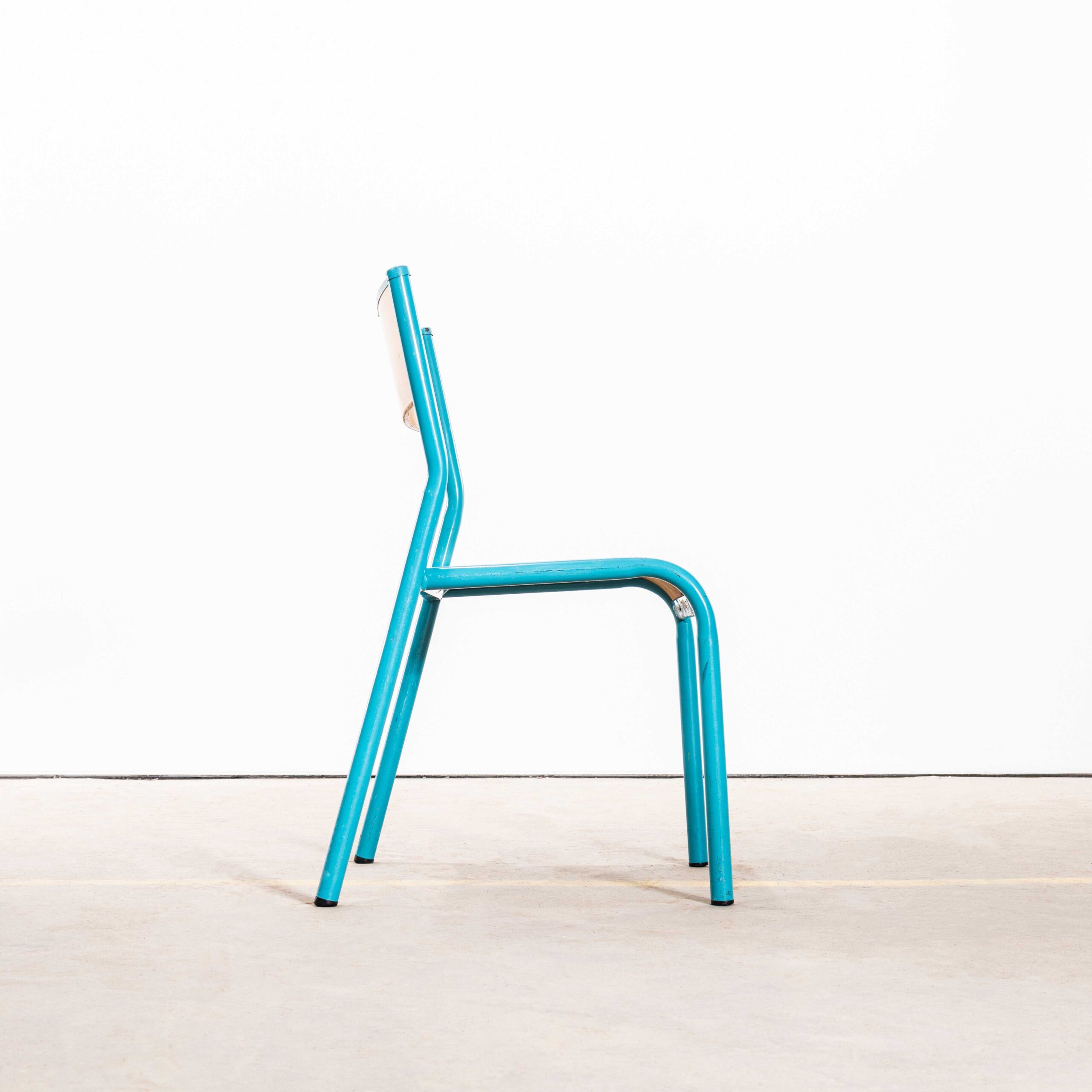 Chaises empilables Mullca françaises des années 1960 – Modèle 510 bleu vif – Lot de six. Un de nos modèles préférés : en 1947, Robert Muller et Gaston Cavaillon créèrent l’entreprise qui allait développer ce qui est sans doute la chaise d’école française la plus célèbre. Malheureusement, la marque n’existe plus, mais on trouve encore des chaises vintage, magnifiquement fabriquées avec une structure tubulaire robuste et des assises et dossiers en bouleau. La rumeur court que ce modèle serait une version améliorée du modèle 511, le gouvernement français ayant jugé ce dernier nécessaire à une modernisation. Les nôtres datent du début des années 1960 et sont en excellent état, avec une hauteur d’assise légèrement plus basse pour les enfants. Très confortables et élégantes. Nous révisons et remettons à neuf chaque chaise individuellement avant son expédition et nous vous garantissons des chaises d’excellente qualité.