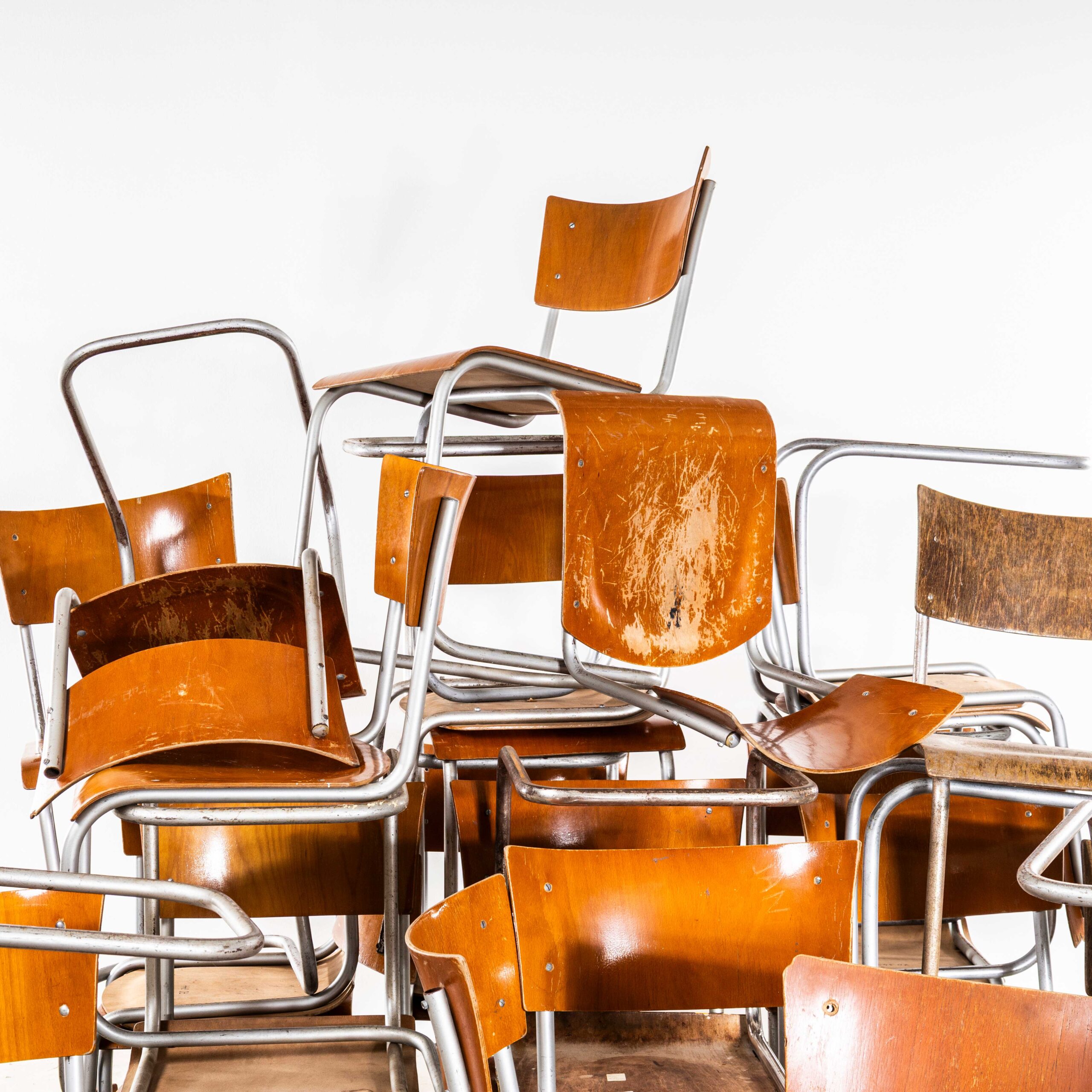 Sedia da pranzo a sbalzo FN6 degli anni '50 di Mart Stam per Mücke Melder. Fondata negli anni '20 a Fryštát, nella Repubblica Ceca, Mücke Melder era il principale produttore di mobili modernisti in tubolare metallico dell'epoca. L'uso industriale del tubolare metallico nei mobili derivava dai design modernisti dell'iconico movimento Bauhaus e il lavoro di Mucke Melder fu fortemente ispirato da questo movimento e dai design di Mies van der Rohe, Mart Stam e Marcel Bruer, tra gli altri. Purtroppo si conosce poca storia della fabbrica Mucke Melder, sebbene molte delle loro poltrone e sedie siano fortunatamente sopravvissute. Questa sedia è attribuita a Mart Stam, sebbene non siamo a conoscenza di documentazione di progetto che lo confermi. Le sedie provenivano direttamente da un college di Praga e sono state molto utilizzate, ma sono in eccellenti condizioni strutturali e pratiche. I telai sono in tubolare d'acciaio cromato, i sedili e gli schienali sono in laminato di betulla. Il nostro laboratorio ha revisionato le sedie, pulendo e cerando le strutture; apprezziamo il fatto che siano state usate a lungo e abbiano un carattere particolare. Le immagini sono parte integrante della descrizione del prodotto e non possiamo fotografare ogni sedia. I set ordinati saranno abbinati nel miglior modo possibile.