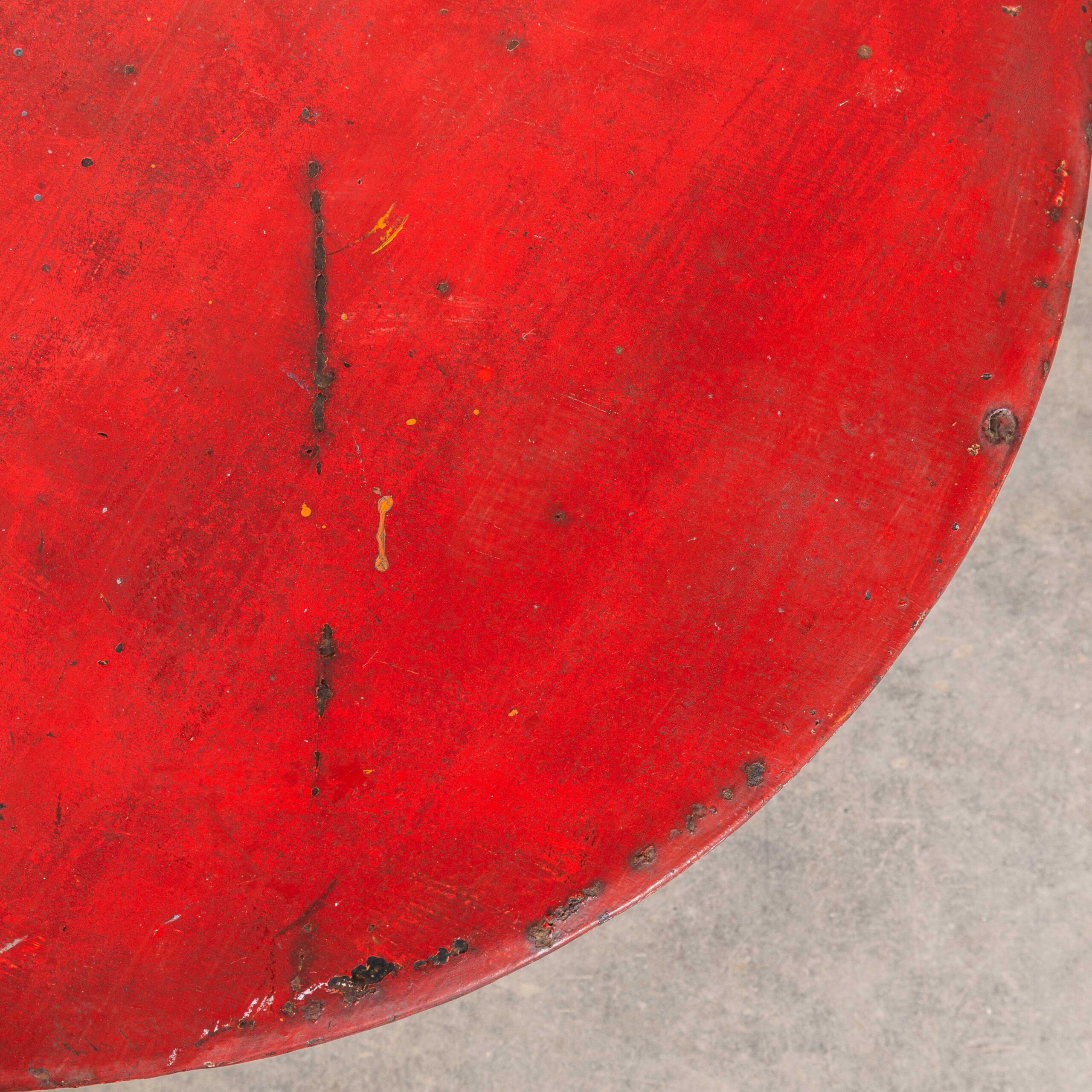 Tavolo gueridon da esterno rotondo in metallo con piano rosso, Francia, anni '50. Classico tavolo gueridon francese con tre solide gambe a barra sagomate a mano, un anello di supporto centrale rivettato e delicati piedini curvi su una base a treppiede. Vernice originale.