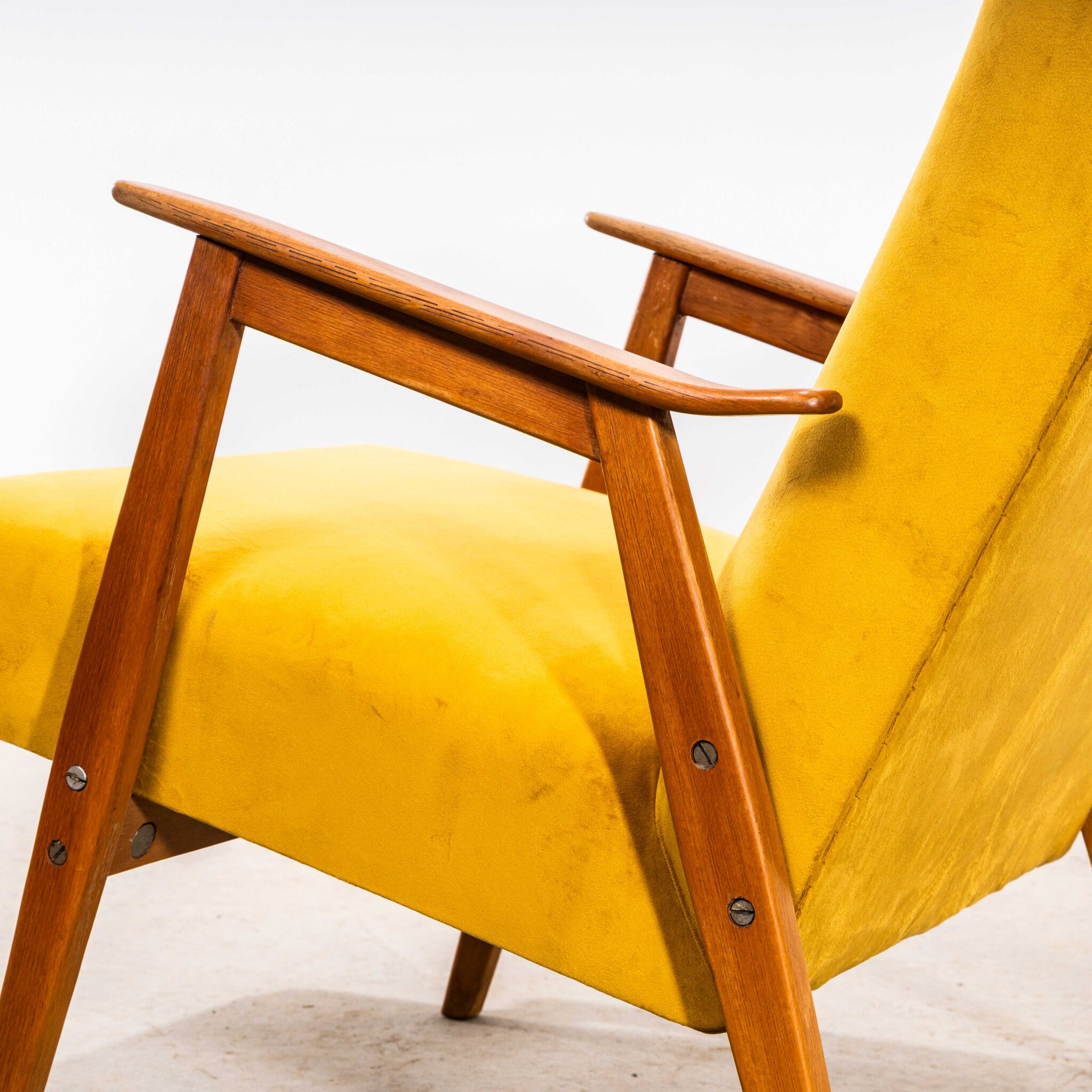 1950’s Mid Century Upholstered Mustard Armchairs With Straight Arms and Top Caps. Sourced in Scandinavia this is a fully restored pair of mid century armchairs. The frame is beech throughout and the arms have been cleaned and waxed but retain their original character. The internal beech frame has been carefully restored, the internal foam and components have been checked and replaced as required by our workshop team. To comply with UK fire regulations the internal components are covered in a flame retardant barrier cloth. We have selected this brand new mustard cotton velvet fabric and reupholstered the chairs throughout. The price is for one armchair only.