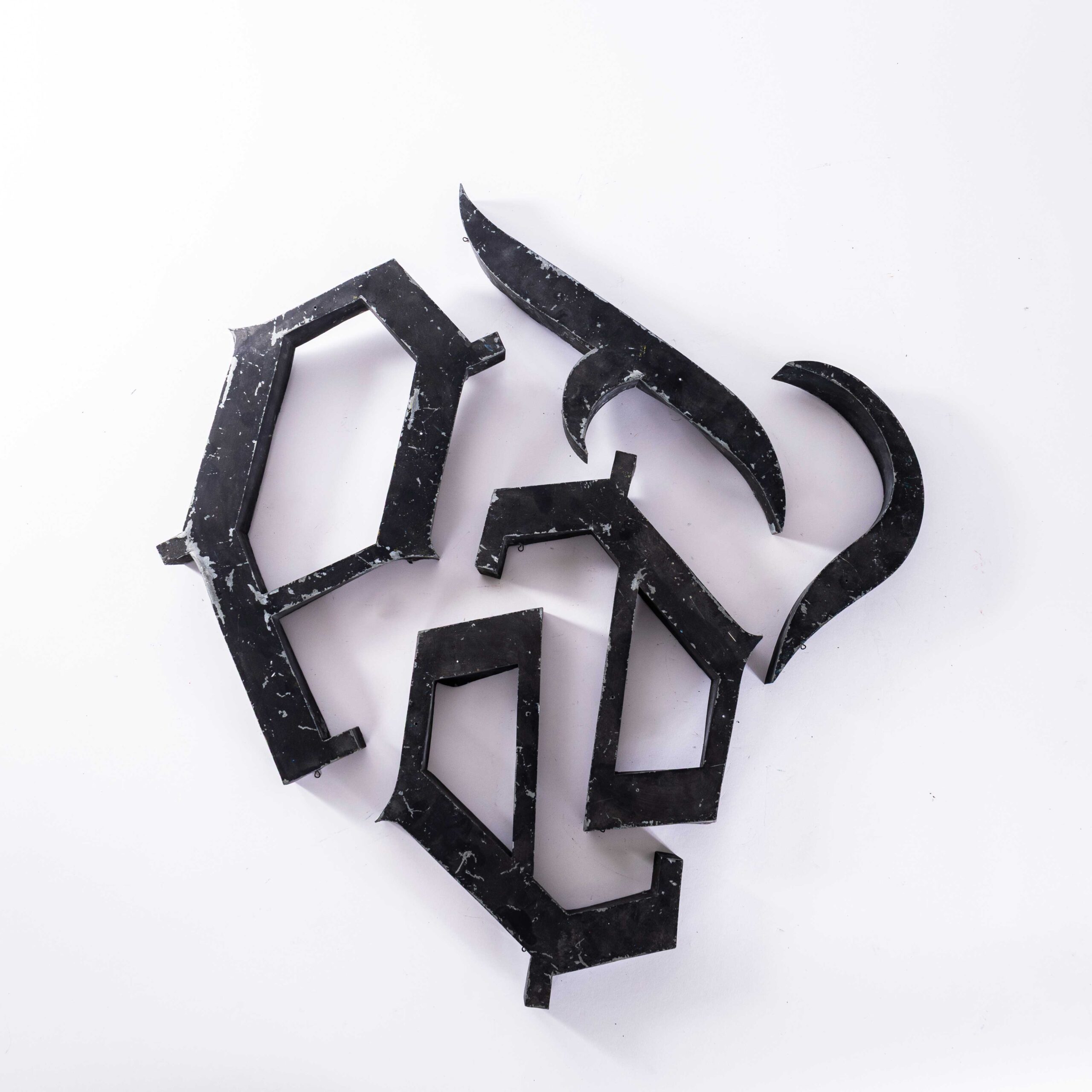 Lettere gotiche originali per insegne in metallo francesi degli anni '50. Di recente abbiamo recuperato un'azienda di segnaletica sulla costa occidentale della Francia e abbiamo trovato un grande lotto di fantastiche lettere originali, ricche di colore e in perfette condizioni, con anni di scolorimento dovuto al sole e al carattere. Le lettere sono state realizzate a mano in lamiera di acciaio zincato e verniciate come mostrato. Le lettere sono cave sul retro. Se disponiamo di multipli di una lettera, mostriamo le variazioni nelle condizioni nella fotografia. Le dimensioni variano leggermente, quindi quelle sottostanti si basano sulla lettera media.