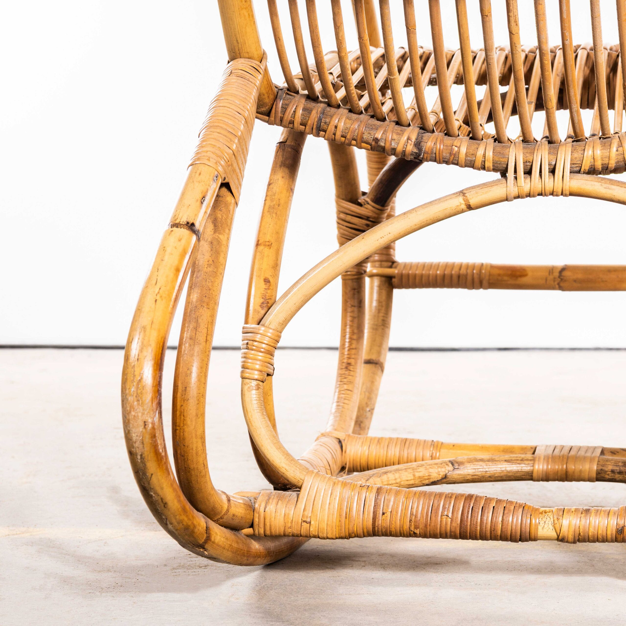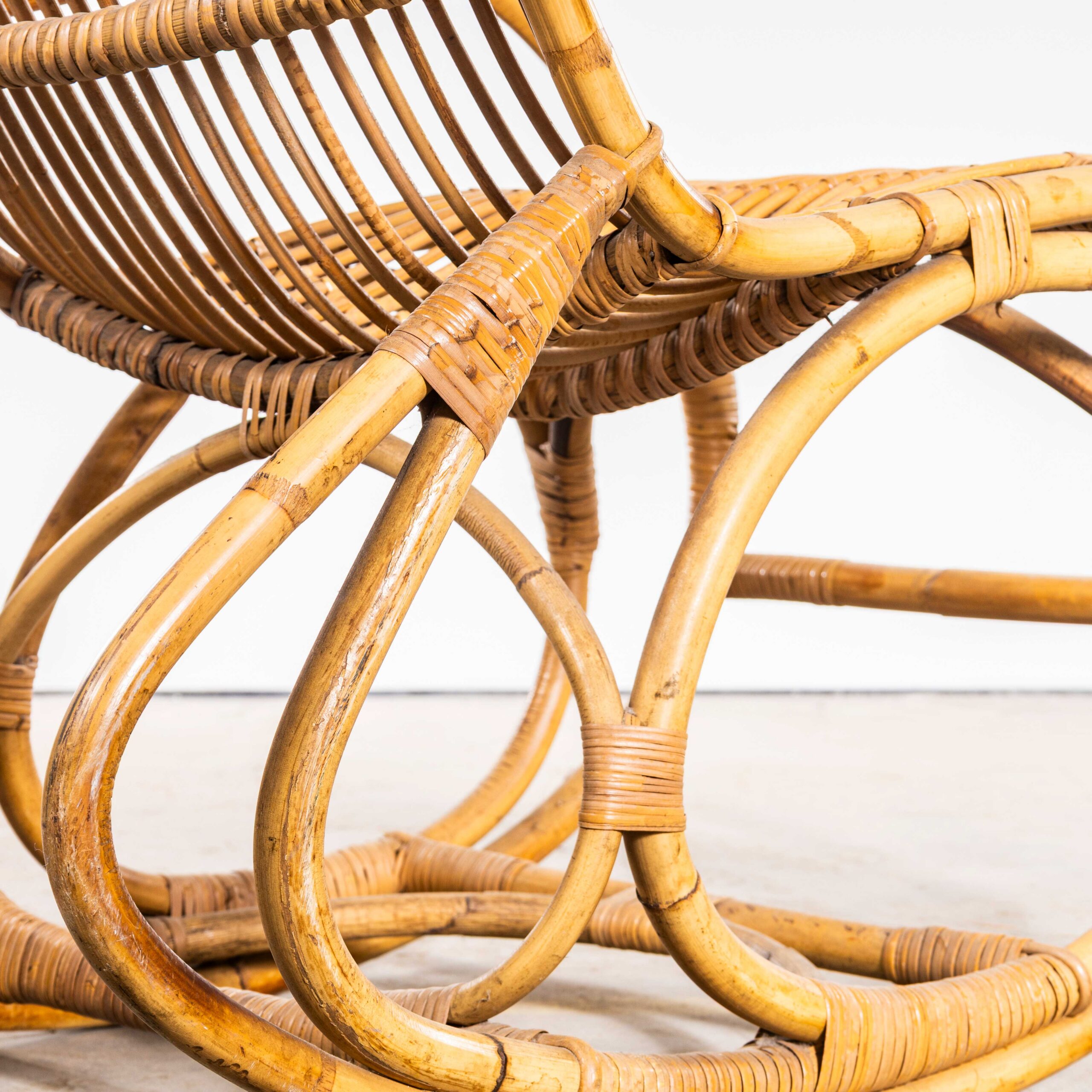 Sedia a dondolo francese in rattan originale degli anni '60. Bella e semplice sedia a dondolo francese in rattan degli anni '60, in ottime condizioni originali, con superbi dettagli della struttura curva.