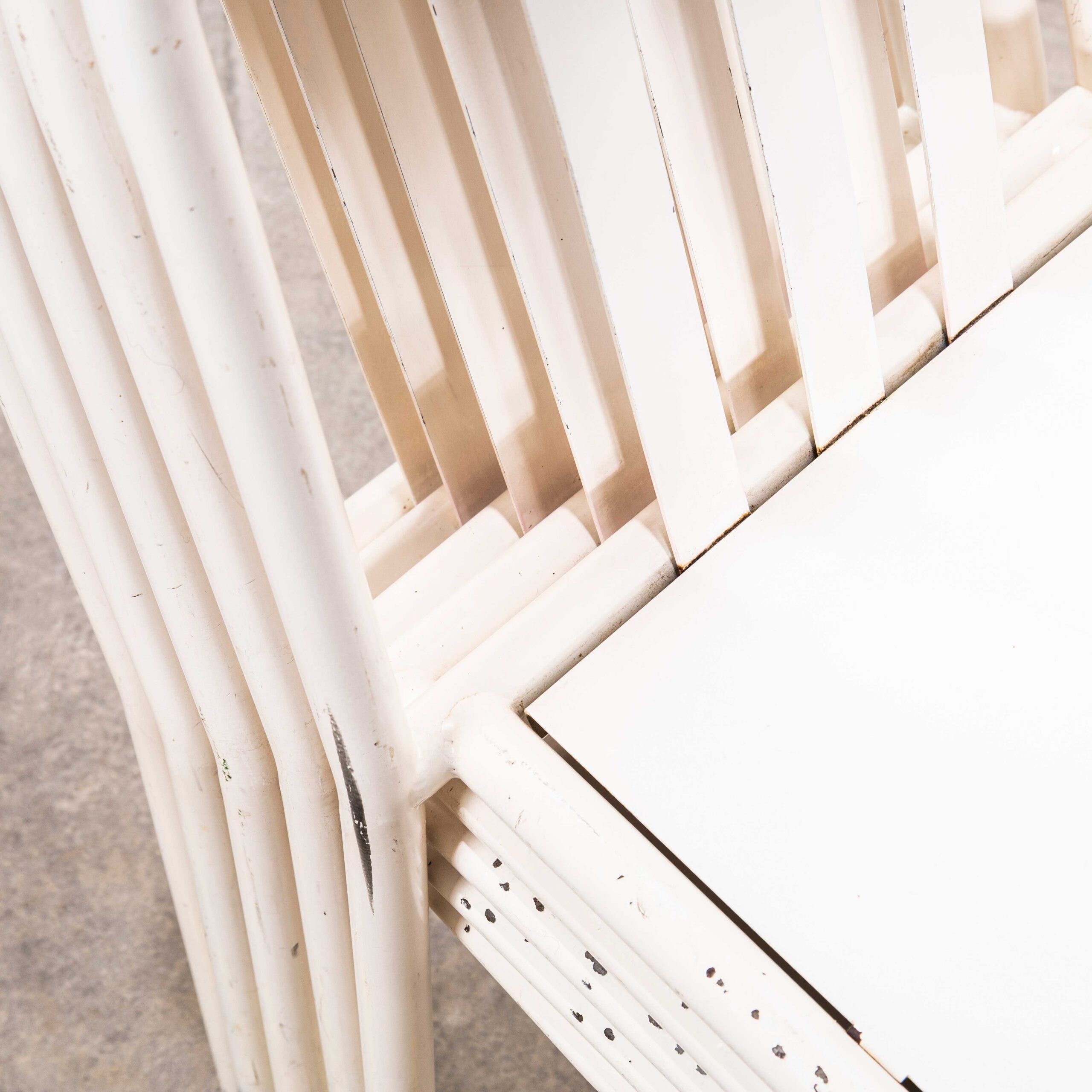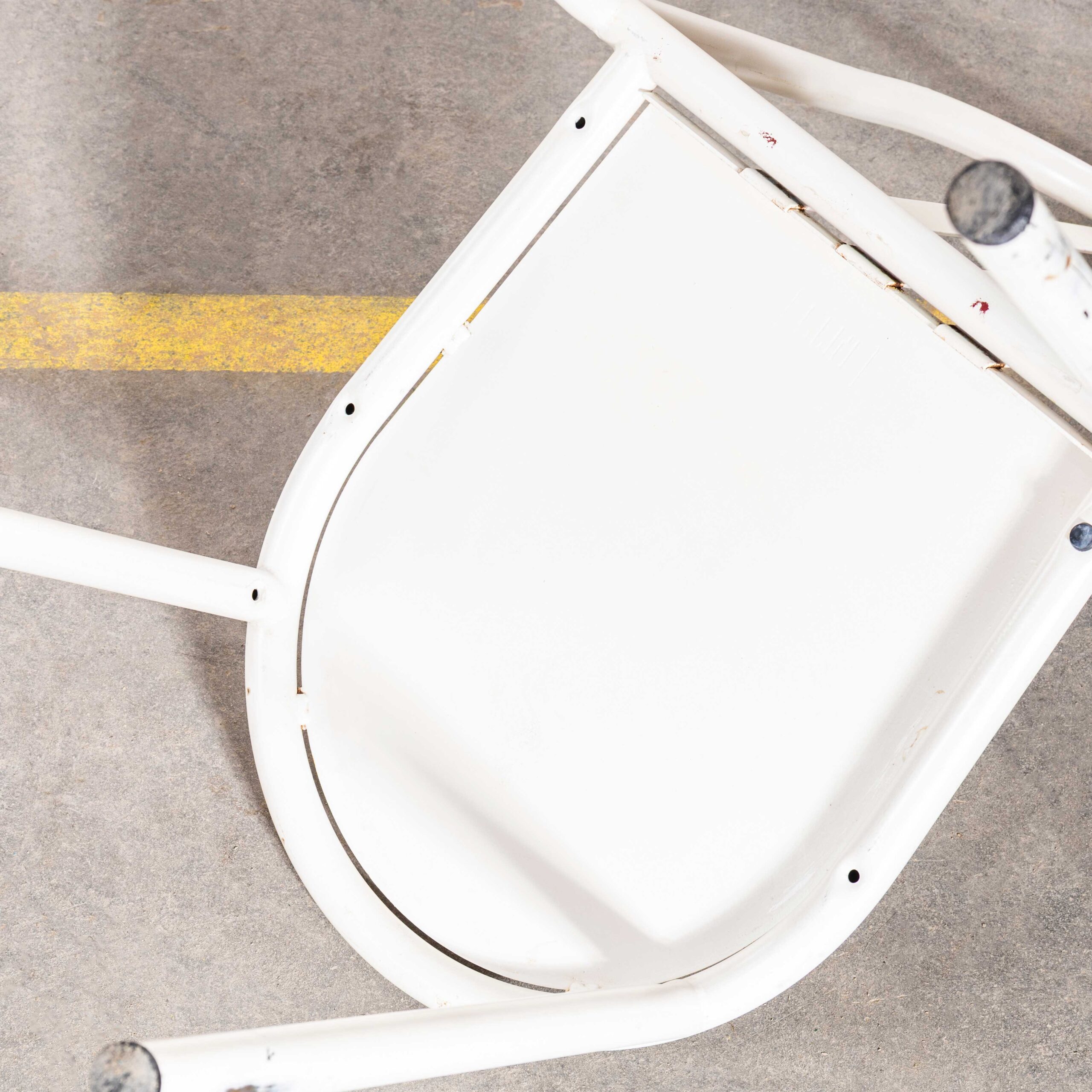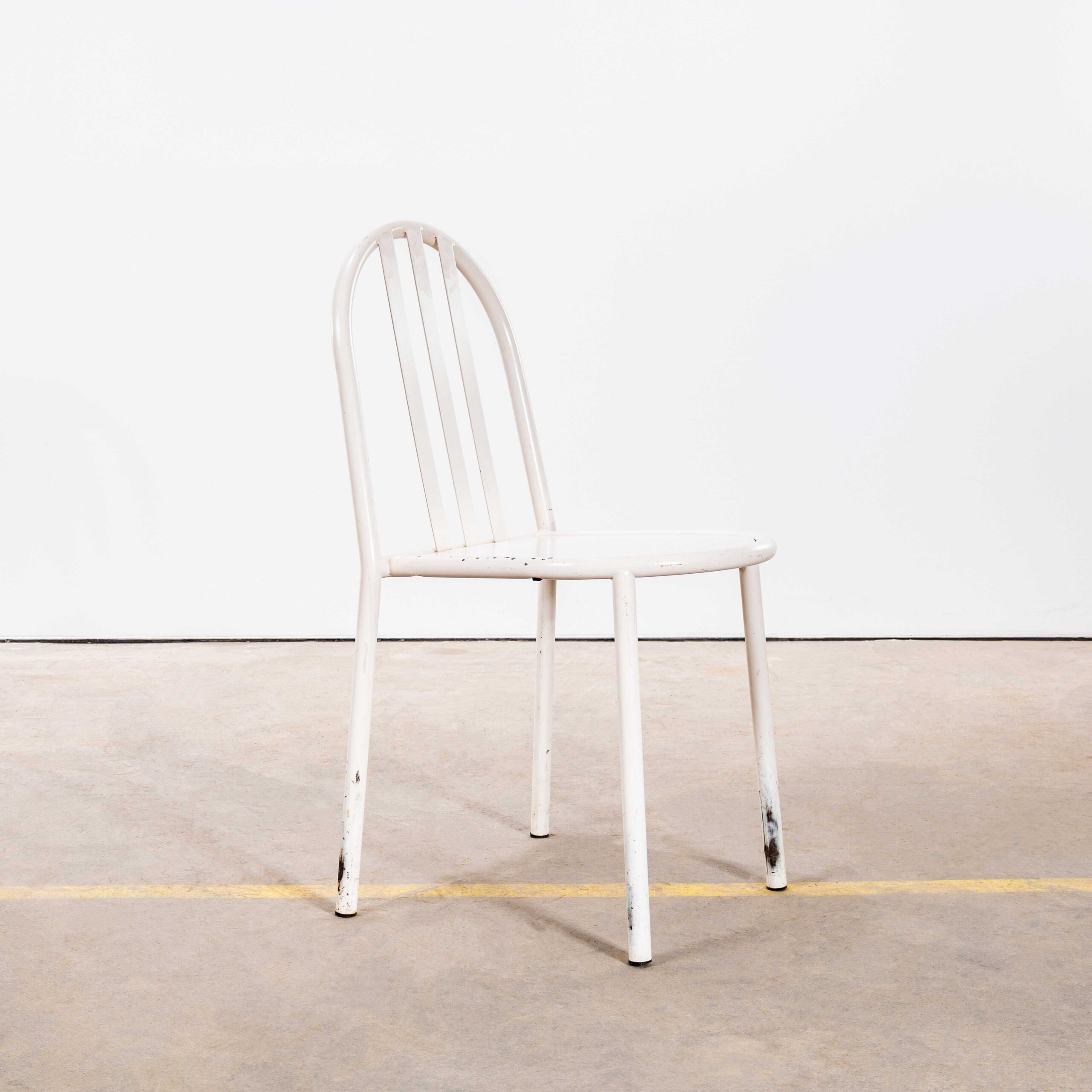 Sedie da pranzo francesi in metallo bianco anni '70 - Set di sei. Queste sedie sono ispirate a Robert Mallet Stevens, designer, architetto e studioso francese. È noto soprattutto per le numerose ville moderniste progettate e costruite a Parigi e dintorni. È relativamente poco conosciuto, poiché il suo archivio fu distrutto (su sua richiesta) al momento della sua morte. Queste sedie in metallo furono prodotte negli anni '70 e sono una copia fedele dell'originale, ma la differenza sta nelle tre barre posteriori e non nelle quattro; la produzione cessò negli anni '50. Essendo un design popolare e pratico, la sua ispirazione sopravvive ancora oggi. Attenzione: molti commercianti affermano di avere gli originali, ma gli originali sono estremamente rari. Tuttavia, si tratta di sedie pratiche e pesanti, adatte sia per interni che per esterni. Il nostro laboratorio le ha pulite e revisionate e sono pronte all'uso.