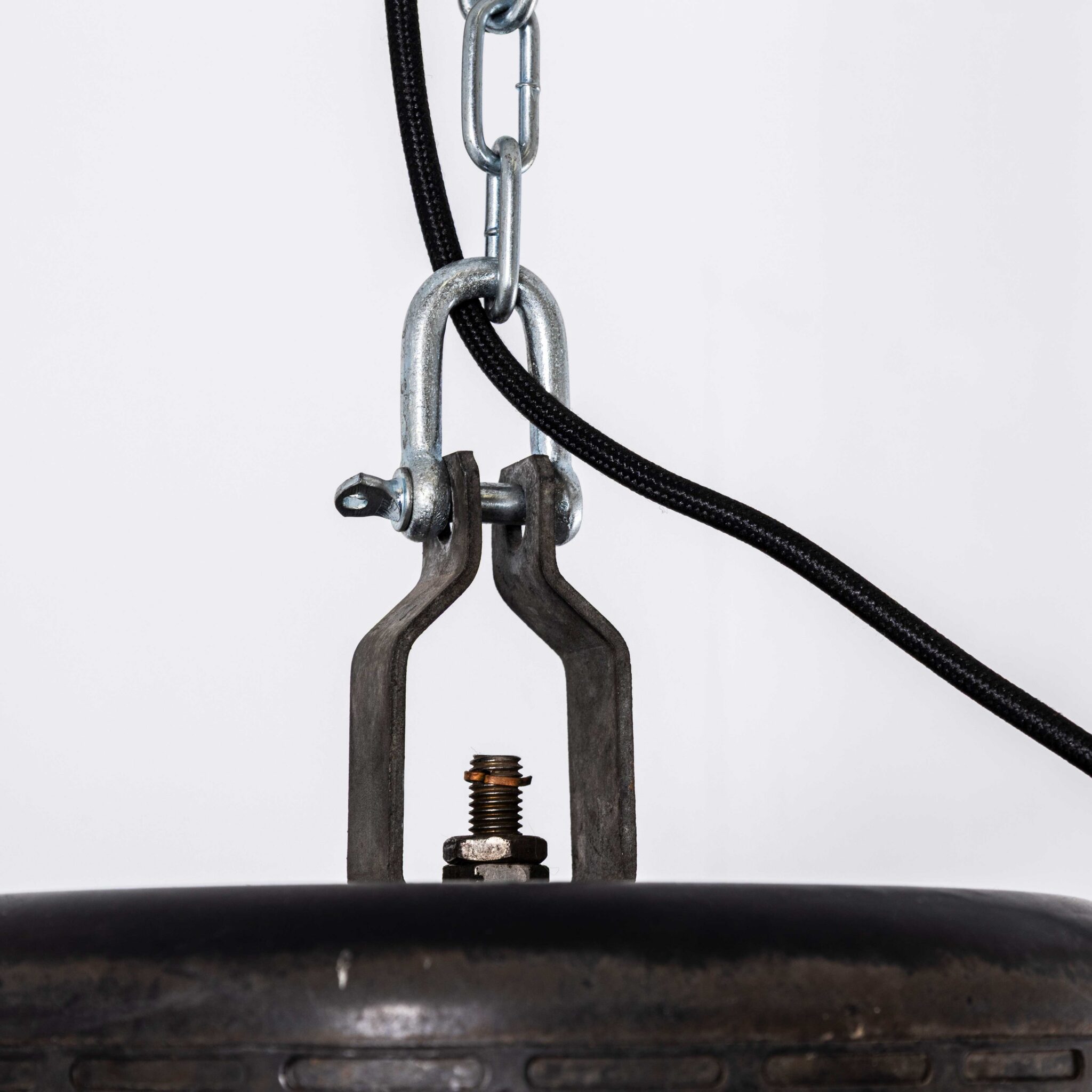 1970’s Large Holophane Industrial Pendant Lamps With Grill Top. Holophane was founded in France in the late 19th Century and they are famous for their inventing and perfecting borosilicate glass reflectors often with intricate cast glass patterns which give a diffused and beautiful light. These lamps are very large scale factory light produced by Holophane and increasingly hard to find. The lamp body is pressed and spun sheet steel and aluminium, the light source is a huge heavy Holophane glass reflector. Each lamp has been cleaned and restored and all electrical components have been removed and replaced with modern European CE standard components to BS EN 60598. Each lamp is individually tested and labelled to BS EN 60598. INCLUDED: Each lamp comes completely wired and ready to install including; 2 metres of chain for hanging the lamps, 2 metres of black fabric covered electrical cable and a ceiling heavy weight eye bolt anchor point as shown. We can supply more than 2 metres of hanging cable, chain etc. as required, please contact us separately to discuss. Each lamp is fitted with a standard E27 threaded lamp holder for which a wide range of modern and vintage style filament bulbs are widely available. We do not currently sell bulbs and recommend LED bulbs 6W maximum. We are specialists in refurbishment of vintage lighting, please contact us with any questions regarding purchase or installation. Please note this is a heavy lamp approximately 25kg and secure hanging points must be used. The lamp is currently wired and fitted for UK and EU compliance. The lamp can be wired for compliance in the US or any global market. Please note the lamps vary in colour and finish as shown