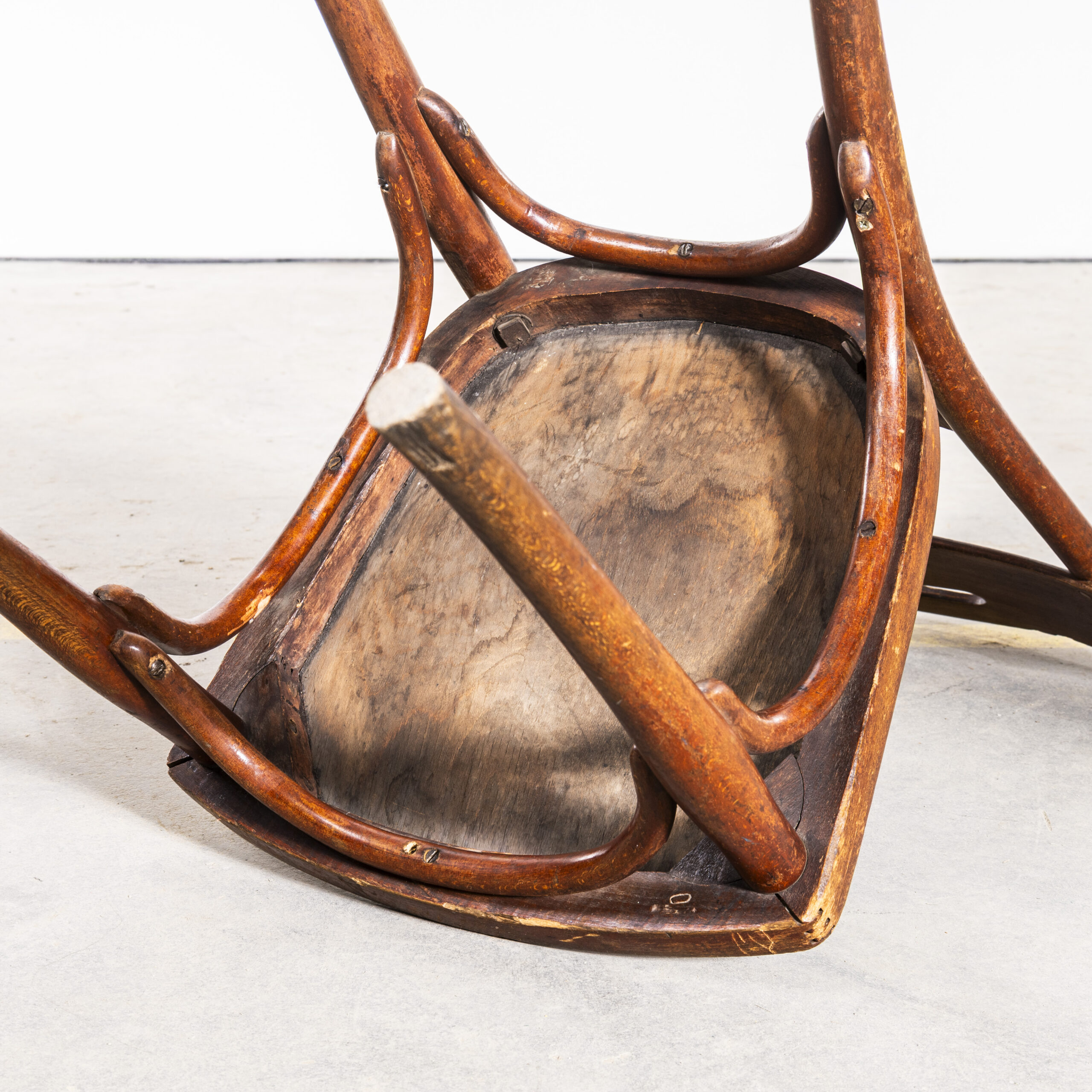 Uitzonderlijke vroege gebogen houten theaterstoelen uit de jaren 40 – set van vier. Thonet, opgericht in het begin van de 19e eeuw door Michael Thonet, vond het proces uit van het stomen van hout onder druk en gebruikte dit om de klassieke gebogen houten stoelen te ontwerpen die nog steeds in productie zijn. In de 19e eeuw had hij een uitgebreid netwerk van winkels in heel Europa en was hij een grote meubelhandelaar. Dit is een prachtige set vroege stoelen met een prachtig ontwerp en vorm, met de originele, met een stencil geschilderde nummers. De stoelen zijn zorgvuldig opgeknapt in onze eigen werkplaatsen en verkeren in goede staat. De stoelen hebben enkele kleine markeringen en geen duidelijk Thonet-label, dus ze zouden van Mundus of een vroege, vergelijkbare fabrikant kunnen zijn, maar we hebben ze diep in Tsjechië gevonden en we twijfelen er niet aan dat ze in een Thonet-fabriek zijn geproduceerd. Eén stoel heeft de klassieke 'O'-markering.