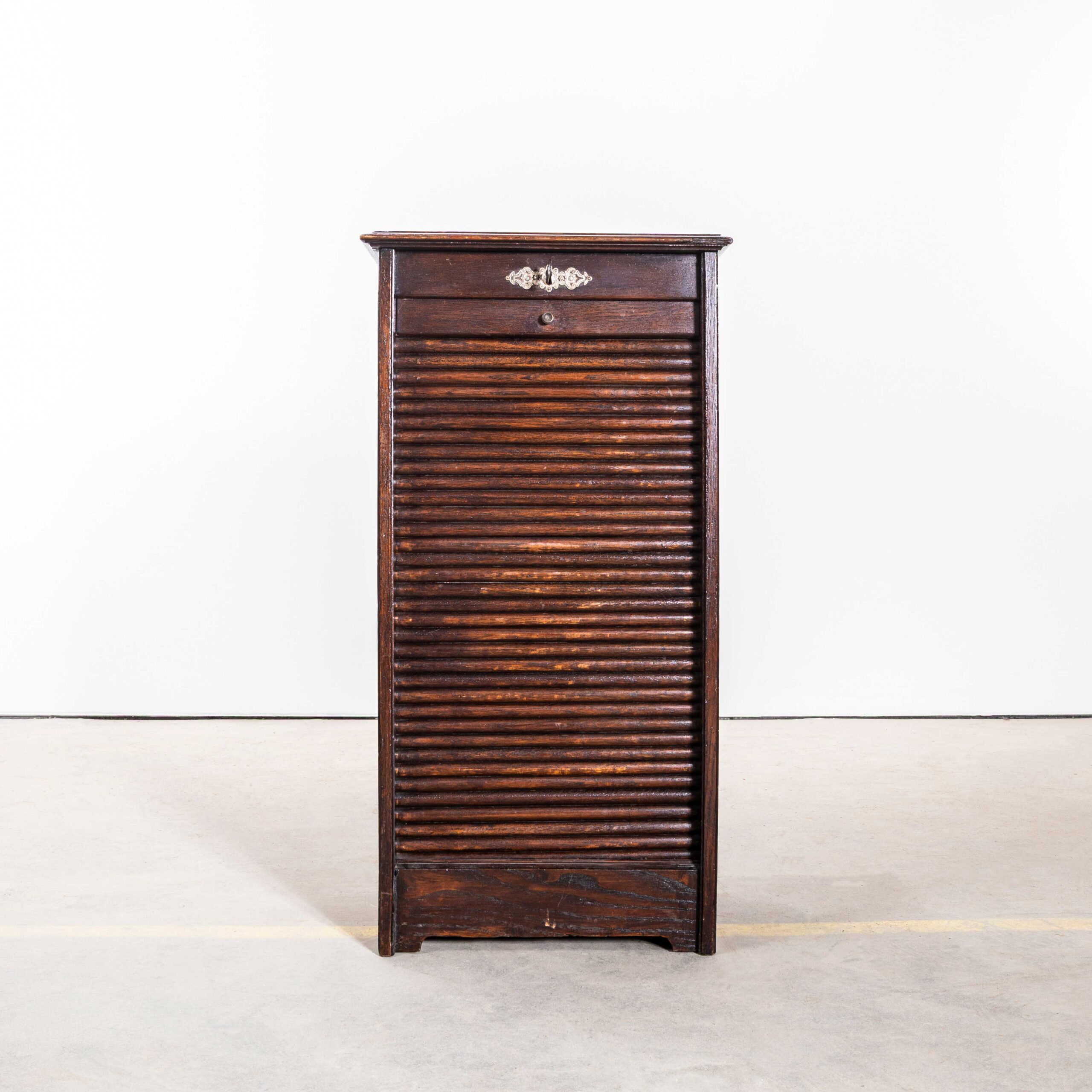 Kleine Franse eikenhouten roldeurkast uit de jaren 1940. Originele Franse massief eikenhouten kast. Massief eikenhouten frame met fraaie details en de originele achterwand met panelen. De kast heeft alle originele messing handgrepen en sleutels en de roldeuren werken perfect. De kast en roldeuren zijn door onze werkplaats nagekeken en onderhouden.