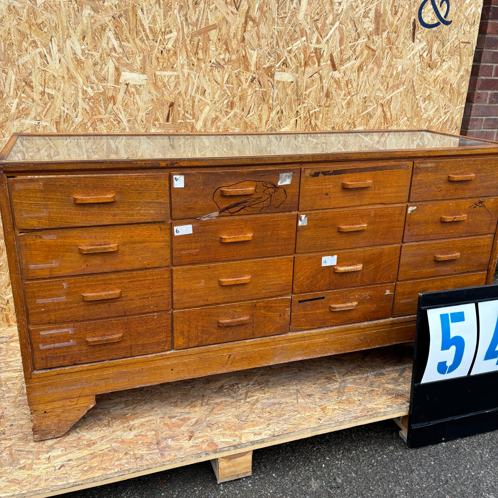 Engelse eikenhouten fourniturenkast uit de jaren 1950 met zestien laden – Dudley & Co.