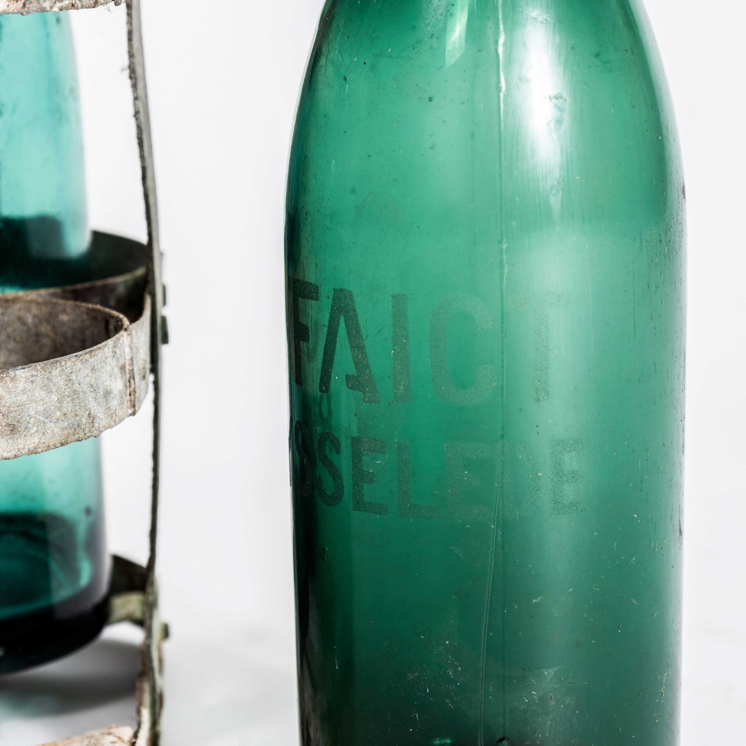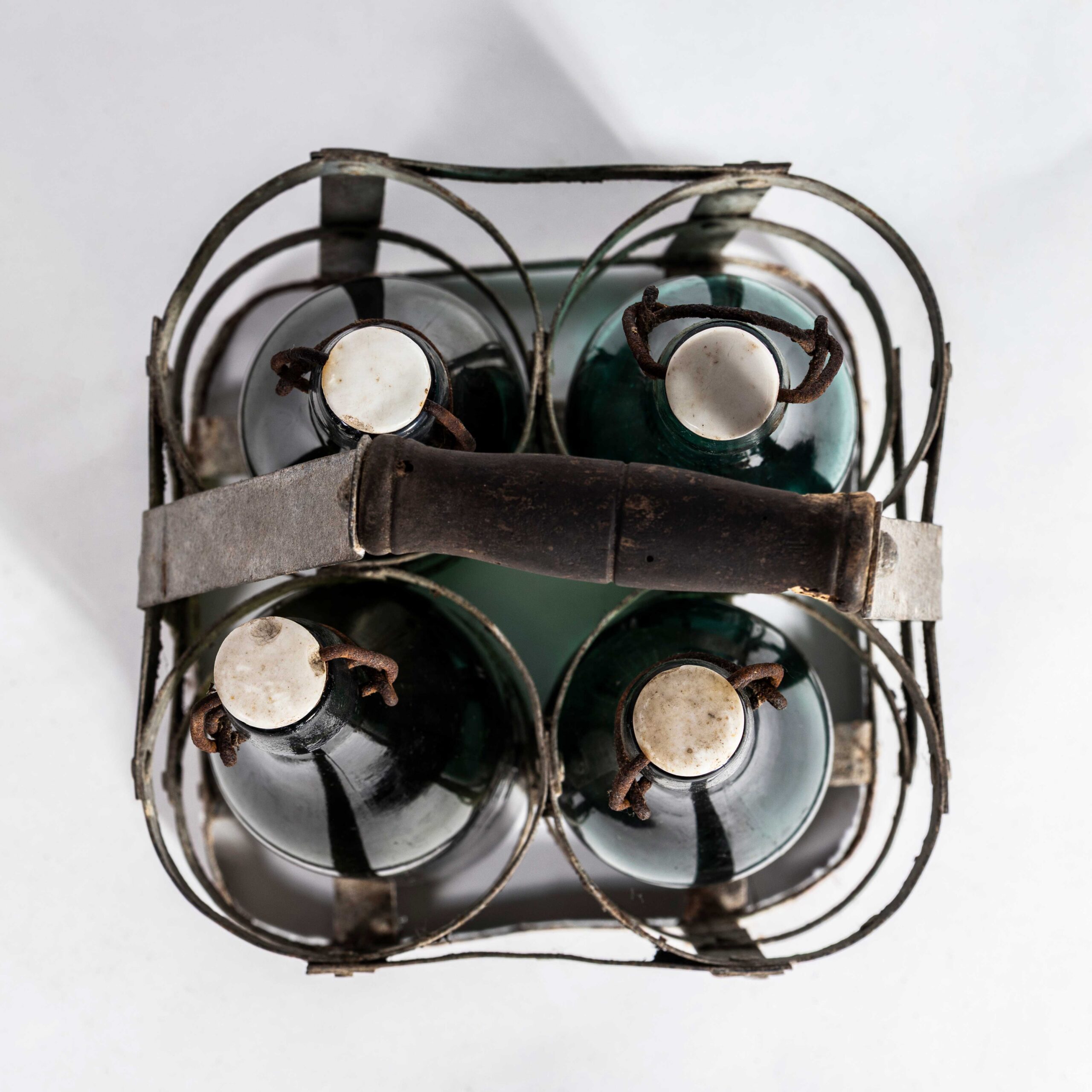 1950’s French Bottle Carrier And Bottles. Original bottle carrier complete with four green glass soda bottles.