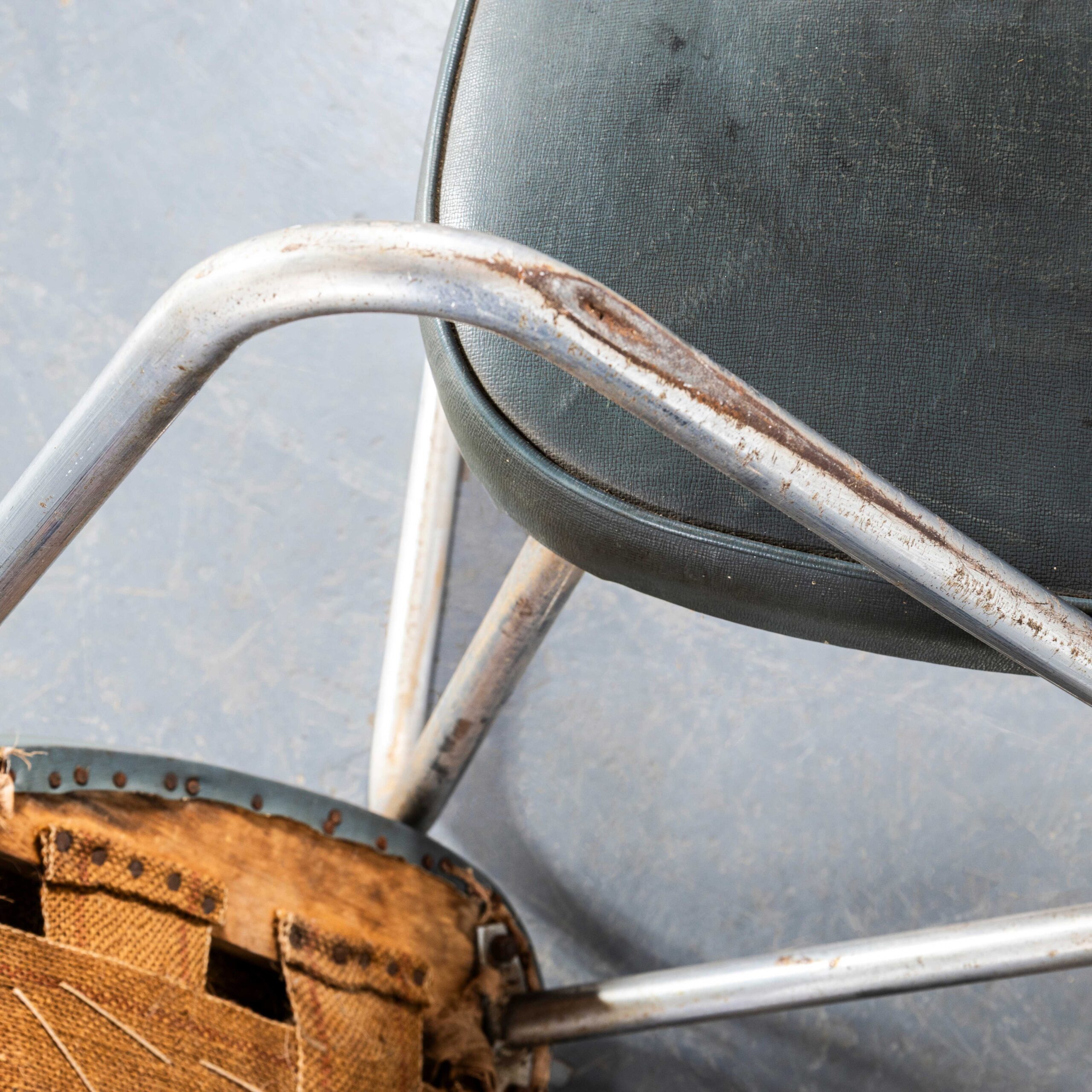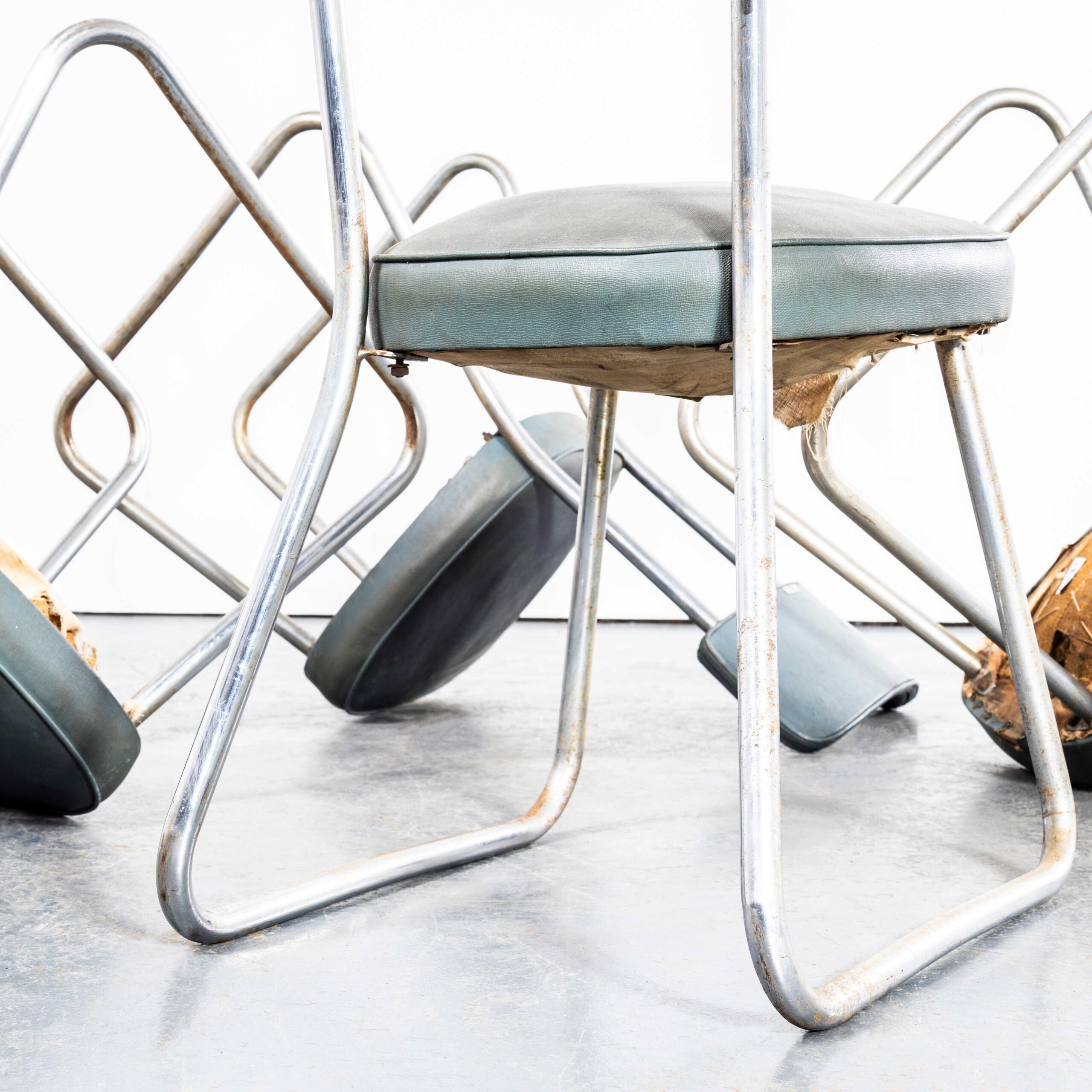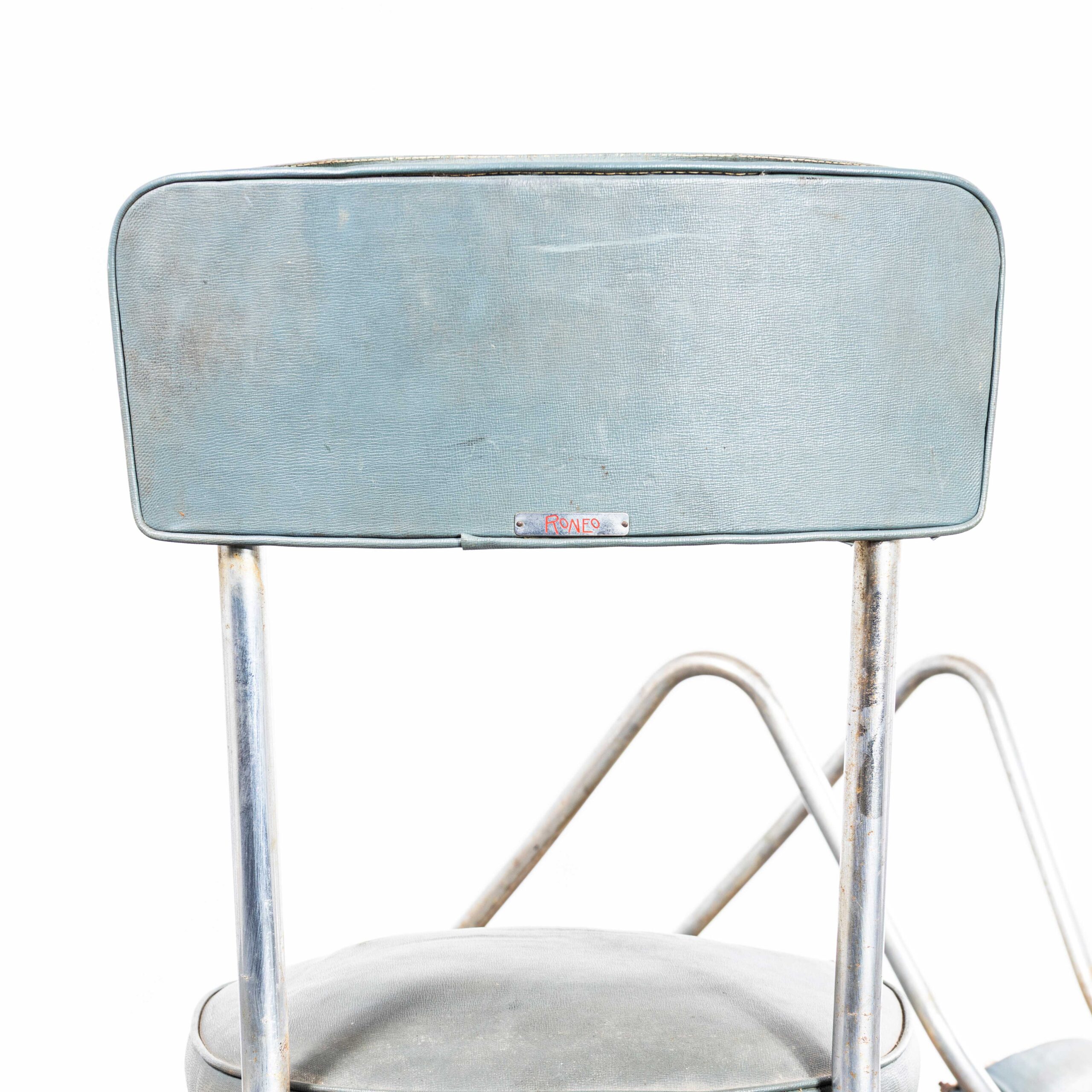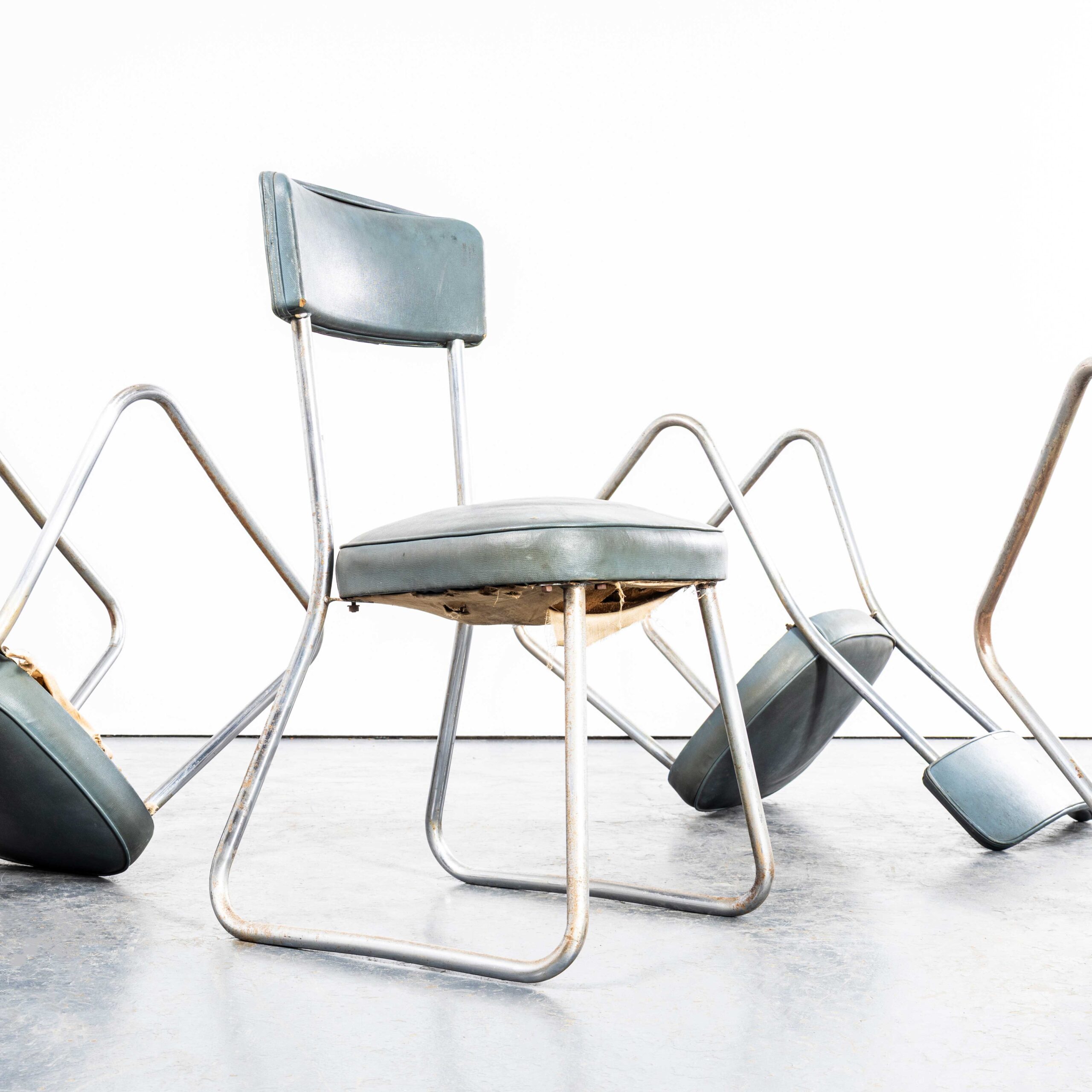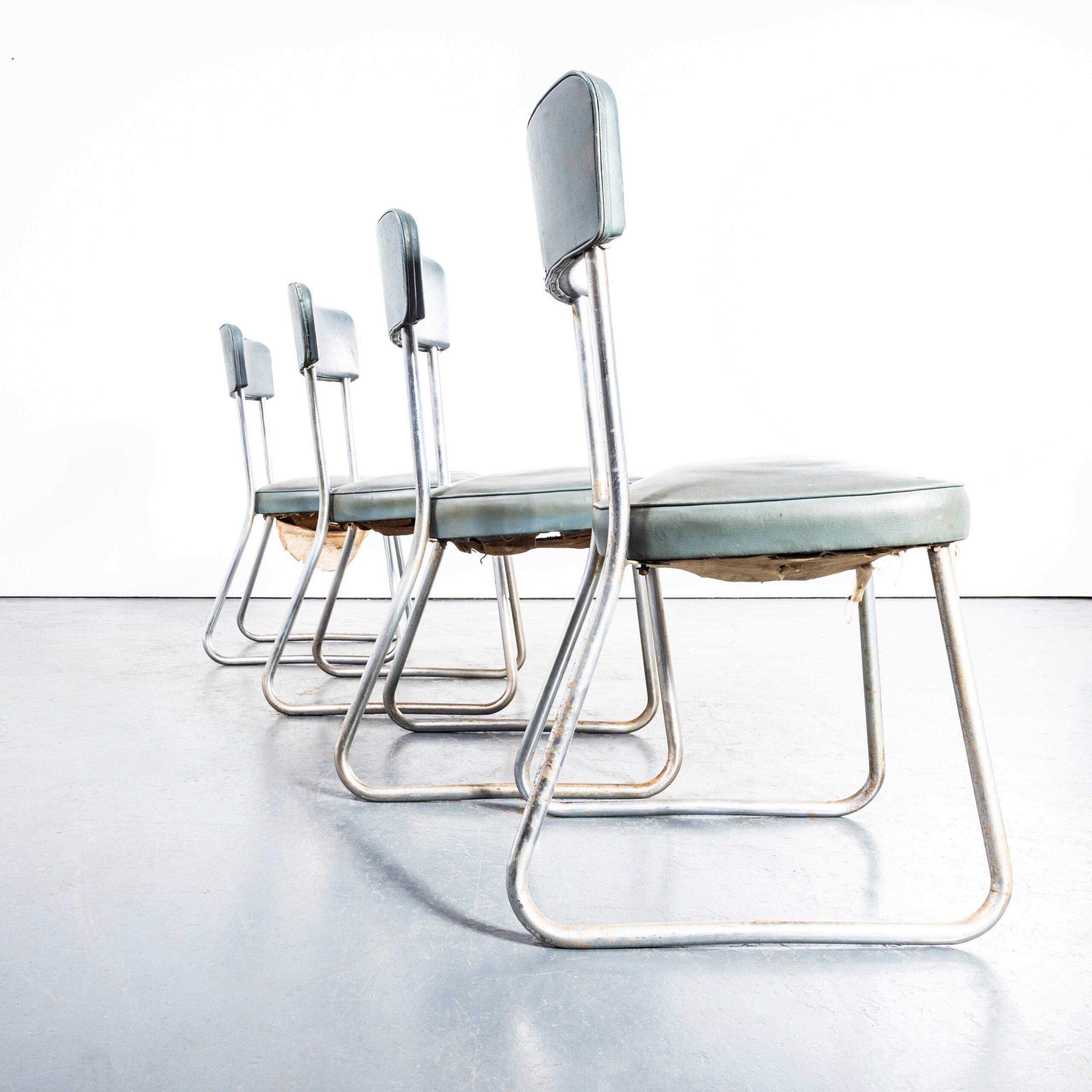 Franse eetkamerstoelen met eendenei-blauwe bekleding uit de jaren 50 van Roneo – set van vier. De term Roneo verwees naar een zeer vroege voorloper van de kopieermachine, een eenvoudige machine die inkt en sjablonen gebruikte om kopieën te maken. Het bedrijf werd opgericht in Engeland en vond later succes in Frankrijk, waar het de markt voor kantoorstoelen en -opslag domineerde. Dit model stoel is een van onze favorieten, met het sledevormige chromen onderstel, de verende zittingen en de vervaagde Rexine-bekleding. Gezien hun leeftijd zijn ze in uitstekende staat, maar we hebben ze wel zo gelaten. Onze werkplaats heeft ze schoongemaakt, dat is alles. De zittingen zijn voorzien van verende spiraalvering die wordt ondersteund door de originele jute singels. De stof die hier en daar hangt, is de originele katoenen onderstof die alleen werd gebruikt om de onderkant af te werken. We hebben ze zo gelaten omdat we van originaliteit houden. Als u de onderkant wilt laten opknappen met een nieuwe katoenen stof, kan ons werkplaatsteam dit voor een kleine vergoeding doen. Comfortabele stoelen vol karakter en zeer moeilijk te vinden. Zithoogte: 46 cm