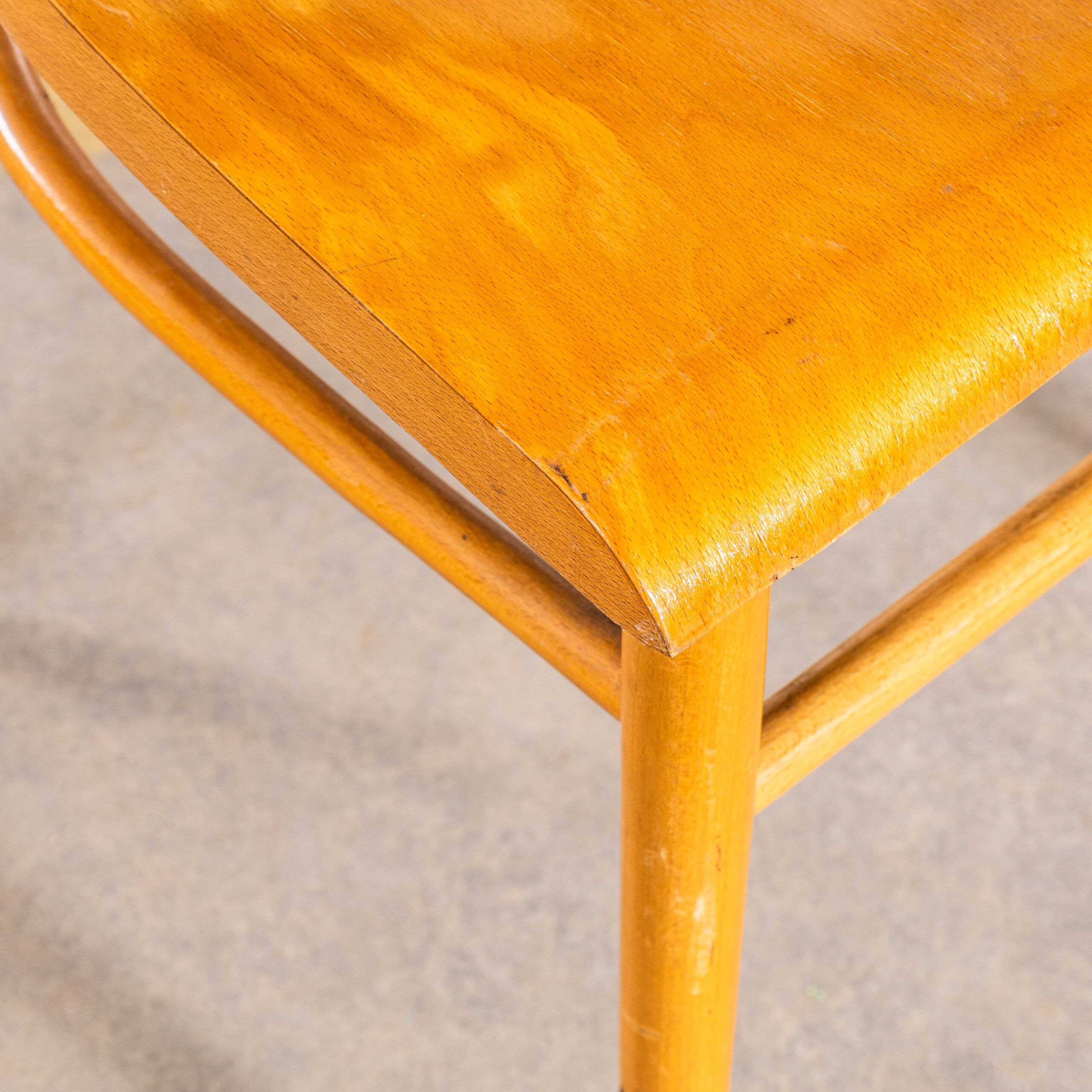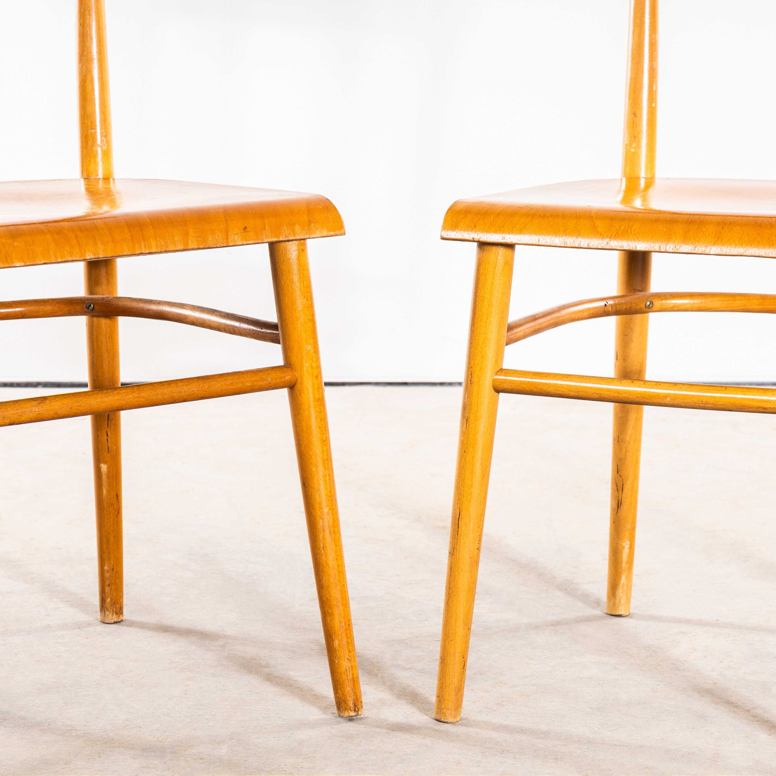 Eetkamerstoelen met honingkleurige eikenhouten bar en vlakke, gebogen zitting uit de jaren 50 – paar. Hoogwaardige eetkamerstoelen van goede kwaliteit, geproduceerd door de beroemde Tsjechische firma Ton, die vandaag de dag nog steeds actief is en prachtige stoelen produceert. Na de Tweede Wereldoorlog werd de Thonet-fabriek in Bystřice pod Hostýnem (Tsjechië) door de staat genationaliseerd tijdens het communisme in Tsjecho-Slowakije. In 1953 werd het bedrijf officieel omgedoopt tot TON, een afkorting voor Továrny na Ohýbaný Nábytek, wat in het Tsjechisch "Gebogen Houten Meubelfabriek" betekent. We hebben de stoelen zorgvuldig gerestaureerd, maar het originele karakter en de patina, waar deze stoel om draait, behouden. Een sterke, stevige stoel met een goede maat en een eigentijds design. We onderhouden elke stoel individueel voordat deze onze werkplaats verlaat en leveren stoelen van uitstekende kwaliteit.