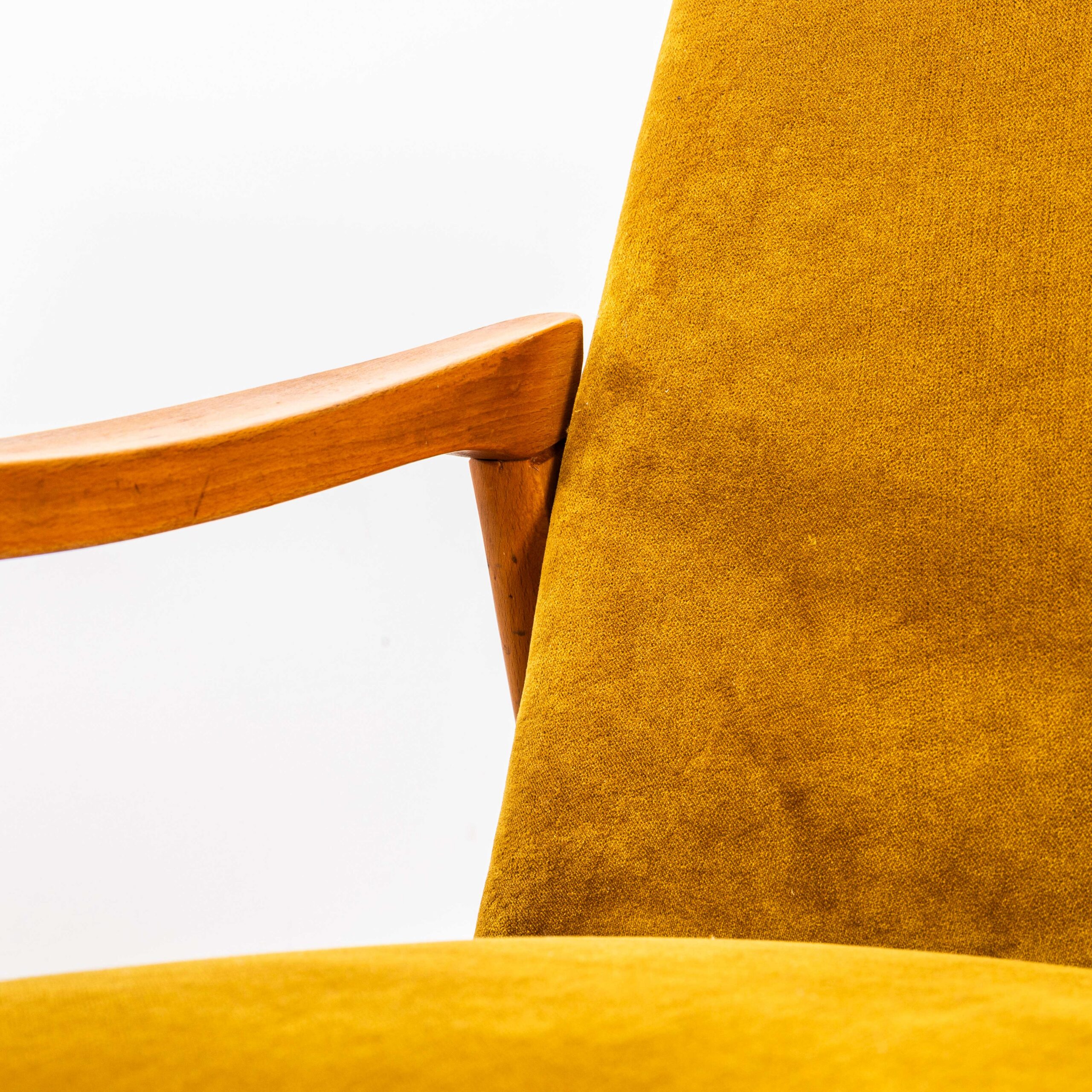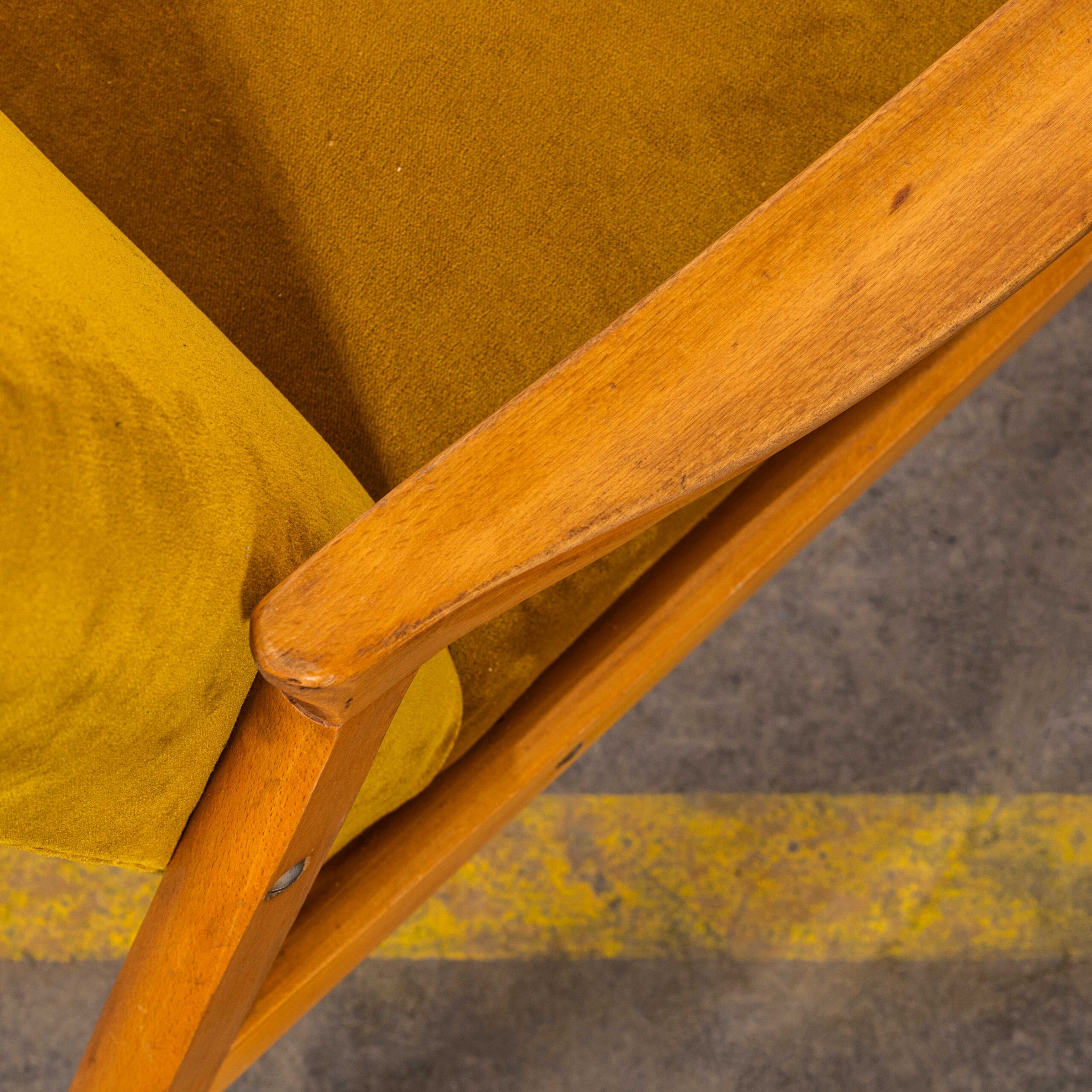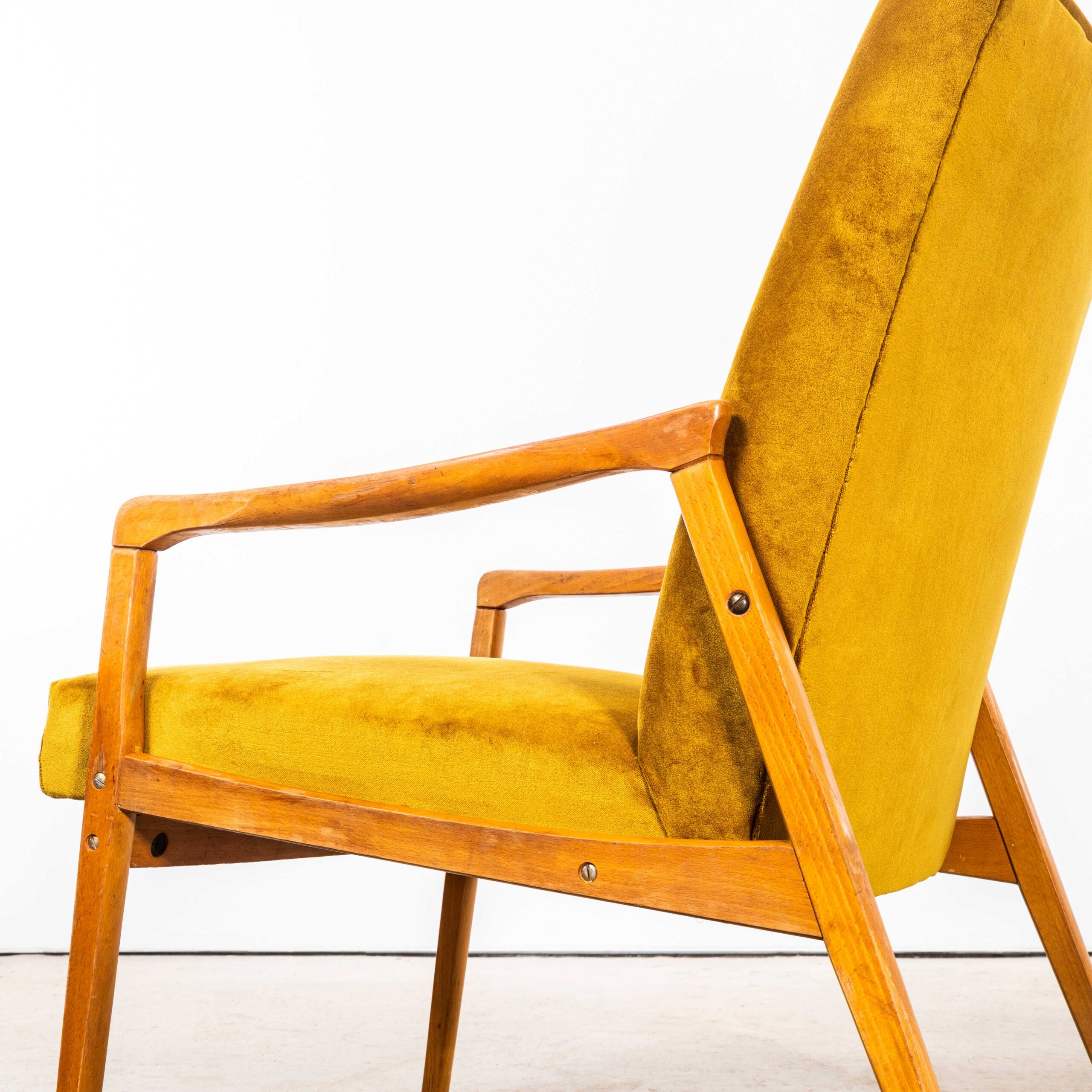 1950’s Jaroslav Smidek Original Re-Upholstered Armchairs In Mustard. Sourced direct in the Czech republic this is one of Smidek’s most elegant designs. We carefully select very original armchairs ensuring the frames are in excellent original condition and then reupholster them. The frame is beech throughout and the arms have been cleaned and waxed but retain their original character. The upholstery is a new mustard cotton velvet which has been reupholstered by us. When reupholstering we inspect all internal components and replace as required. To comply with UK fire regulations the internal components are covered in a flame retardant barrier cloth.