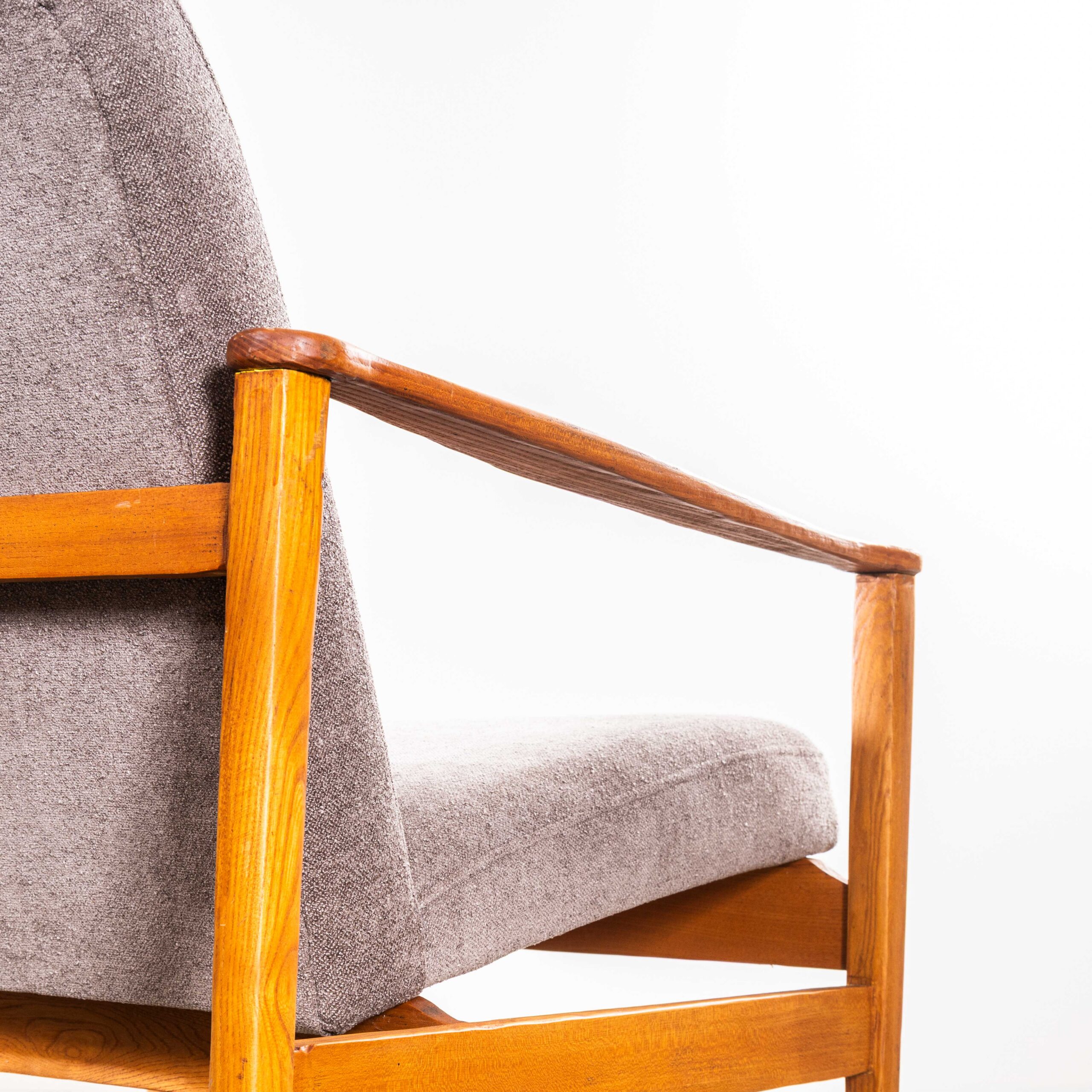 Gestoffeerde grijze fauteuils uit de jaren 50 in mid-century stijl met rechte armleuningen en sierkappen, bekleed met geborsteld katoen. Deze volledig gerestaureerde fauteuils zijn afkomstig uit Scandinavië. Het frame is volledig van beukenhout en de armleuningen zijn gereinigd en in de was gezet, maar hebben hun oorspronkelijke karakter behouden. Het interne beukenhouten frame is zorgvuldig gerestaureerd en het interne schuim en de onderdelen zijn gecontroleerd en waar nodig vervangen door ons werkplaatsteam. Om te voldoen aan de Britse brandveiligheidsvoorschriften zijn de interne onderdelen bekleed met een brandvertragende stof. We hebben deze gloednieuwe grijze stof van geborsteld katoen geselecteerd en de stoelen volledig opnieuw gestoffeerd.