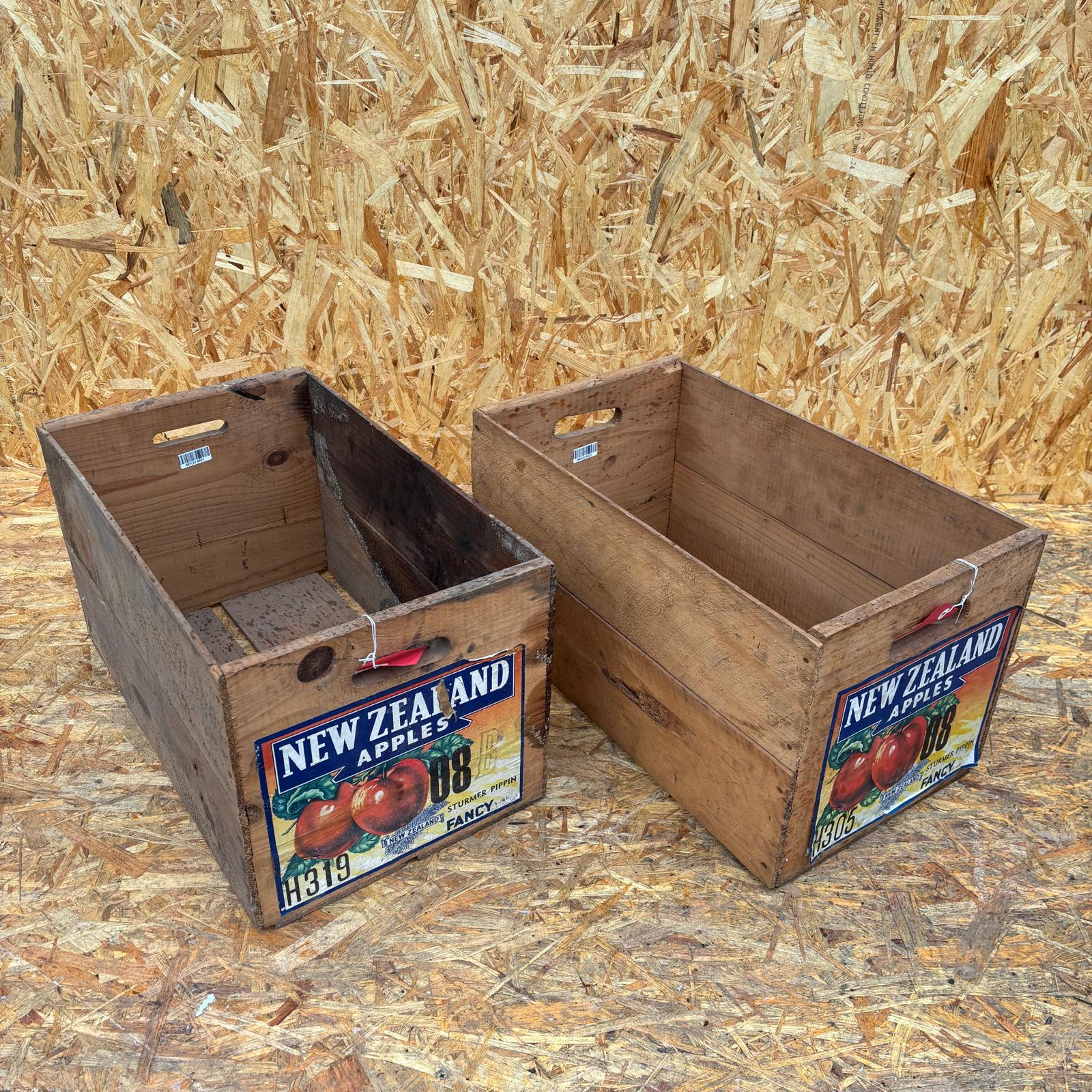 Nieuw-Zeelandse appelkisten uit de jaren 1950 – Set van twee. Goede, authentieke fruitkisten met duidelijke merkaanduiding.