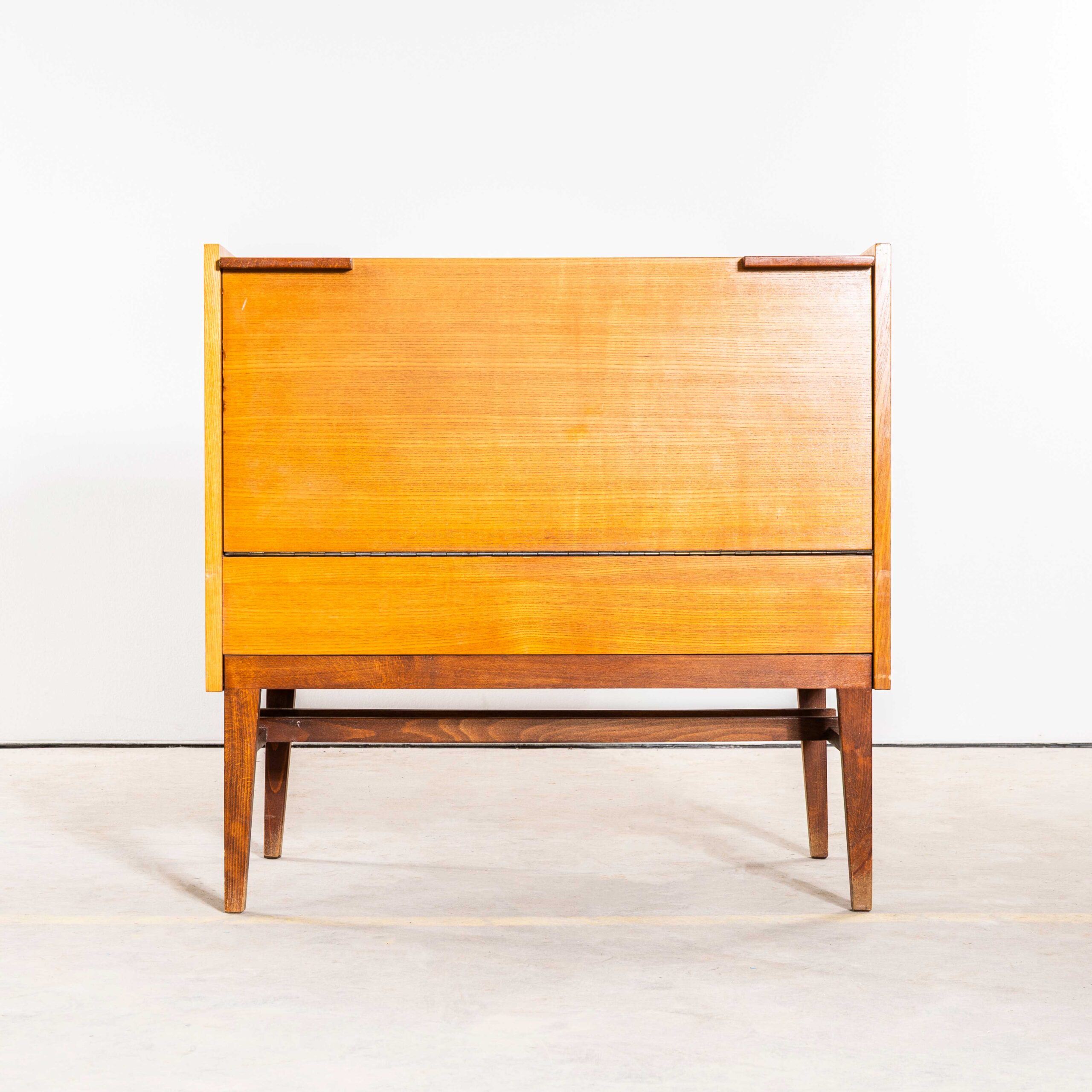 Originele berkenhouten dekenkist uit de jaren 50 – klein kastje van Tatra Pravenec. Geproduceerd door Tatra Pravenec in Tsjechië. Tsjechisch design zal altijd verbonden blijven met de Bauhaus-beweging, die een generatie design en industriële productie in Tsjechië inspireerde, met name in de tweede helft van de 20e eeuw, met producenten als Ton en Up Zavody en vele anderen. Tatra Pravenec begon oorspronkelijk als producent en leverancier van stoelen van hout en gebogen hout, maar ontwikkelde zich in de bloeiperiode van de naoorlogse meubelproductie tot een verfijnde, onafhankelijke producent. Dit is een hoogwaardige, praktische dekenkist die gebruikt kan worden als opbergkast of console. Het kastje verkeert in uitzonderlijk originele staat en is met zorg gerestaureerd in onze eigen werkplaats. Ontworpen door Frantisek Jirak.
