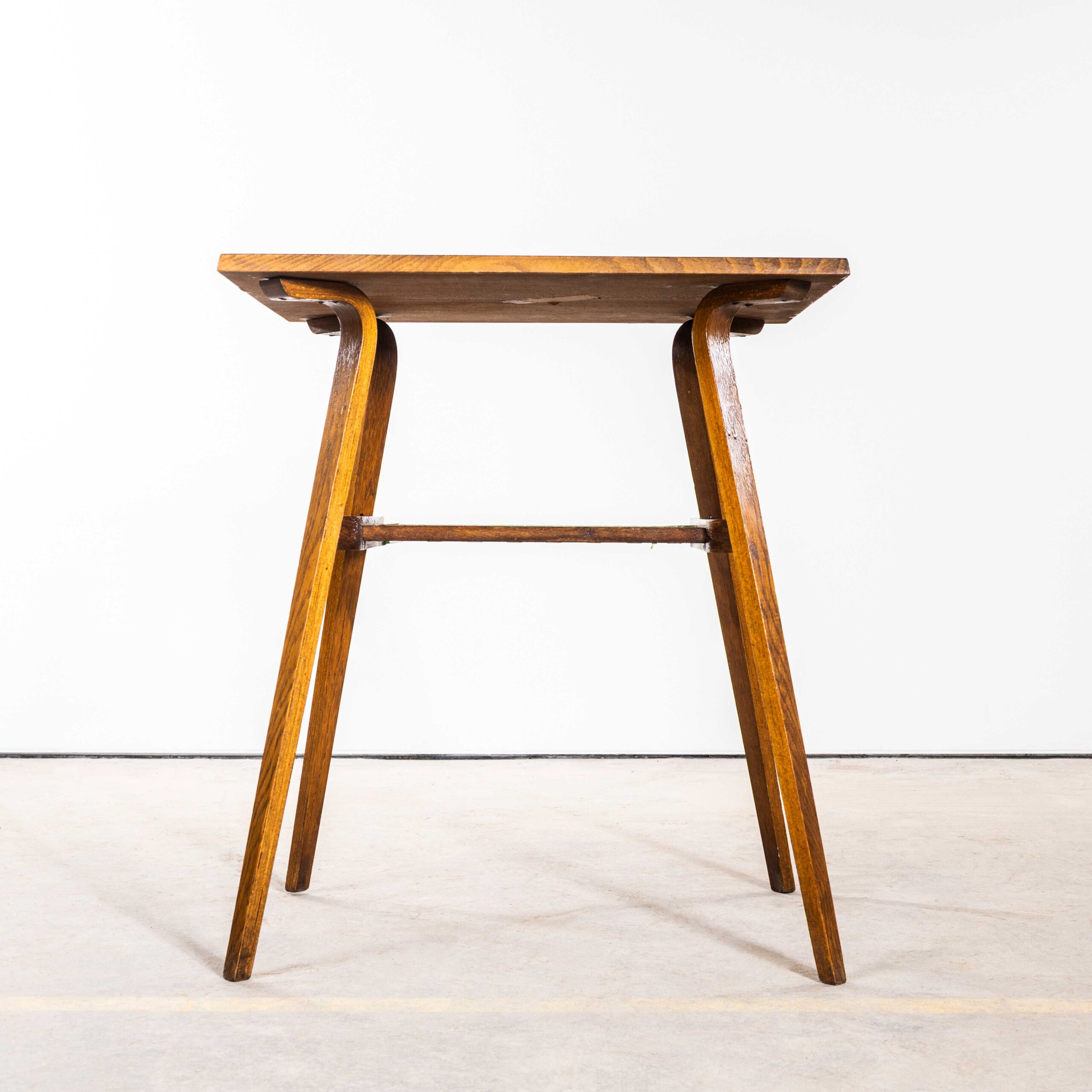 Vierkante, hoekige salontafel uit de jaren 50 met geweven plank. Een echt bijzondere en karaktervolle kleine bijzettafel, gemaakt van eikenhout, met een praktische lage plank en sierlijke, gevormde poten en details. De plank is gemaakt van het originele geweven nylonkoord. De tafel is in goede staat. Onze werkplaats heeft de tafel gereinigd en onderhouden; hij is stevig, stabiel en klaar voor gebruik.