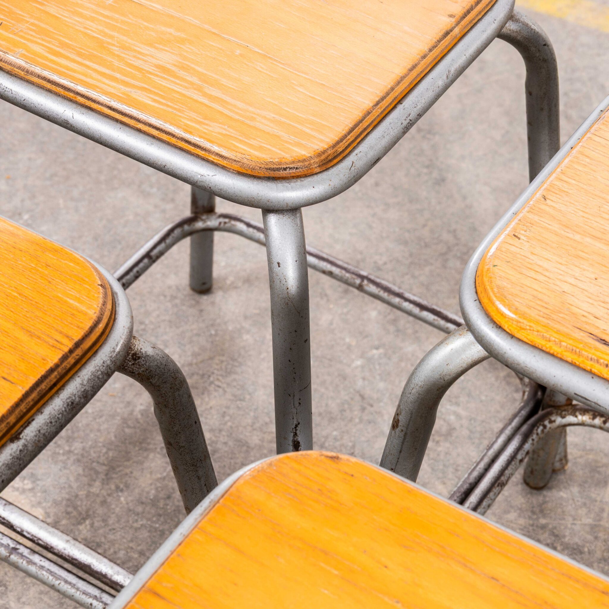 Grijze stapelbare Mullca-krukken uit de jaren 60. Mullca is een van onze favoriete bedrijven. In 1947 richtten Robert Muller en Gaston Cavaillon het bedrijf op, dat later misschien wel de beroemdste Franse schoolstoel ontwikkelde. Helaas bestaat het bedrijf niet meer, maar vintage stoelen, krukken en bureaus zijn nog steeds te vinden. Deze krukken stammen uit de vroege jaren 60 en verkeren in uitzonderlijke staat. Ze zijn super comfortabel en stijlvol. We onderhouden en restaureren elke kruk voordat deze onze werkplaats verlaat en leveren uitstekende kwaliteit.