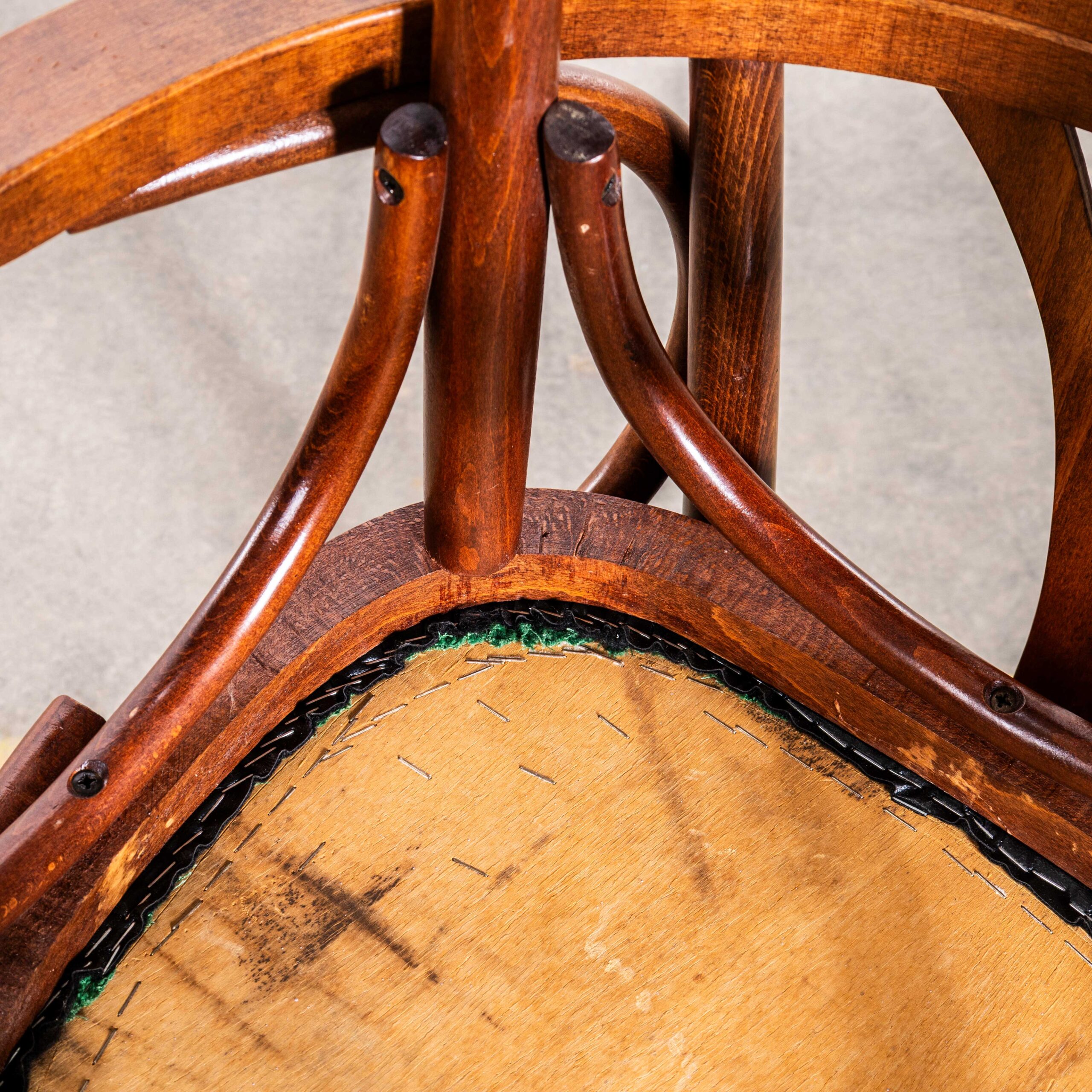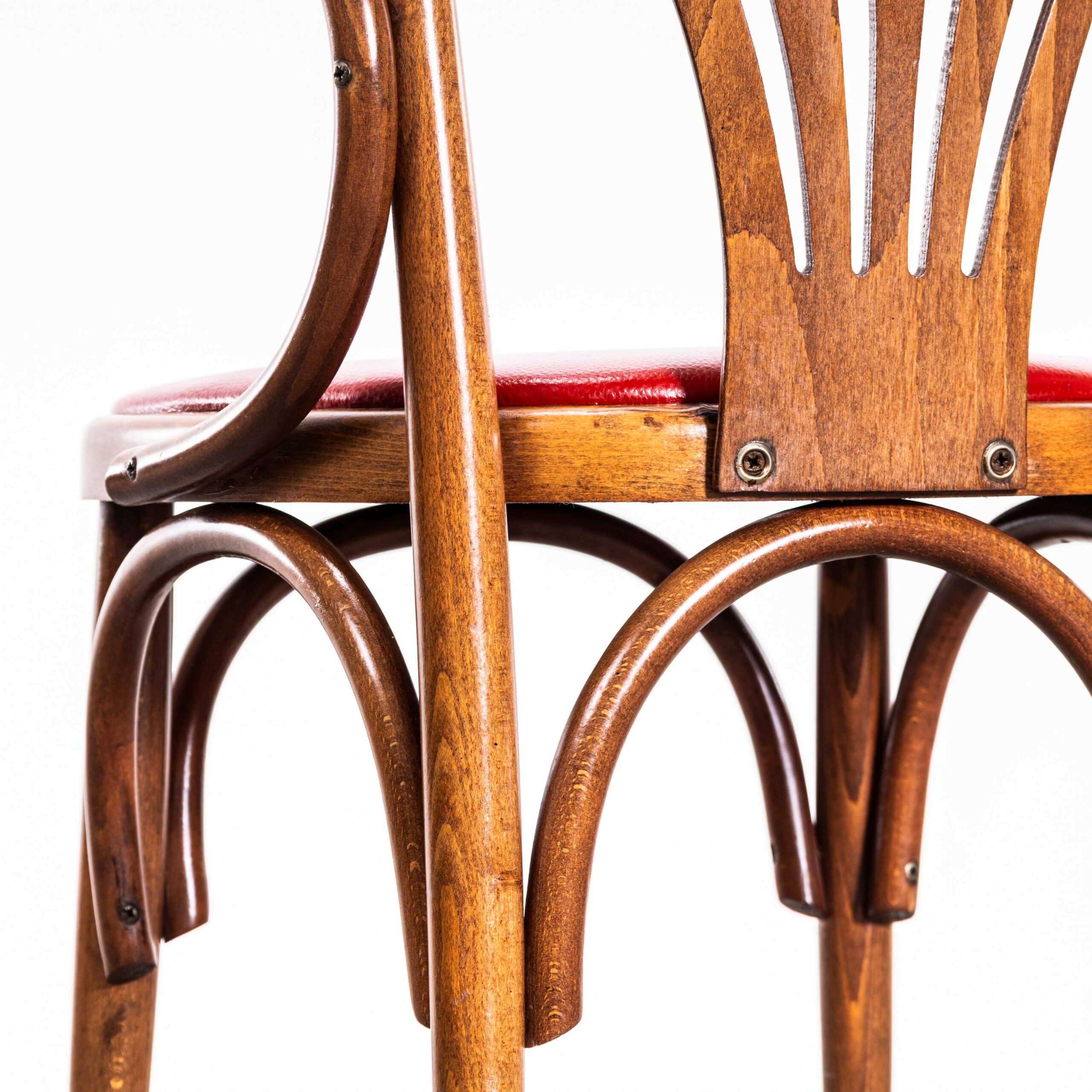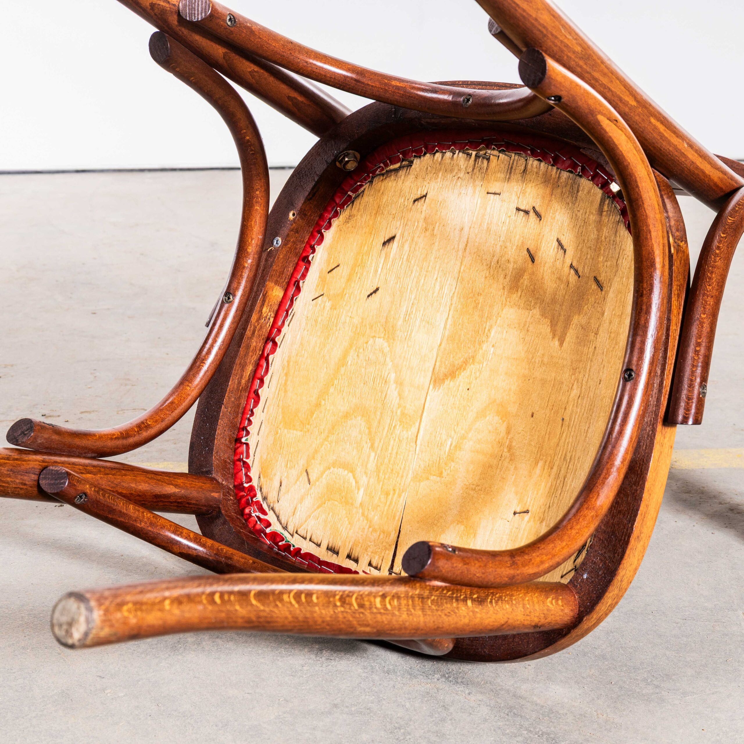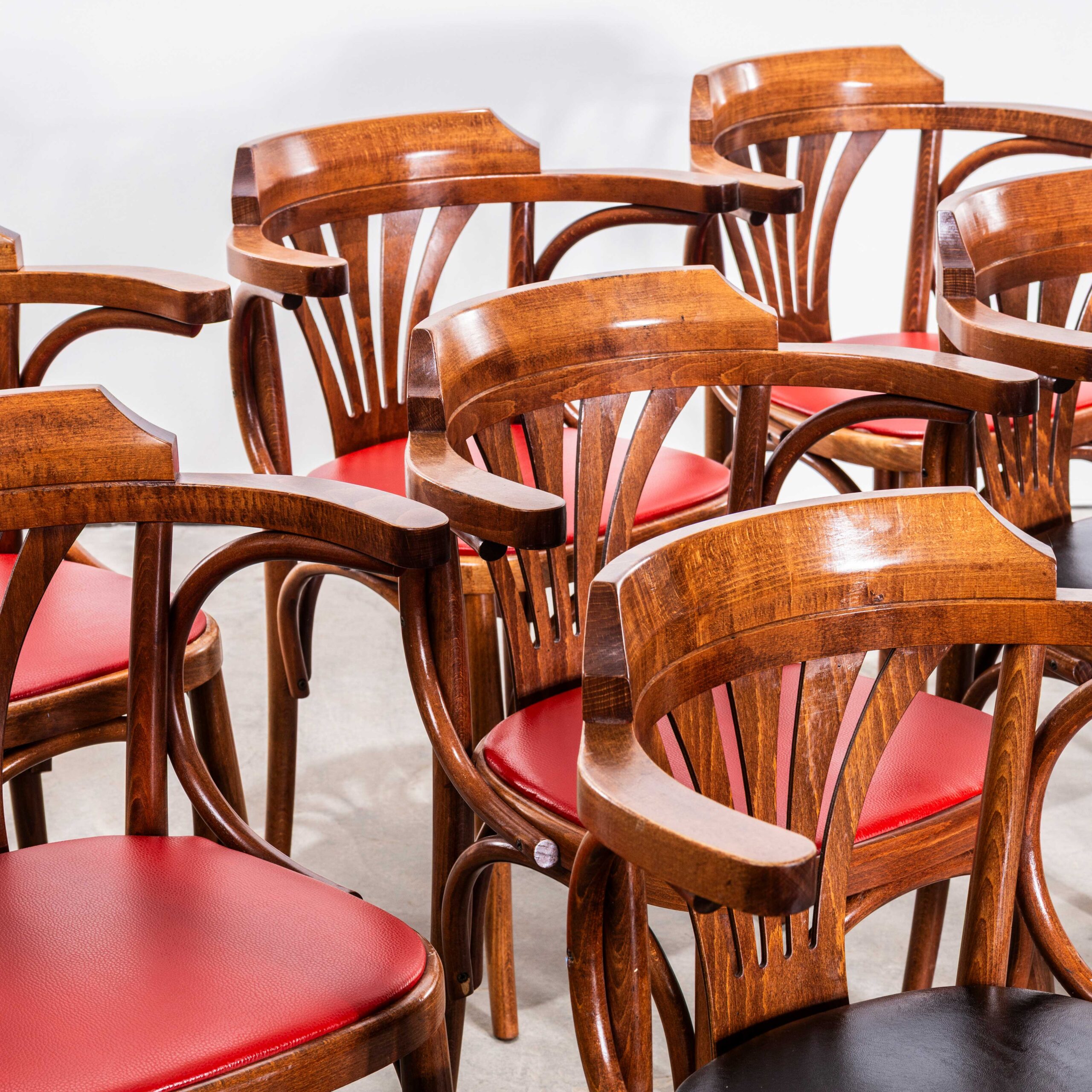 Set van acht rode, gestoffeerde eetkamerstoelen met waaiervormige armleuningen uit de jaren 70. Deze klassieke, hoogwaardige stoelen zijn gemaakt van gebogen hout met een typische waaiervormige armleuning in een rijke, warme eikenkleur. De stoelen zijn vervaardigd in Oost-Europa van massief, stoomgebogen beukenhout en zijn zwaar en robuust, met een mooie gebruikssporen en een authentieke uitstraling. De stoelen zijn bekleed met een stevige en praktische kunstleren bekleding. Onze werkplaats heeft elke stoel nagekeken en ze zijn direct klaar voor gebruik. Vanwege de Britse brandveiligheidsvoorschriften mogen de stoelen niet in het Verenigd Koninkrijk worden verkocht, tenzij ze opnieuw gestoffeerd worden. Dit kan door onze werkplaats worden gedaan. Let op: zes stoelen hebben een rode bekleding en twee een zwarte.