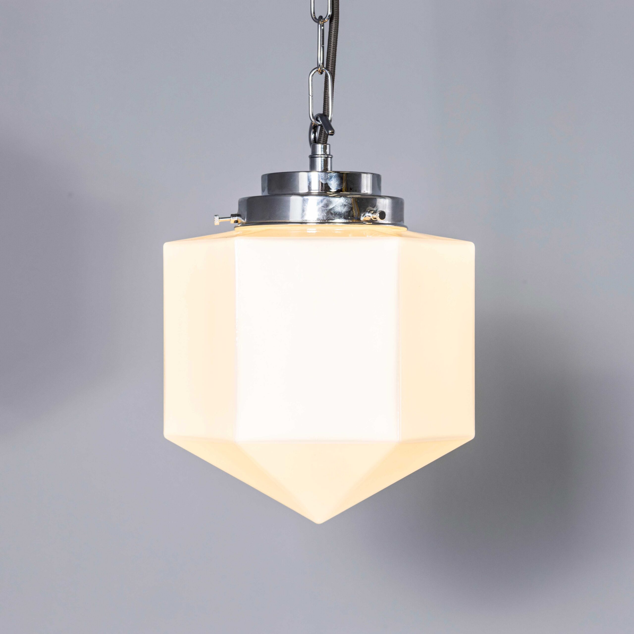 Contemporary Mouth Blown Plumb Bob Opaline Pendant Lamp. These lamps are made especially for using the original 1930’s steel moulds, they are made in the original way in the original Czech factory using triple cased glass to create true opaline with a heavy weight thick glass that gives an almost milk glass character. The gallery tops and ceiling cup are high quality chrome. Each lamp has been built by us with modern European CE standard components to BS EN 60598. Each lamp is individually tested and labelled to BS EN 60598. INCLUDED: Each lamp comes completely wired and ready to install including; 2 metres of chrome chain for hanging the lamp, 2 metres of grey fabric covered electrical cable and a ceiling hook as shown. The lamp is fitted with a standard E27 threaded lamp holder for which a wide range of modern and vintage style filament bulbs are widely available. We do not currently sell bulbs and recommend LED bulbs 6W maximum. We can also supply more than 2 metres of hanging cable/chain as required, please contact us separately to discuss. The lamp is currently wired and fitted for UK and EU compliance. The lamp can be wired for compliance in the US or any global market. The listing is for one lamp.