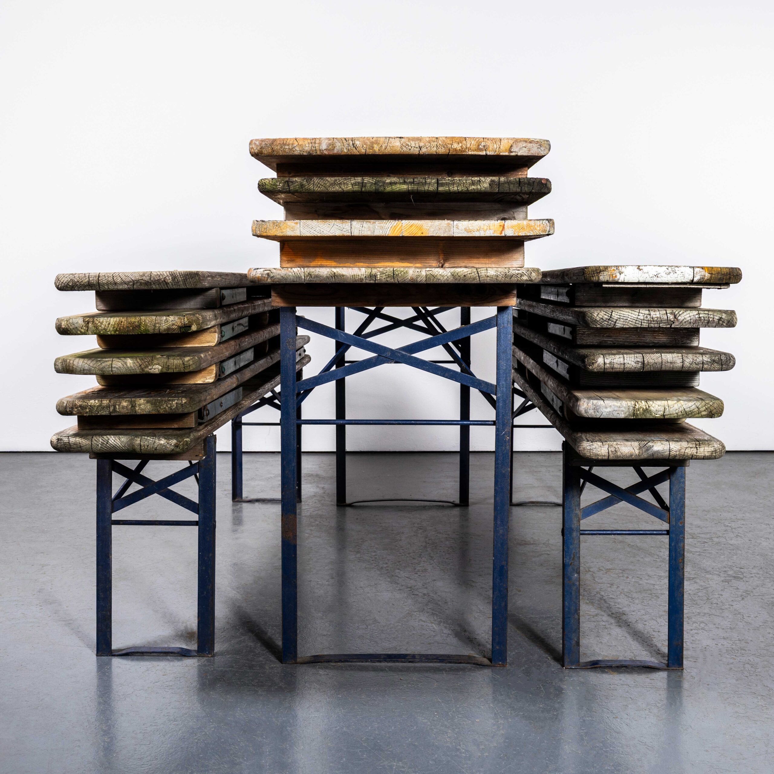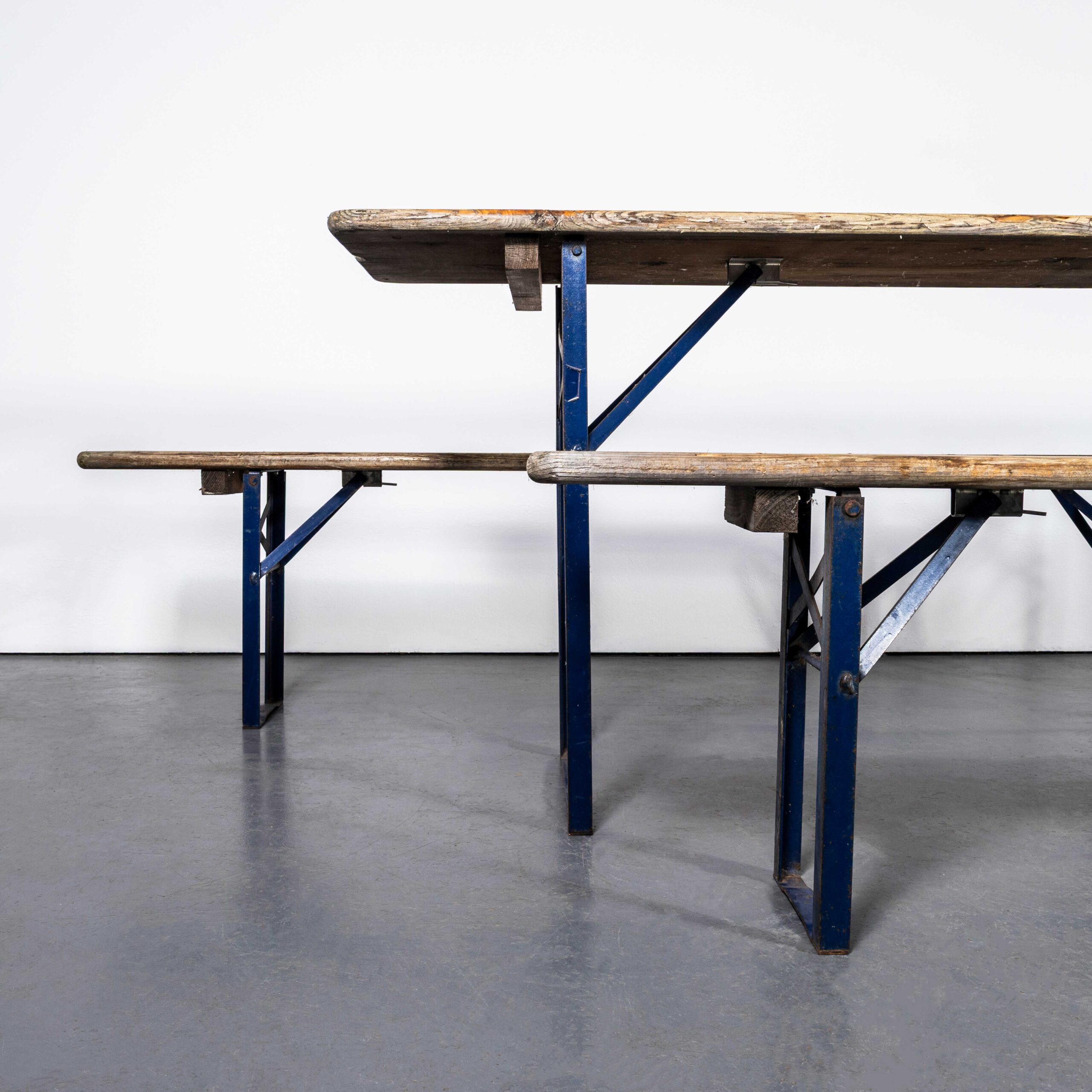 Vintage Duitse, zware, opvouwbare biertafelsets. Dit zijn de klassieke biertafelsets met een tafel en twee banken. We kopen ze rechtstreeks in Duitsland, niet in München, maar in kleinere steden in de regio, waar ze dienst hebben gedaan als werkpaarden op lokale bierfestivals. De onze zijn de echte, zware, in Europa gemaakte en niet geïmporteerde exemplaren. De leeftijd varieert van de jaren 70 tot begin 21e eeuw. We selecteren ze vanwege hun karakter en zware kwaliteit. De aanbieding betreft één set bestaande uit een tafel en twee banken. De tafels zijn gemaakt van zwaar grenen, maar ze zijn niet ontworpen om in de winter buiten in de regen te laten staan. Hoewel ze bestand zijn tegen incidentele buien en intensief gebruik, raden we ze af voor continu buitengebruik.