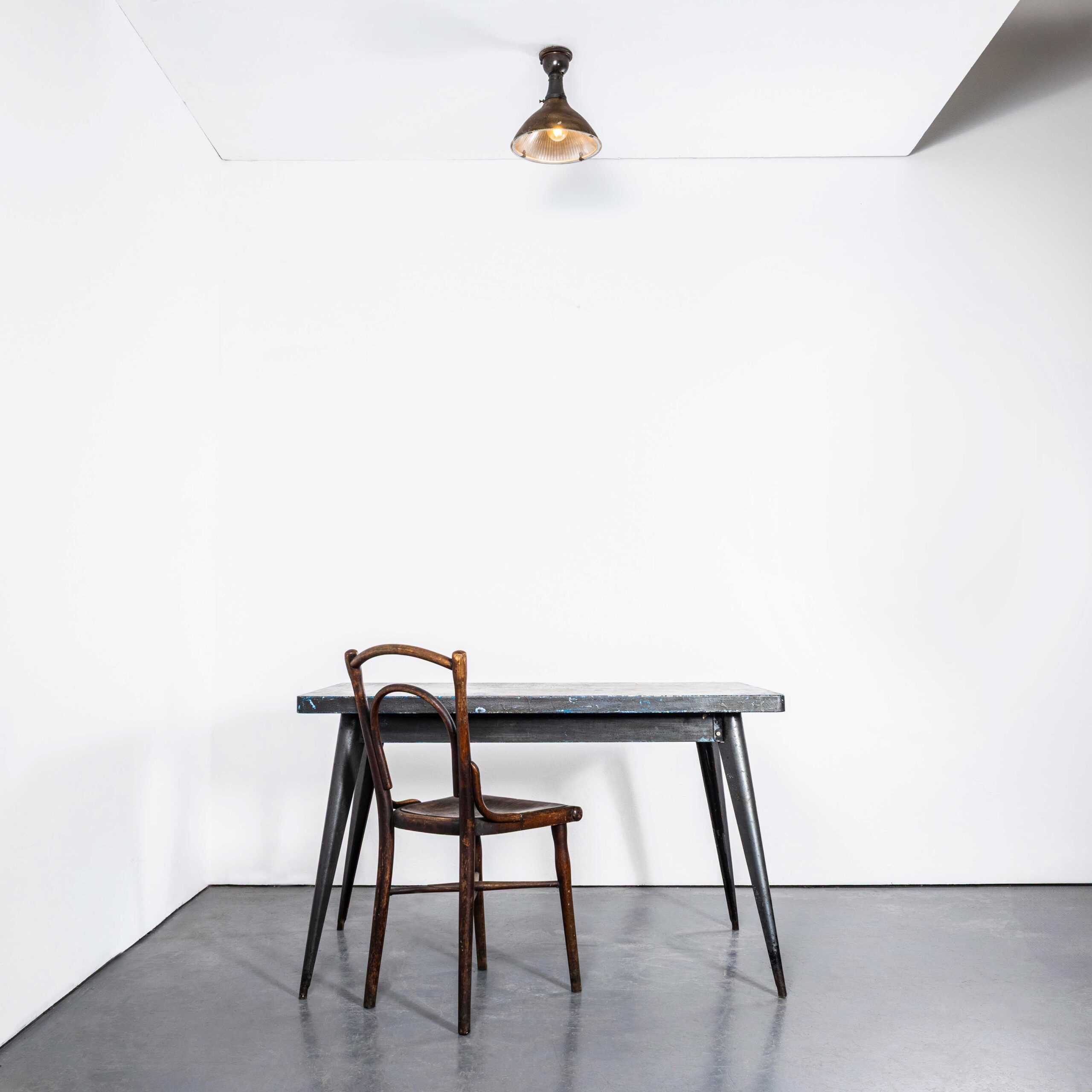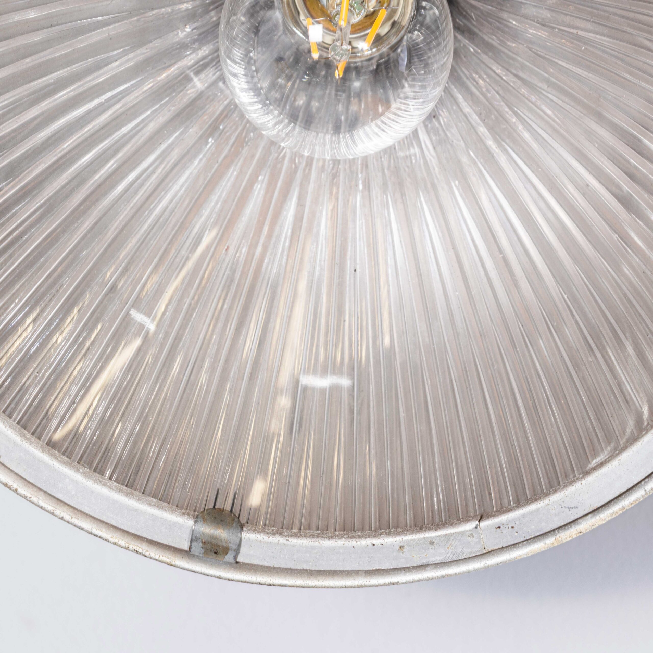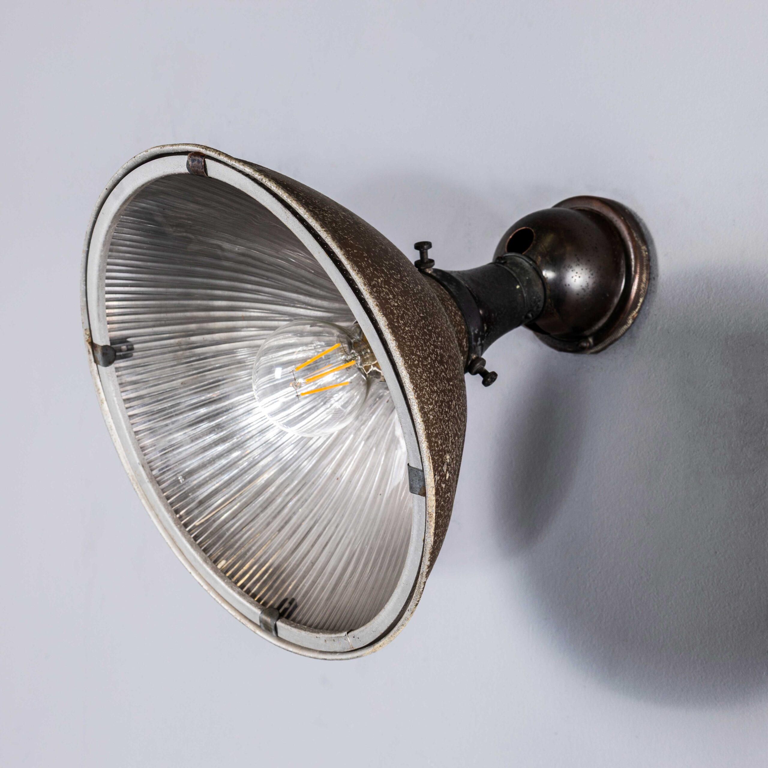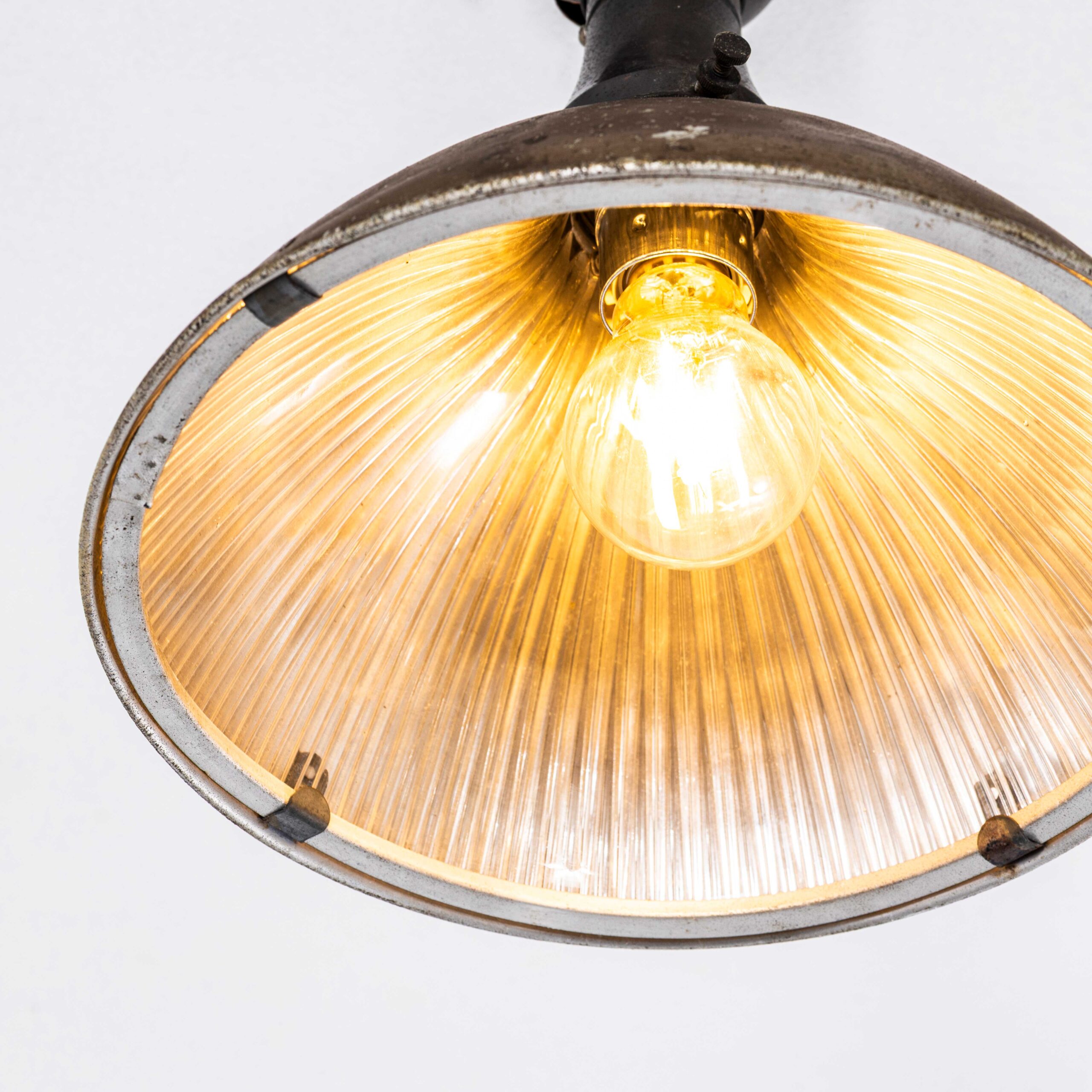 Verstelbare lamp van bronskleurig gesponnen aluminium uit de jaren 40 van Holophane. Holophane werd eind 19e eeuw in Frankrijk opgericht en staat bekend om hun uitvindingen en perfectionering van reflectoren van borosilicaatglas, vaak met ingewikkelde patronen van gegoten glas, die een diffuus en prachtig licht geven. Dit is een eenvoudige, verstelbare Holophane bureaulamp die aan het plafond of de muur kan worden bevestigd. De lamp is gereinigd, gerestaureerd, getest en gelabeld volgens BS EN 60598. De lamp wordt volledig bedraad en klaar voor installatie geleverd. Vanwege het ontwerp van de lamphouder hebben we de originele lamphouder behouden, die in uitstekende staat verkeert. De lamp is voorzien van een standaard E27-fitting met schroefdraad, waarvoor een breed scala aan moderne en vintage filamentlampen verkrijgbaar is. We verkopen momenteel geen gloeilampen en adviseren ledlampen van maximaal 6W. De lamp is momenteel bedraad en gemonteerd volgens de Britse en EU-normen. De lamp kan worden bedraad volgens de Amerikaanse of wereldwijde markt.