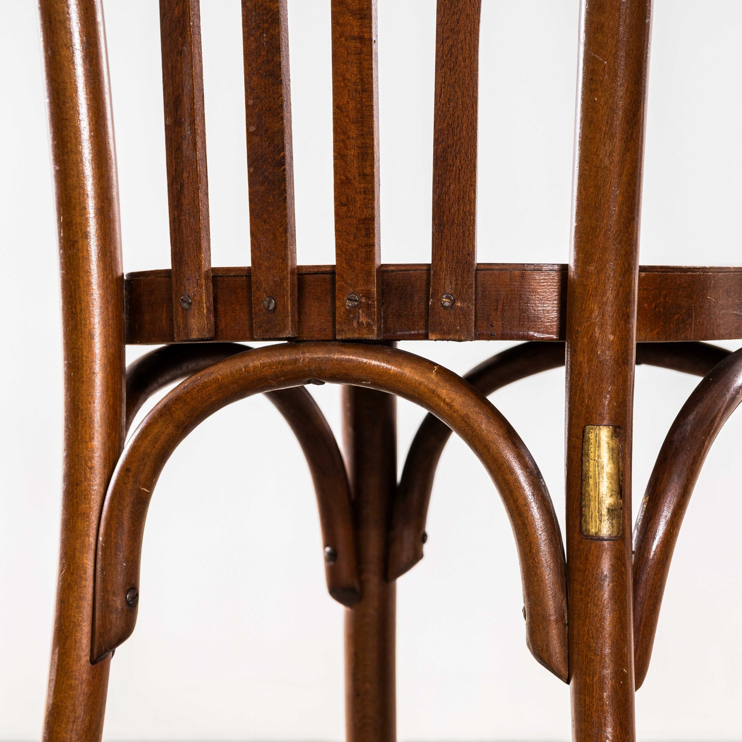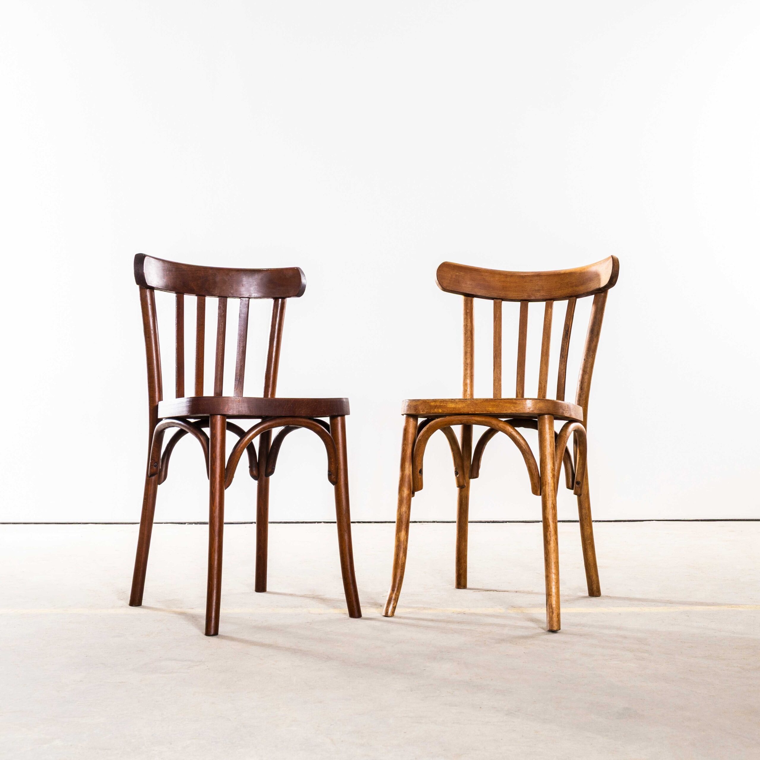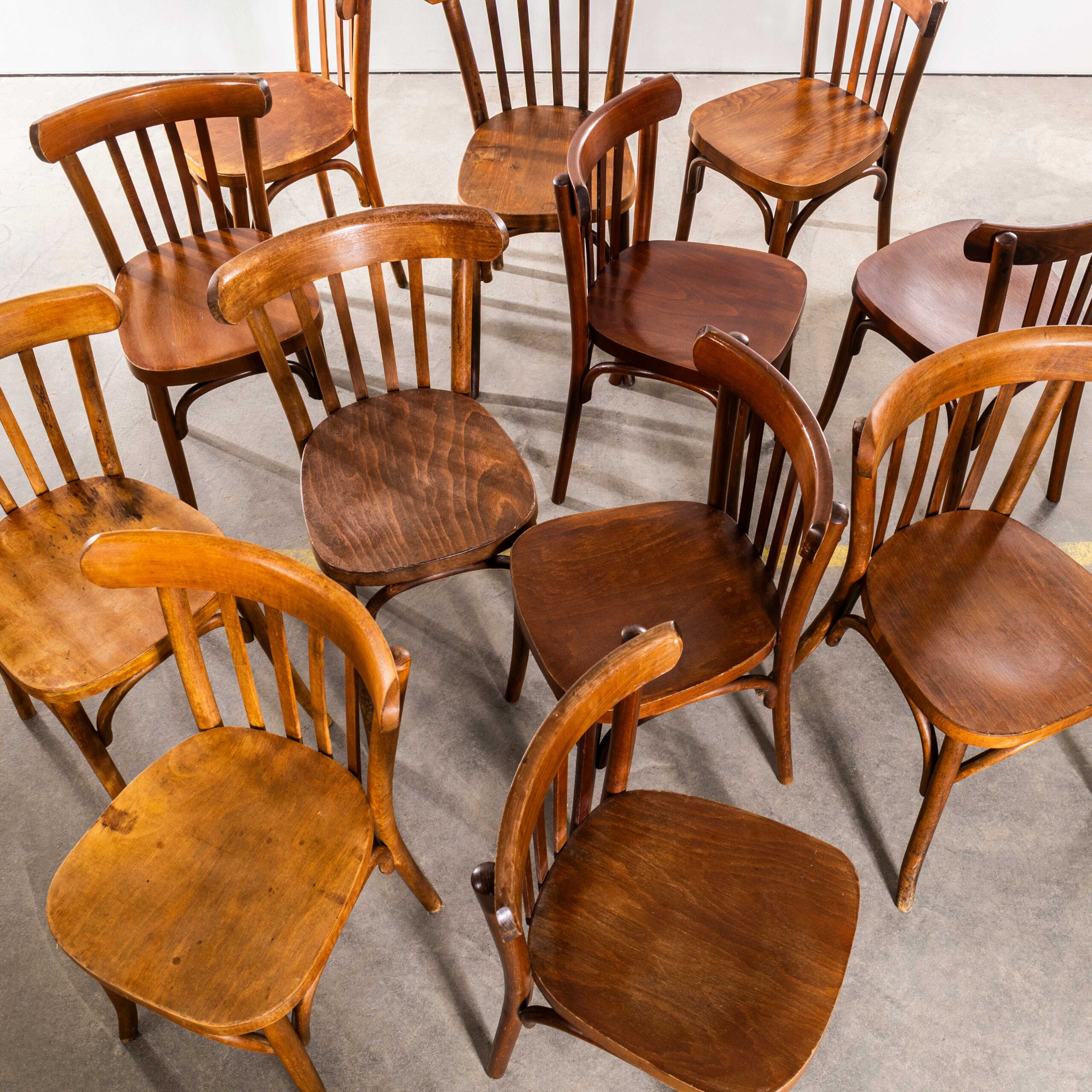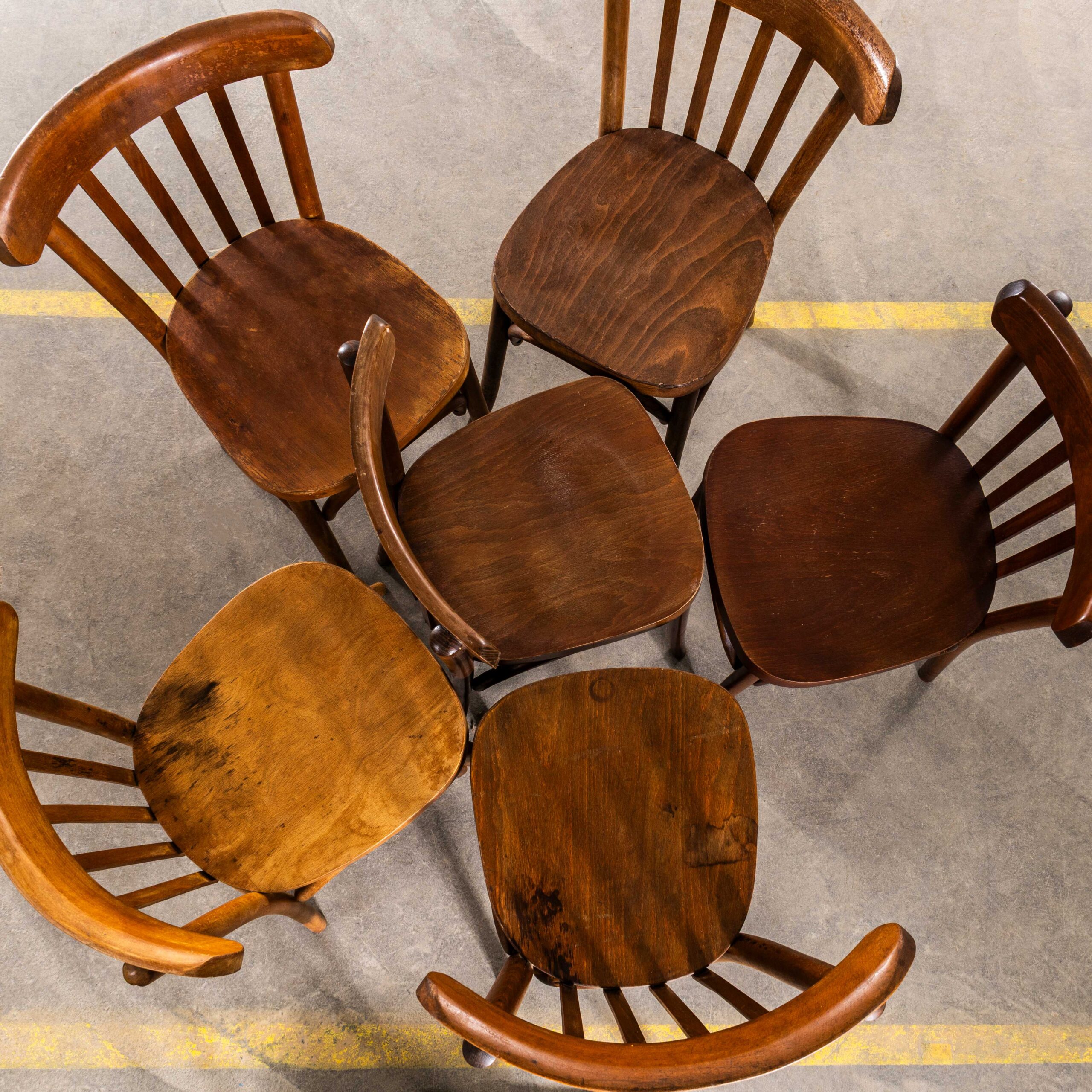 Set van twaalf Luterma Harlequin eetkamerstoelen van honingkleurig eikenhout uit de jaren 50. Het stoombuigen van beukenhout tot elegante stoelen werd ontdekt en ontwikkeld door Thonet, maar toen de patenten in 1869 verliepen, begonnen veel bedrijven, waaronder Luterma, met de productie. Luterma was een van de merken die op de markt werden gebracht door de Estse fabriek AM Luther, die eind 19e eeuw in Tallinn werd opgericht. Luther produceerde voornamelijk in Estland, maar had ook fabrieken in Frankrijk voor de lokale markt. Tijdens de Bauhaus-beweging werkten Walter Gropius en Marcel Breuer samen met de fabriek aan de ontwikkeling van verschillende modellen. Deze stoelen dateren uit de jaren 50, met een eenvoudige, klassieke vorm, een prachtige kleur en elegant gevormde rugleuningen. Hoewel we het niet zeker weten, denken we dat deze gemengde set van Luterma is. We onderhouden en restaureren elke stoel voordat deze onze werkplaats verlaat en leveren stoelen van uitstekende kwaliteit.