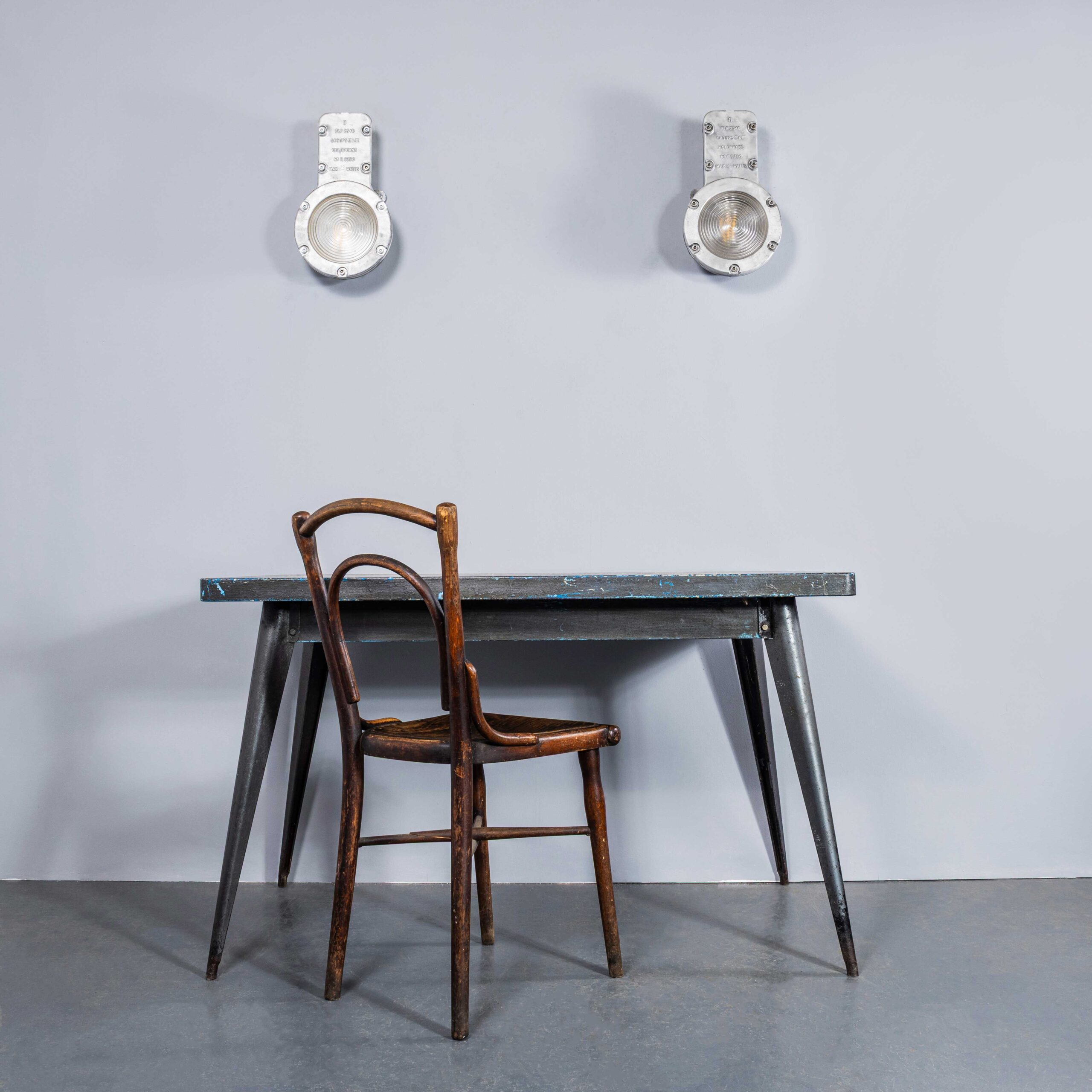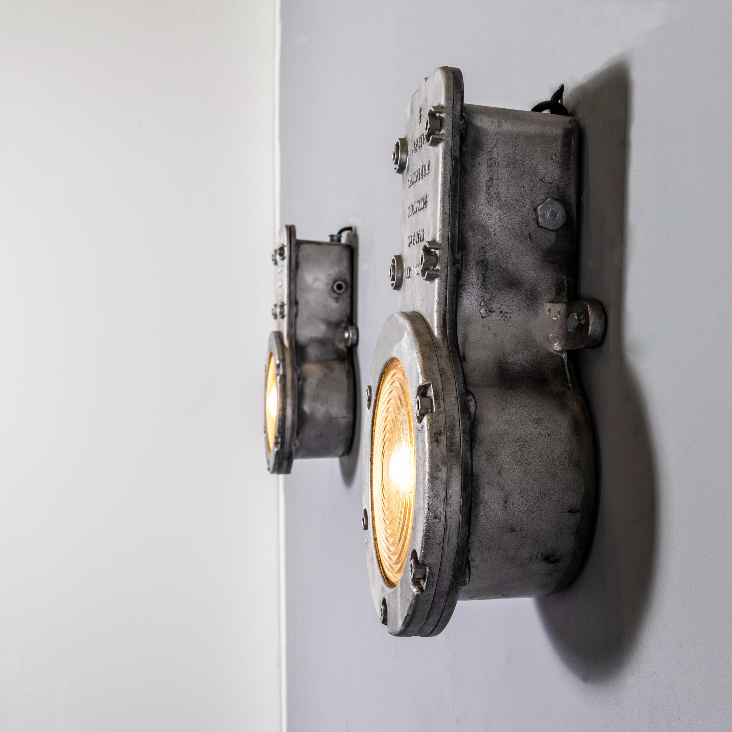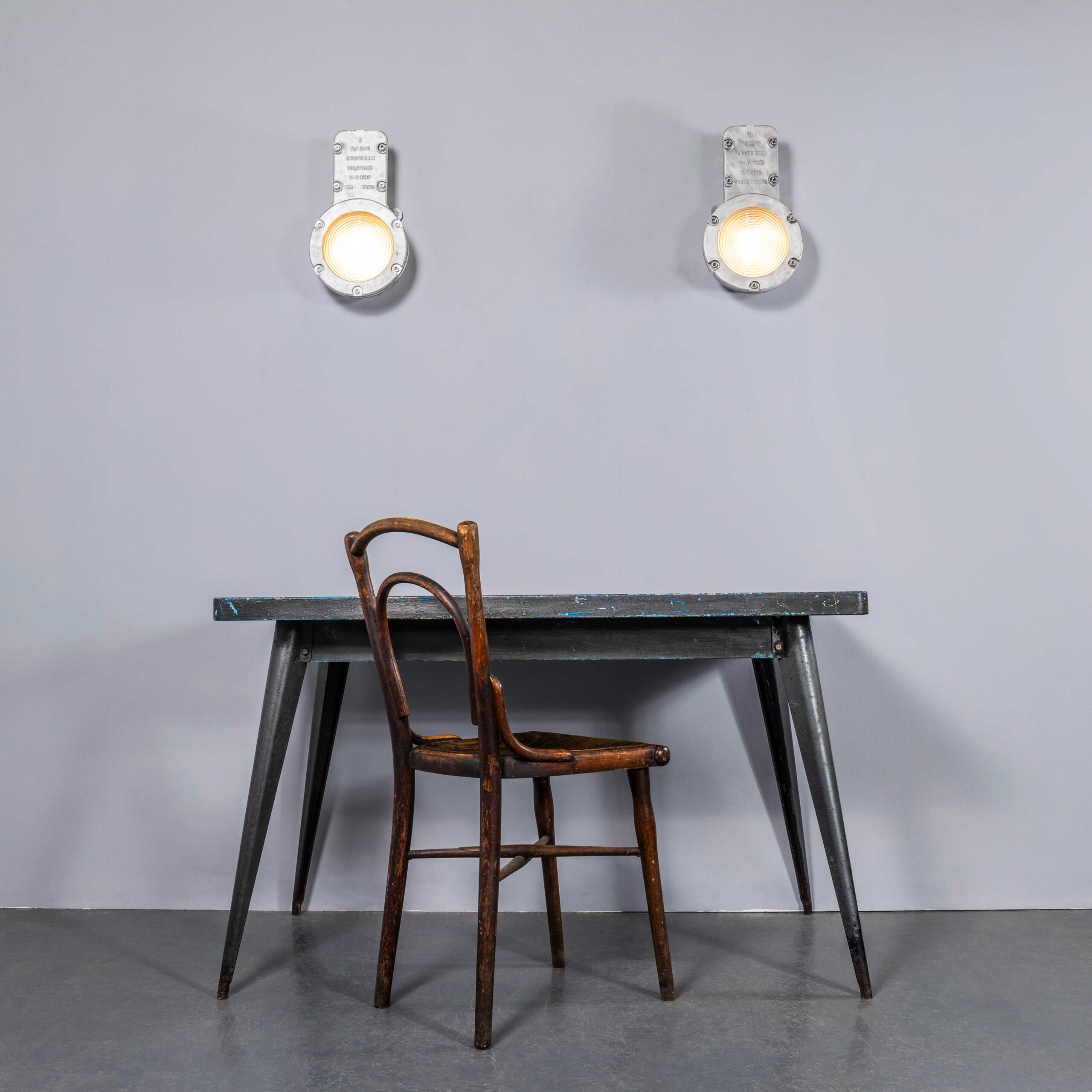 Grote gegoten schotlamp Holophane uit de jaren 50 – paar. Holophane werd eind 19e eeuw opgericht in Engeland en staat bekend om hun uitvindingen en perfectionering van reflectoren van borosilicaatglas, vaak met ingewikkelde gegoten glaspatronen die een diffuus en prachtig licht geven. Ze maakten ook deze extreem zware industriële elektrische armaturen voor energiecentrales, mijnen, boorplatforms en dergelijke. Deze zijn doorgaans ontworpen om grote brand- of explosieschade te overleven, zodat elektrische circuits en verlichting na dergelijke extreme gebeurtenissen kunnen blijven werken. Deze lampen hebben een extreem zware behuizing van gegoten aluminium met gegoten glazen lenzen. De lamp is gereinigd en gerestaureerd en alle elektrische componenten zijn verwijderd en vervangen door moderne Europese CE-standaardcomponenten volgens BS EN 60598. Elke lamp is individueel getest en gelabeld volgens BS EN 60598. Elke lamp wordt volledig bedraad en klaar voor installatie geleverd; de lamp is opbouwmontage. De lamp is voorzien van een standaard E27-fitting met schroefdraad, waarvoor een breed scala aan moderne en vintage gloeilampen verkrijgbaar is. We verkopen momenteel geen gloeilampen en raden ledlampen van maximaal 6W aan. We zijn gespecialiseerd in het opknappen van vintage verlichting. Neem contact met ons op voor vragen over aankoop of installatie. De lamp kan worden aangesloten op de Amerikaanse of wereldwijde markt. De aanbieding geldt voor beide lampen.
