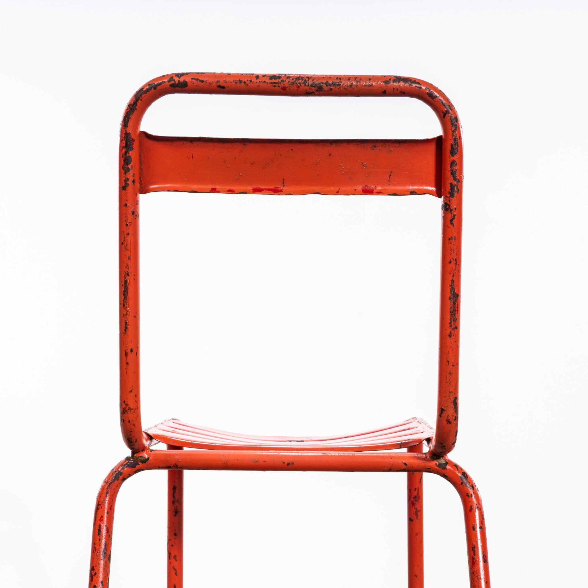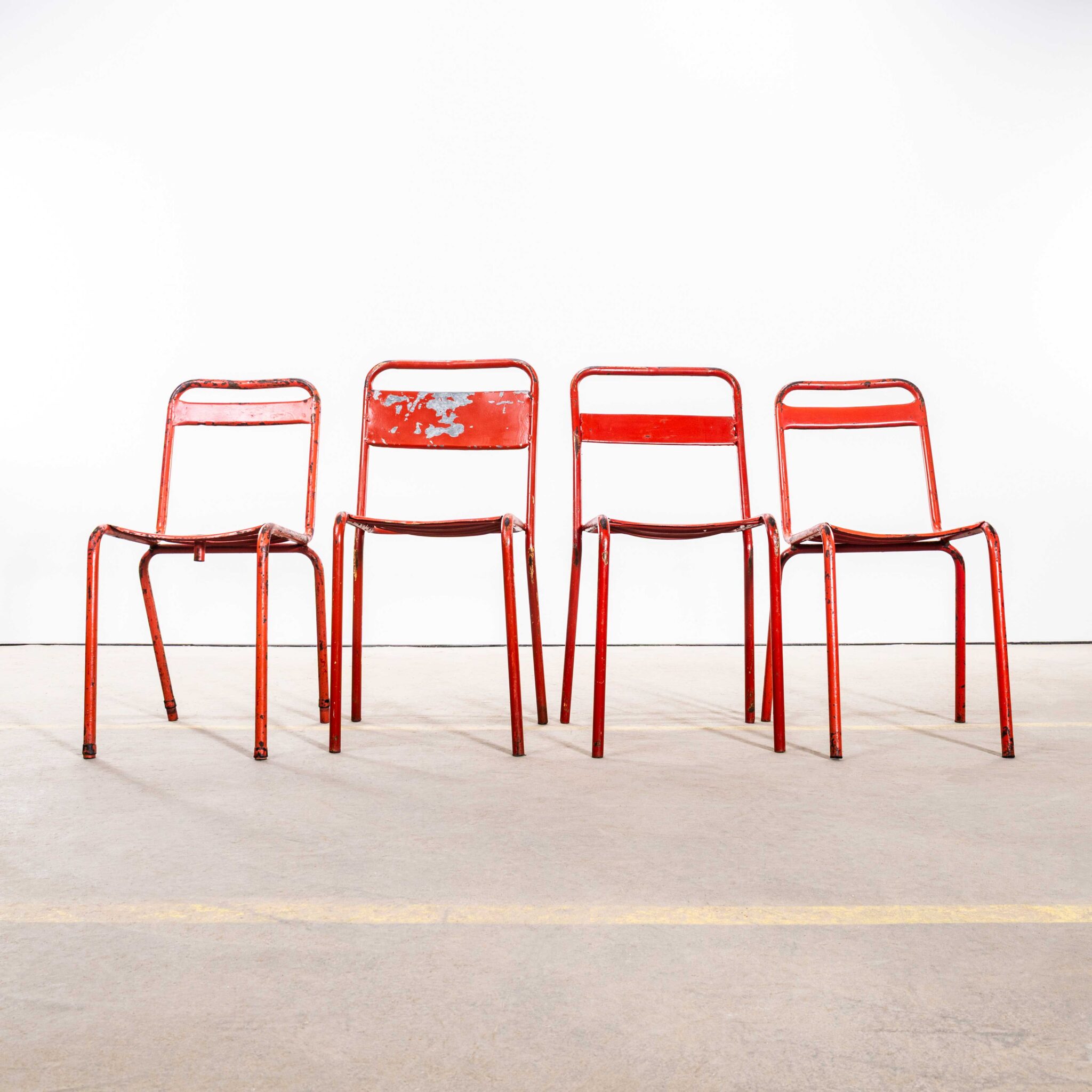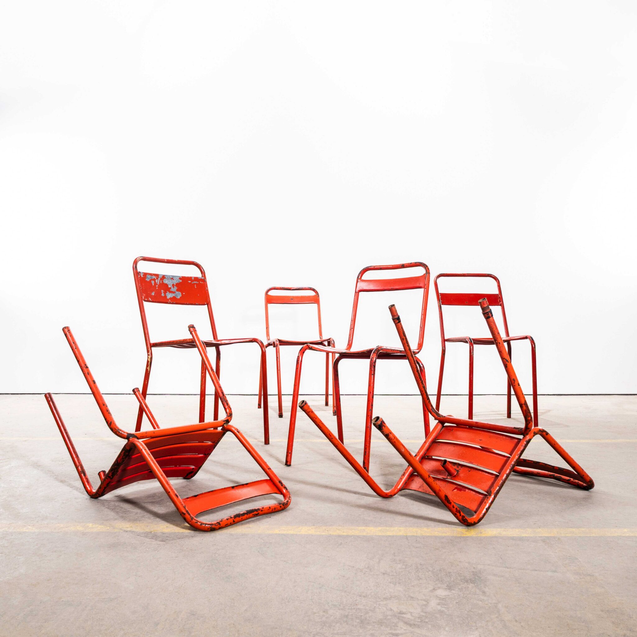 1950’s Original T1 French Outdoor Chairs By Tolix – Set Of Six. Tolix is one of our all time favourite companies. In 1907 Frenchman Xavier Pauchard discovered that he could protect sheet metal from rusting by dipping it in molten zinc (galvanisation) and a few years later he set up his factory producing steel furniture. Tolix was the creator and founder of perhaps the most iconic café chair of all time, the Tolix model A. This listing is for the T1, a set of six in good condition with their original red paint. The T1 came in various iterations with different details, this is a mismatched set. Our workshop cleans and rejuvenates each chair before it leaves us.
