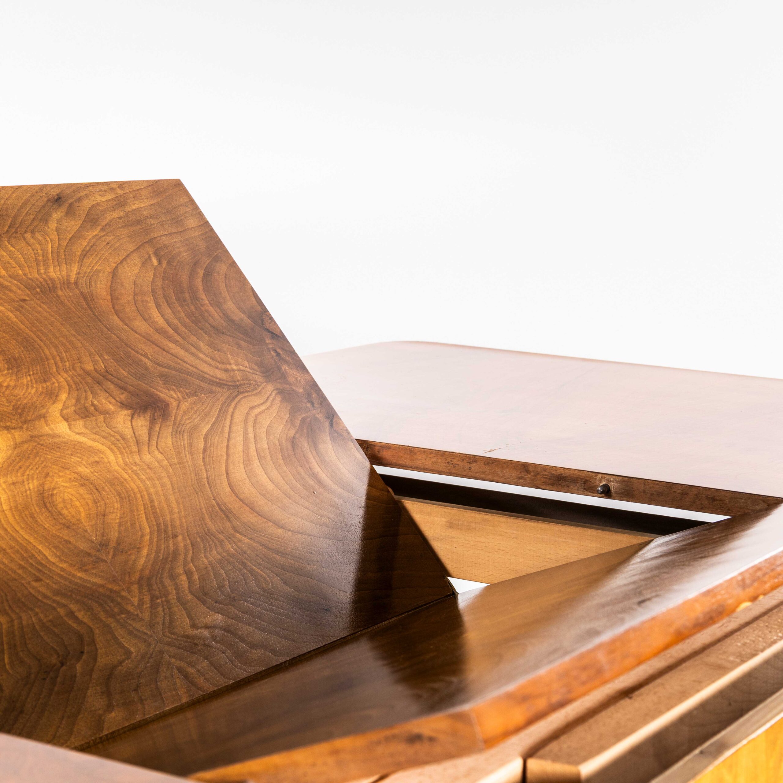 Rechthoekige uitschuifbare Halabala eettafel uit de jaren 50 – Up Zavody. Een prachtig, praktisch meubelstuk uit het midden van de vorige eeuw van de Tsjechische fabrikant Up Zavody en ontwerper Jindrich Halabala. Halabala, rechtstreeks afkomstig uit Tsjechië, was een Tsjechisch industrieel ontwerper, schrijver en docent. Halabala speelde een belangrijke rol in de ontwikkeling van naoorlogs industrieel geproduceerd Europees meubilair. Czech was een grote producent van hoogwaardig meubilair uit het midden van de vorige eeuw, volgend op de opkomst van het modernisme, ontstaan door de Bauhaus-school. De tafel is voornamelijk gemaakt van berkenhout, de poten zijn massief en sterk en het blad heeft een rijk berkenkarakter. De tafel kan worden uitgeschoven van 120 cm tot 190 cm met een eenvoudig mechanisme, waarbij het middelste blad netjes onder het tafelblad wordt opgeborgen. Let op: de kleur van het uitschuifbare blad is origineel en iets donkerder omdat het werd opgeslagen en beschermd tegen zonlicht. Onze werkplaats heeft de tafel gereinigd en onderhouden; hij is sterk, stabiel en klaar voor gebruik. Lengte van de uitgeschoven tafel: 190 cm. Knieruimte: 66 cm.