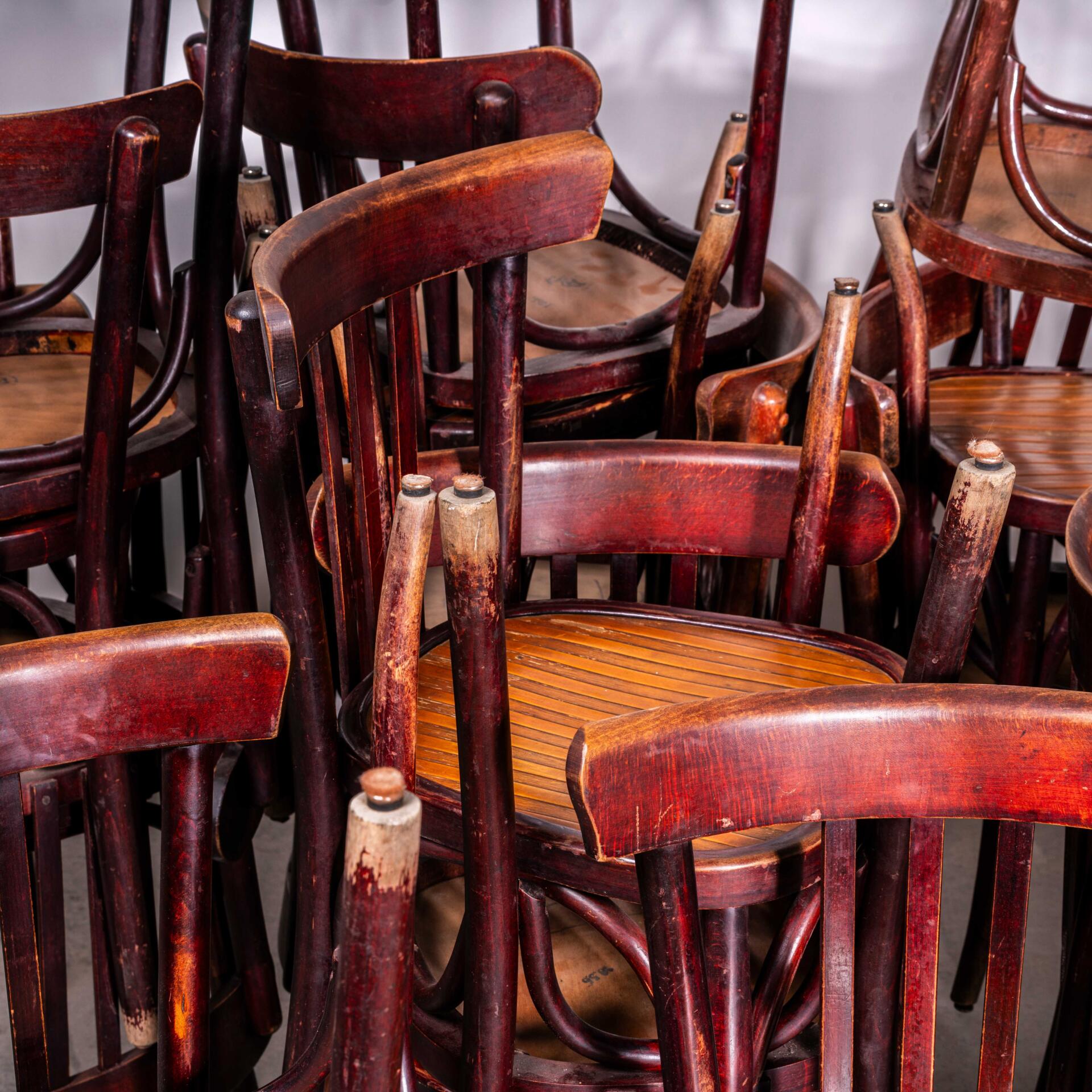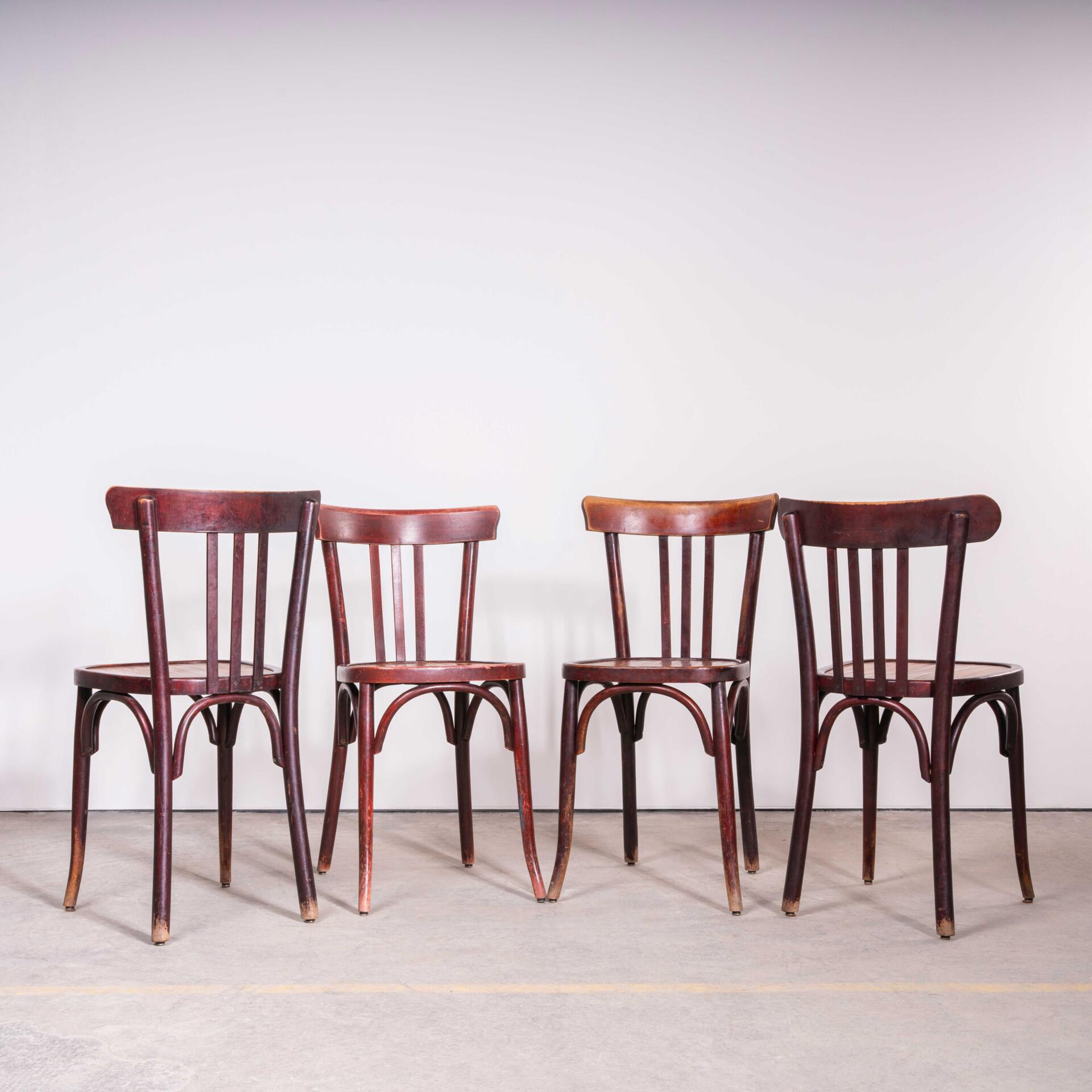 Drie-slatten tweekleurige gebogen houten eetkamerstoelen uit de jaren 950. Klassieke bistrostoelen, gemaakt in Frankrijk door Baumann. Baumann-stoelen zijn relatief onbekend en beginnen de aandacht te trekken die ze verdienen. Ze zijn prachtig ontworpen en vervaardigd, maar ze zijn nu zo moeilijk te vinden. Deze midden eikenhouten stoelen zijn elegant en comfortabel, met een prachtig rijk karakter en kleur en tweekleurige gestempelde zittingen. We onderhouden en waxen onze stoelen voordat ze onze werkplaats verlaten en leveren stoelen van uitstekende kwaliteit. Zithoogte: 48 cm
