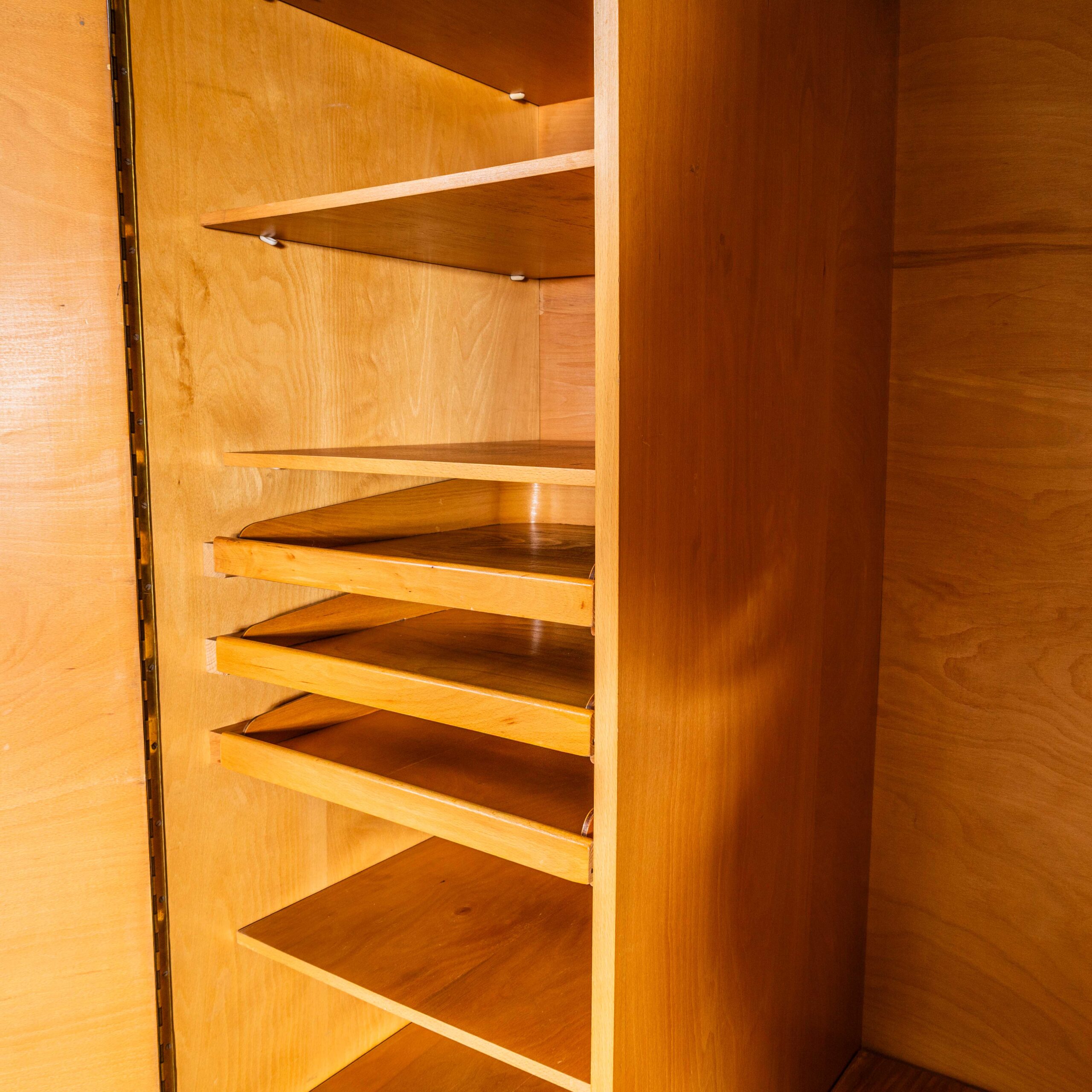 Kledingkast uit de jaren 70 in donker walnoothout, mid-century stijl. Een prachtig en praktisch meubelstuk uit het midden van de vorige eeuw, vervaardigd door de Tsjechische fabrikant Up Zavody. Tsjechië was een grote producent van hoogwaardige meubels uit het midden van de vorige eeuw, in de nasleep van de modernistische stroming die was ontstaan vanuit de Bauhaus-school. De binnenkant van de kast is voorzien van goed verdeelde vaste planken en drie uittrekbare lades. De kast zelf is gemaakt van fraai getekend sapelehout met een contrasterende berkenhouten binnenkant. De gehele kast is prachtig afgewerkt en staat op originele poten. Onze werkplaats heeft de kast zorgvuldig gerestaureerd, waardoor alle lades en deuren soepel lopen en de kast zich in uitzonderlijk goede originele staat bevindt.