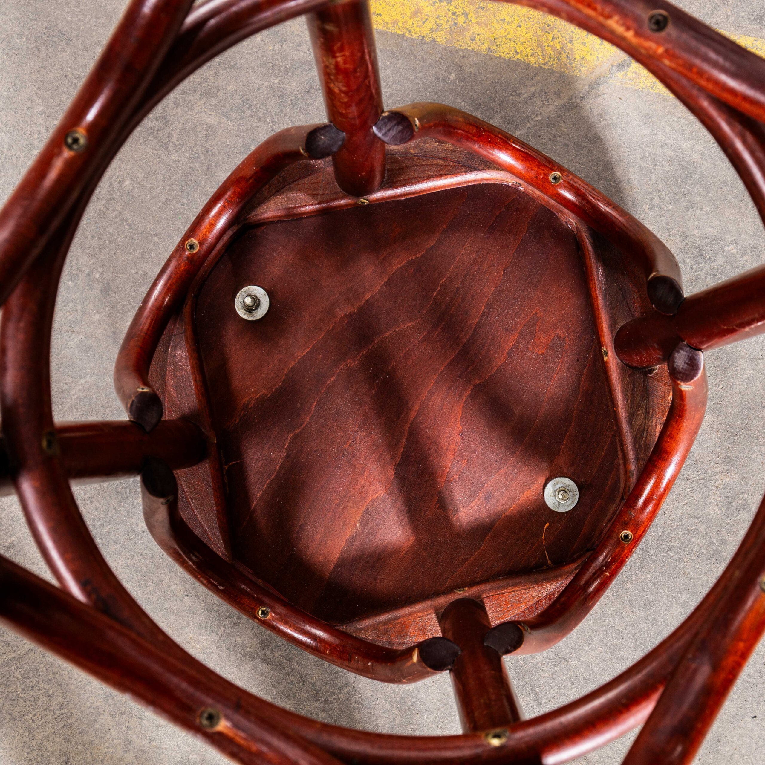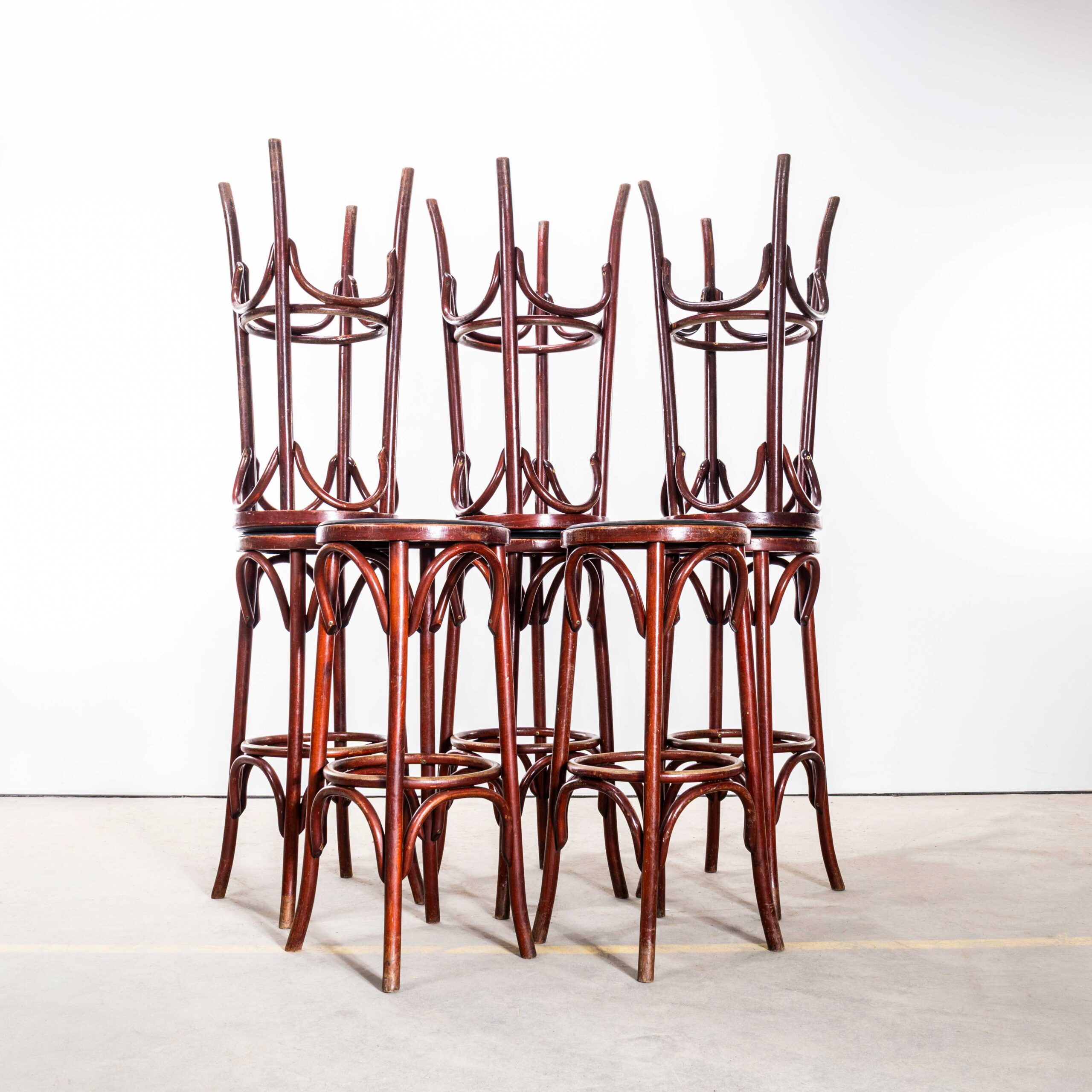 Set van acht hoge, geëboniseerde barkrukken uit de jaren 70. Een kwalitatief goede partij klassieke gebogen houten barkrukken met een geëboniseerde afwerking. De krukken zijn gemaakt in Oost-Europa van massief, stoomgebogen beukenhout en verkeren in uitstekende staat. De originele zwarte bekleding is nog aanwezig en de krukken zijn over het algemeen in goede conditie. Er zijn echter enkele kleine variaties in de staat van de bekleding en we hebben ons best gedaan om alle gebruikssporen op de foto's weer te geven. Elke kruk wordt individueel onderhouden in onze eigen werkplaatsen.