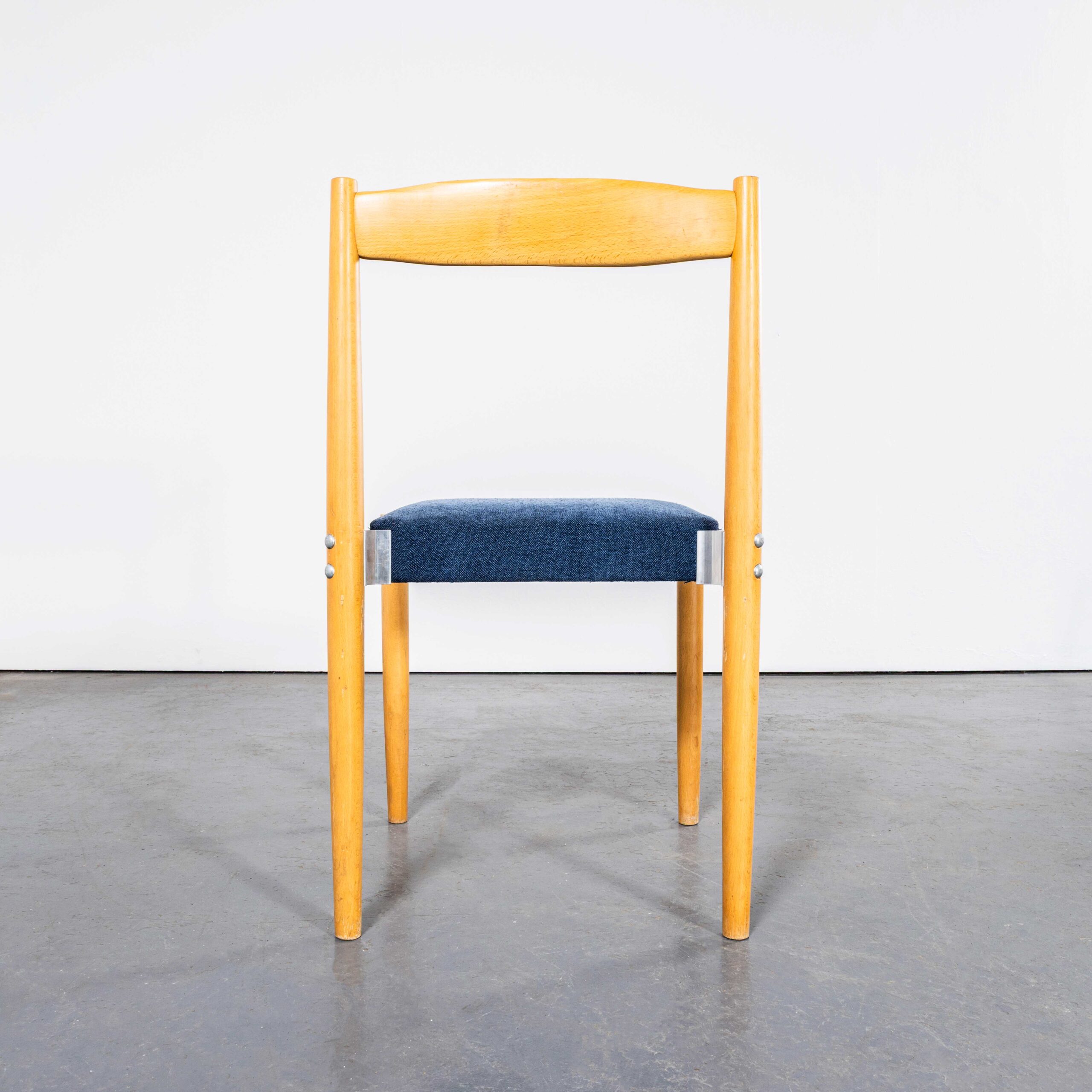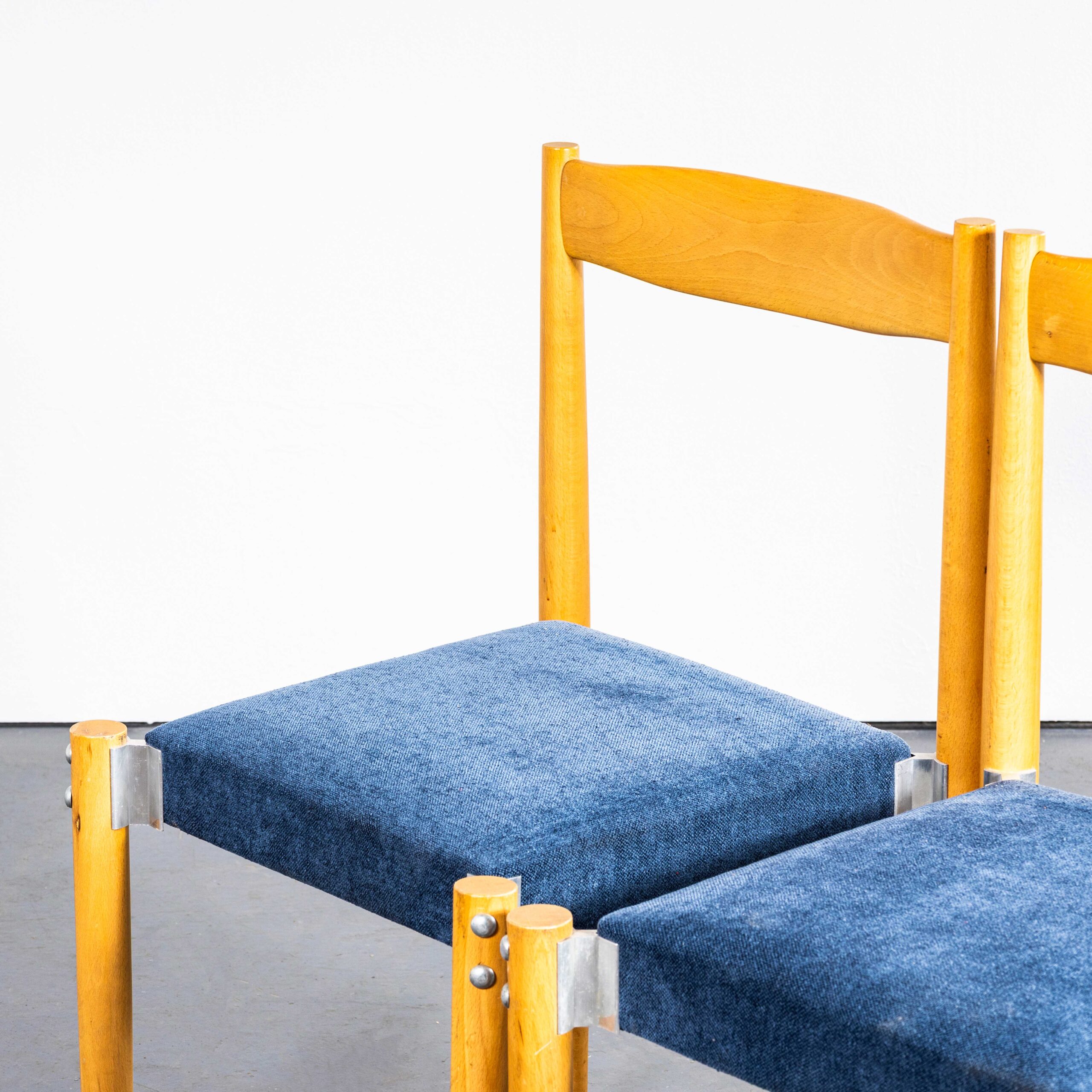 Set van vier blauwe, gestoffeerde eetkamerstoelen uit de jaren 80. Een degelijke set gestoffeerde, strakke, moderne stoelen. Helaas weten we de fabrikant niet, hoewel we vermoeden dat het Ton uit Tsjechië is. De frames zijn gemaakt van massief beukenhout met stijlvolle metalen details. De bekleding is origineel. Vanwege de Britse brandveiligheidsvoorschriften mogen deze stoelen niet in het Verenigd Koninkrijk worden verkocht zonder herstoffering. Ons werkplaatsteam kan de stoelen naar wens herstofferen.
