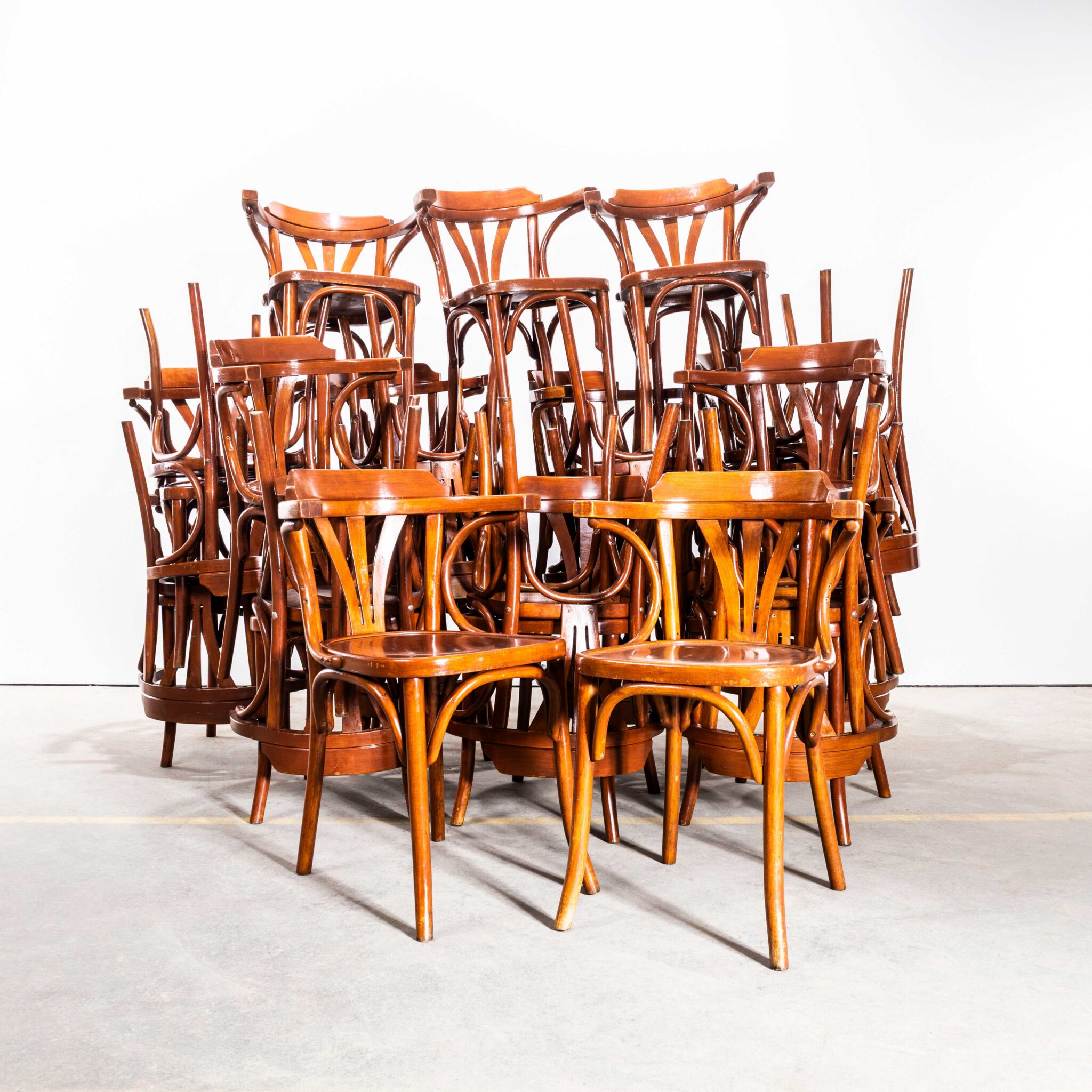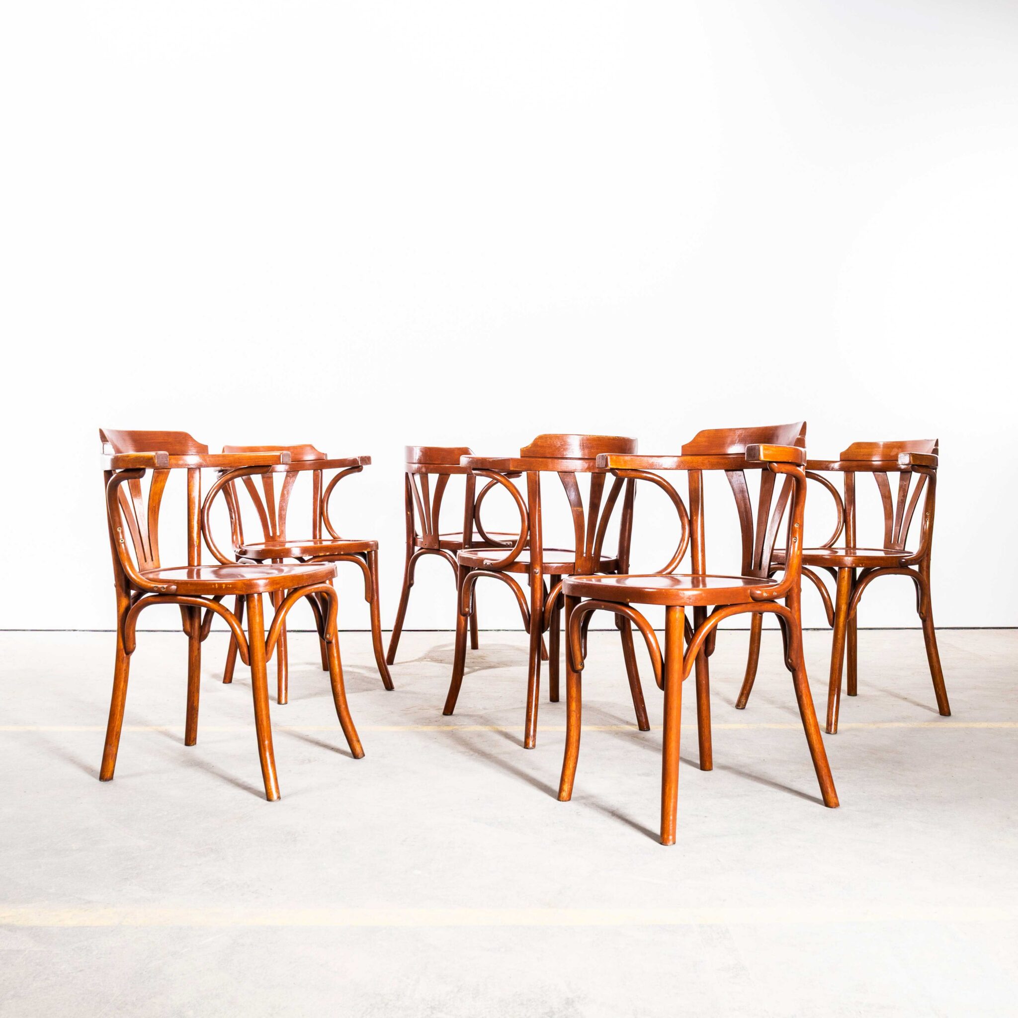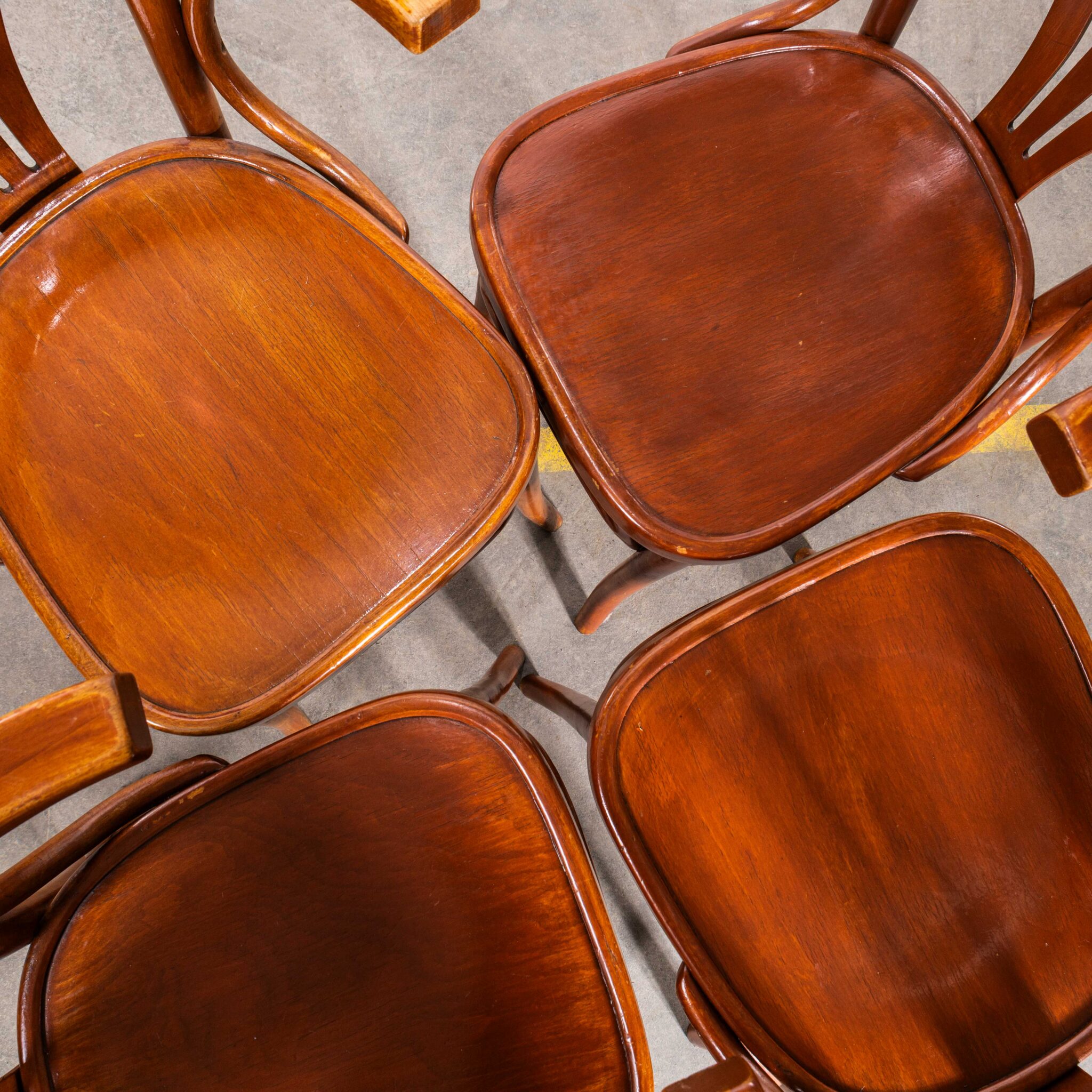 Armstoelen uit de jaren 80 in een warme oranje tint met drie spaken en een waaiervormige rugleuning. Hoogwaardige, klassieke fauteuils van gebogen hout met een typische waaiervormige rugleuning in een heldere, warme oranje/rijke eikenkleur. De stoelen zijn gemaakt in Hongarije door het bedrijf Sellaton, dat in 1907 werd opgericht en nog steeds bestaat. Ze gebruiken massief beukenhout en stoombuigen om die iconische gebogen houtlook te creëren. Het zijn zware, robuuste stoelen met een mooie gebruikssporen en een authentieke uitstraling. Onze werkplaats heeft elke stoel onderhouden en ze zijn klaar voor gebruik.