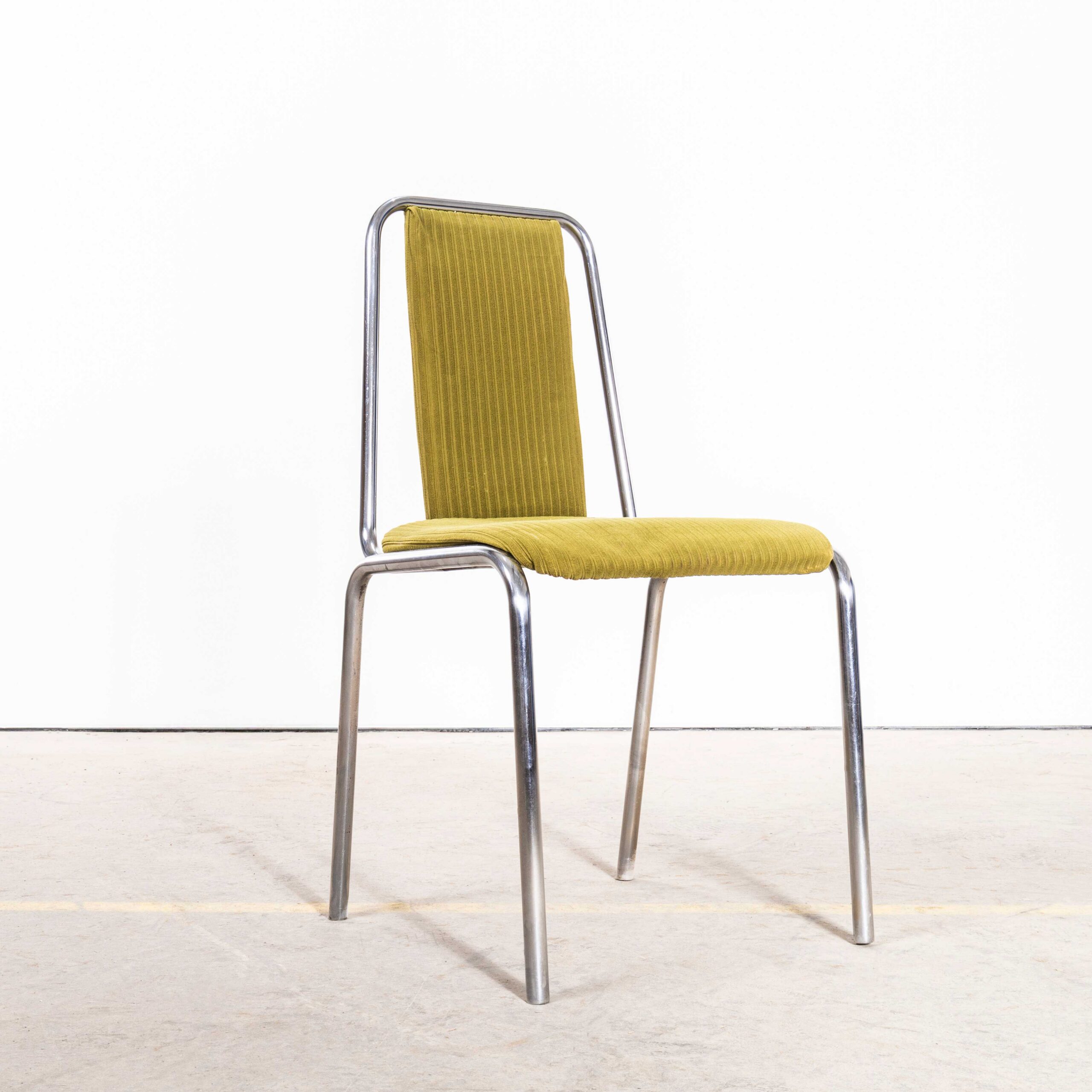 Set van acht olijfgroene, gestoffeerde stapelbare eetkamerstoelen met chromen frame uit de jaren 80. Geproduceerd eind jaren tachtig door Kovovyroba in Litoměřice, Tsjechië, maar met een stijl die typisch is voor het midden van de jaren zeventig. De stalen frames zijn van goede kwaliteit en verchroomd, maar vertonen enige slijtage aan de afwerking. De bekleding is origineel groen corduroy met een onregelmatige streep. Vanwege de Britse brandveiligheidsvoorschriften mogen deze stoelen niet in het Verenigd Koninkrijk worden verkocht, tenzij ze opnieuw gestoffeerd worden, wat in onze werkplaats mogelijk is.