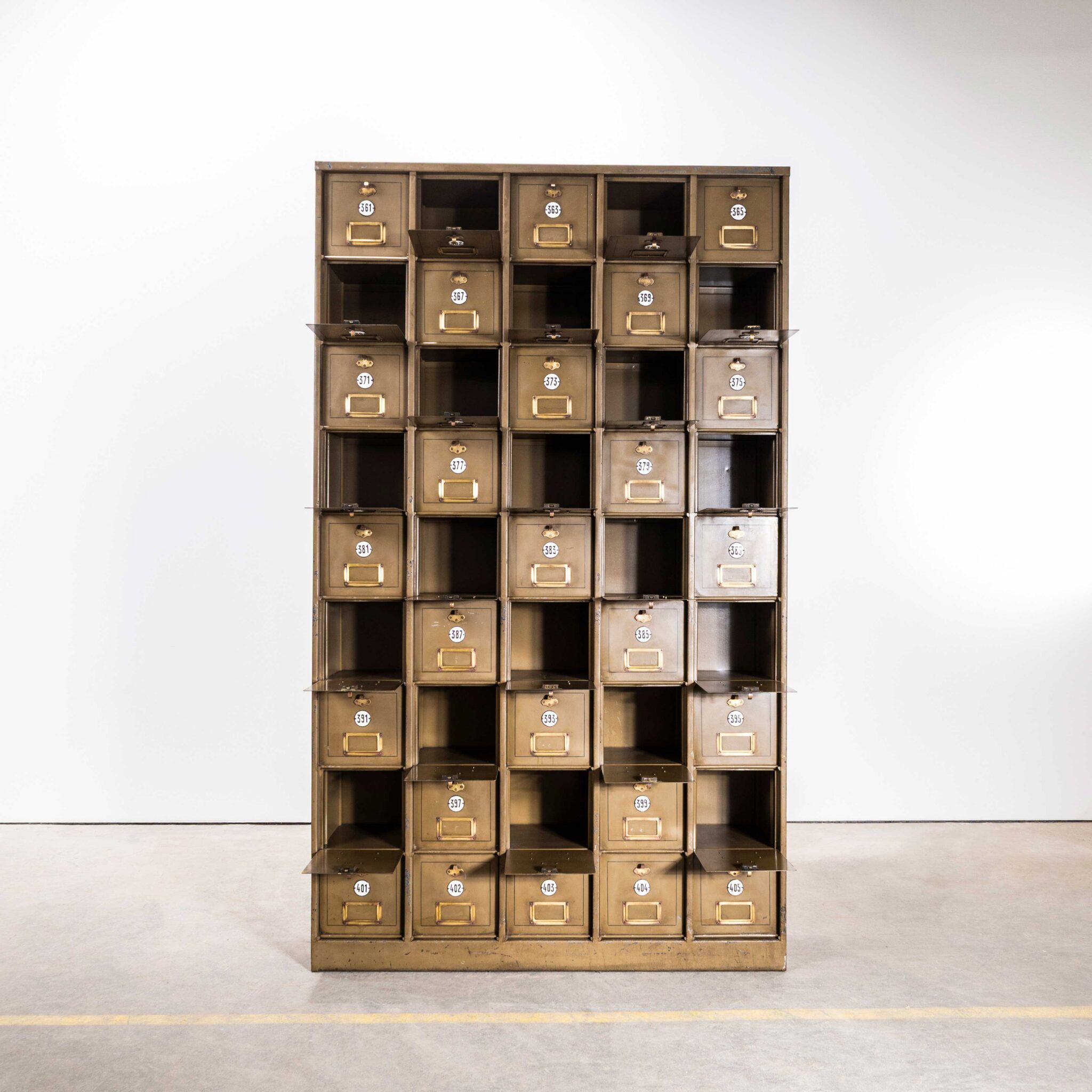 1920’s Original French Industrial Metal Cabinet – Forty Five Klappets. Beautifully made very heavy weight sheet metal filing cabinet, with forty five hinged ‘klappet’ compartments. The compartments are the perfect size for letters and small documents, the front panel simply pulls down with a light pull and clicks back into location. The cabinet was originally from the offices of a large French company where they were used for document storage. This cabinet is completely original with the original bronze finish, complete with subtle pin stripe detail. The most stunning feature of the cabinet is the complete set of original hardware, nameplates, pull handles and the enamel numbers. Reminiscent of Strafor but not marked in any way.