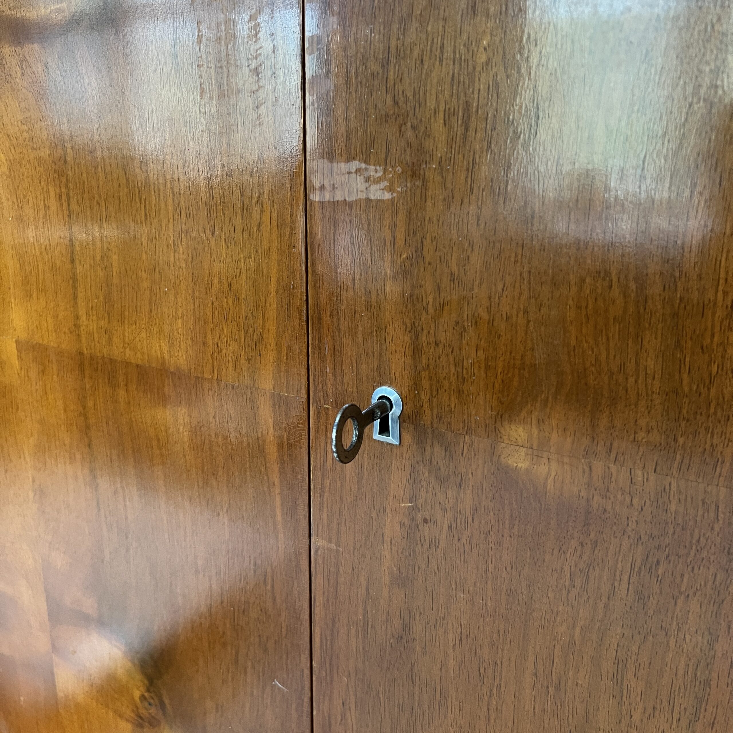 1930’s Warm Figured Walnut Wardrobe. This is a beautiful large practical 1930’s cabinet. There are two solid curved doors that reveal a large hanging space. There is a clothes rail near the top that spans the width of the wardrobe, perfect for long coats and dresses. Our workshop has gently restored the cabinet and the cabinet is in exceptional original condition and comes with the original key.