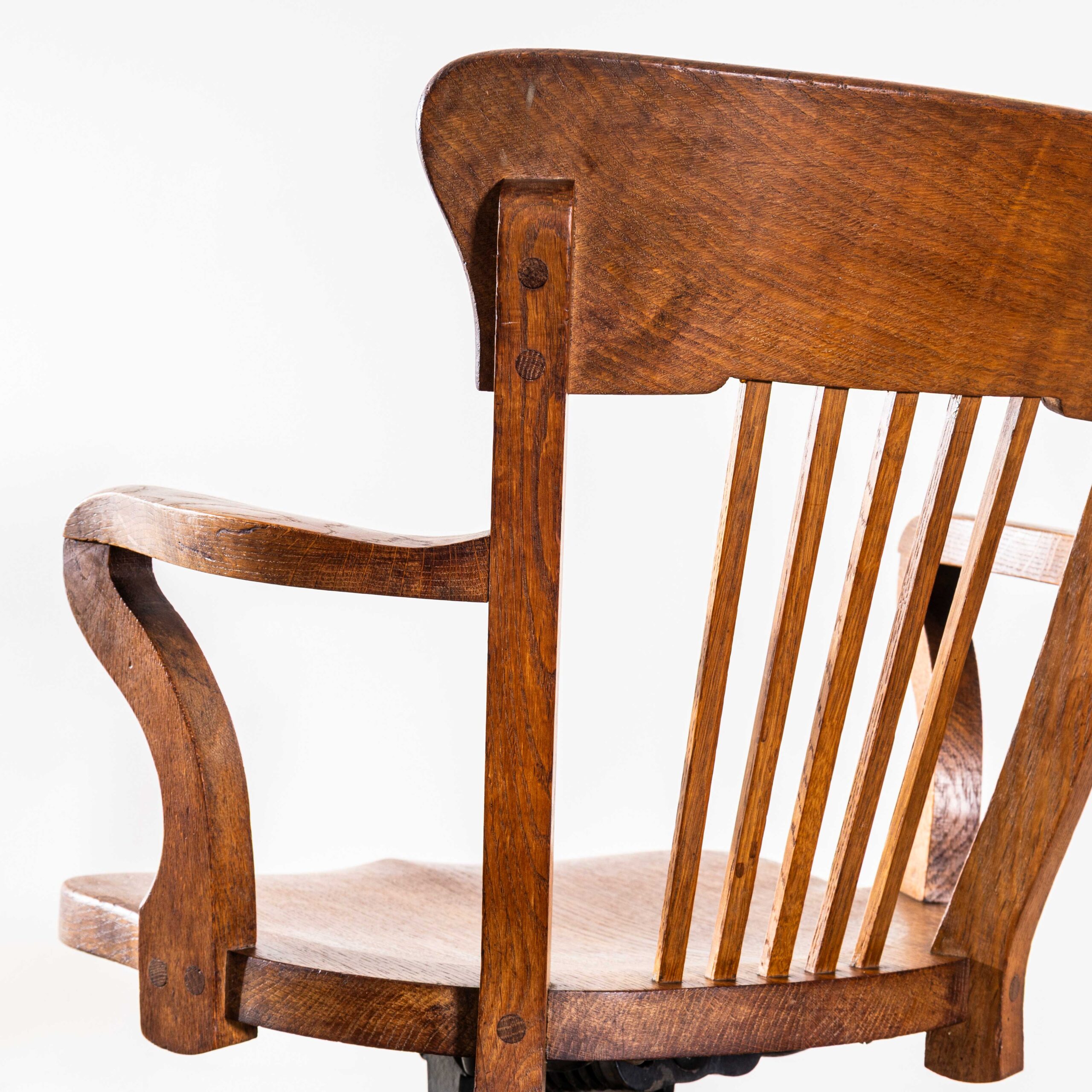 1950’s Cast Base American Oak Swivel Desk Chair. Sadly we don’t know the history but we know this is a high quality American made desk chair. The mechanism is very solid and well made, the wheel sets the resistance required to tilt the entire seat. The seat is superbly made in solid oak. Great colour and character. The chair has been serviced and cleaned in our workshop and the mechanism is in full working order and running smoothly.